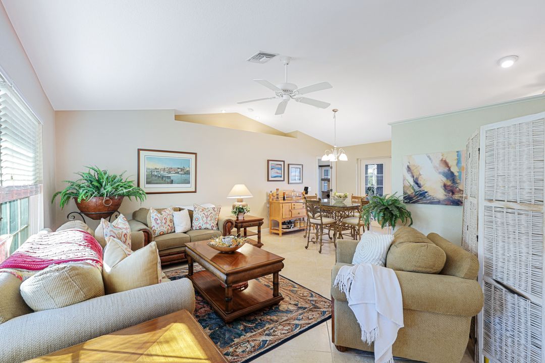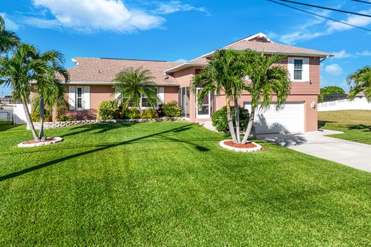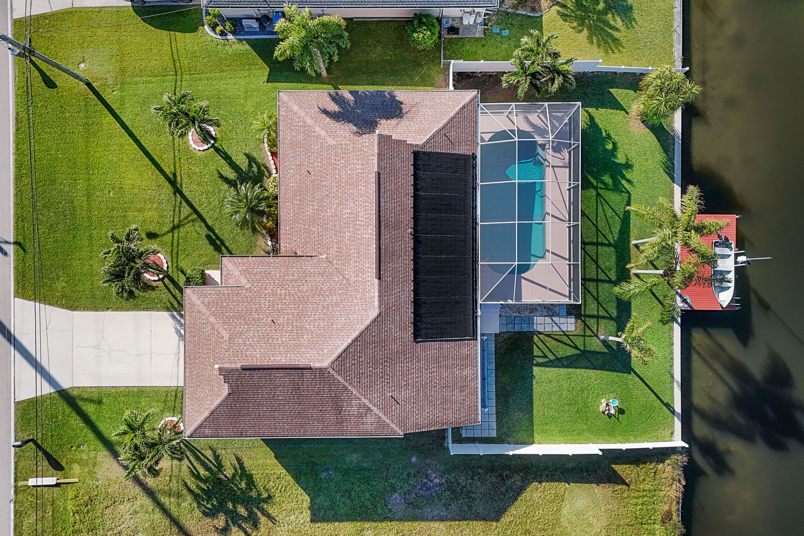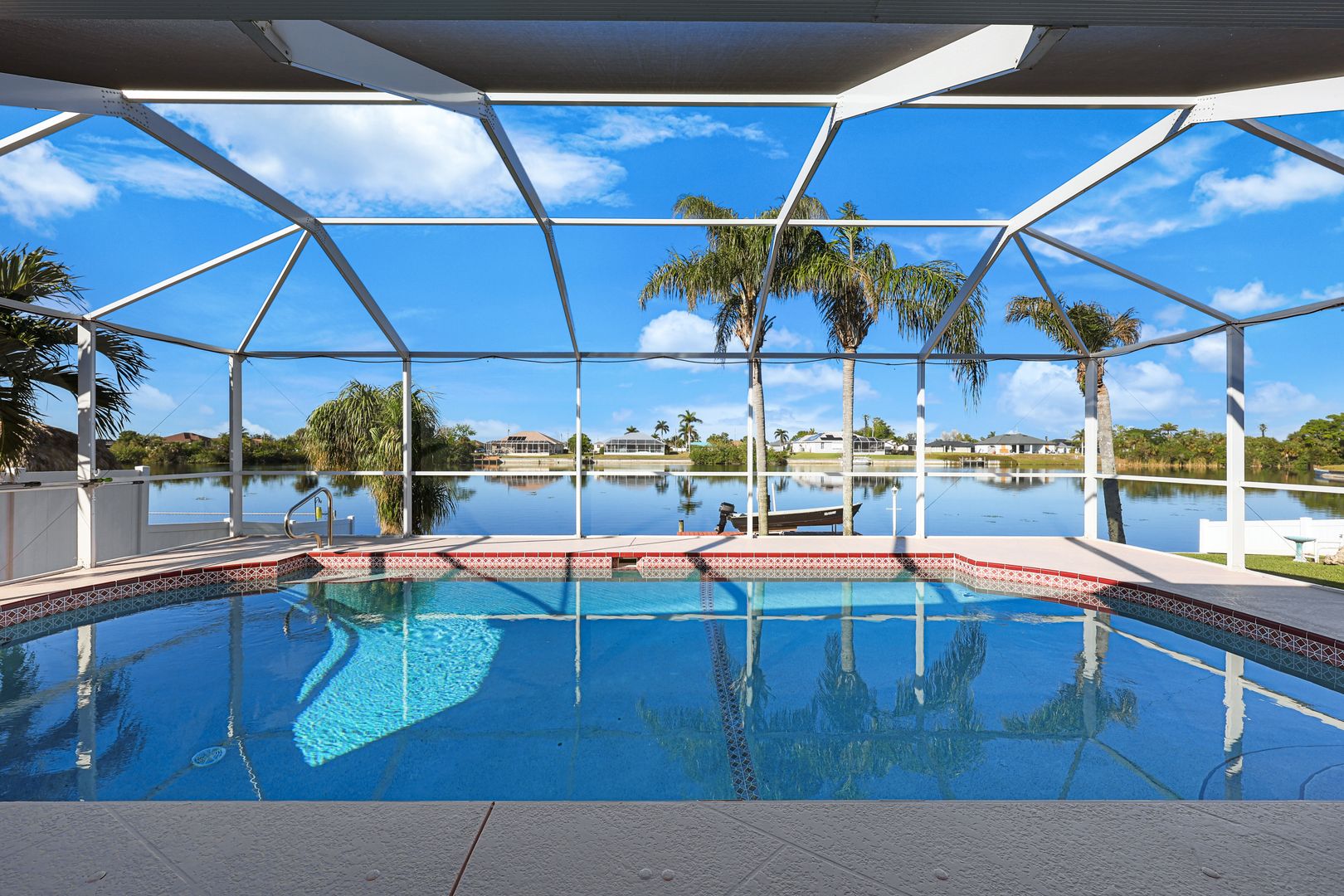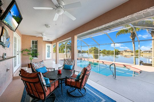 STUNNING 4 BEDROOM LAKEVIEW HOME WITH SOLAR HEATED POOL AND SUNSET VIEWS!!! Discover this immaculate 2-story, 4-bedroom, 2.5-bathroom home with a 2-car oversized garage and fresh exterior paint, offering unparalleled lake views on a peaceful freshwater canal system. Boasting western exposure and over 400 feet of water views, this home delivers breathtaking Florida sunsets right from your screened-in lanai. Step inside to find soaring vaulted ceilings and an inviting floor plan. Tile flooring runs throughout the home, with plush carpet in two guest bedrooms. The kitchen is a chef's delight, featuring granite countertops, wood shaker cabinets, and stainless steel appliances. Enjoy the solar-heated pool with ample storage space, perfect for entertaining. The lanai is equipped with electric Storm Smart shutters, while hurricane-impact windows add peace of mind throughout the rest of the home. Recent upgrades include a new AC system (2019), a roof replacement (2021), and a privacy fence (2022). The oversized garage and entryway are finished with durable epoxy flooring. Outside, relax on your wood dock, complete with a 14-foot aluminum boat. Enjoy the convenience of being close to shopping, dining, entertainment, and beautiful white sandy beaches. Whether you’re taking in the serene water views, reveling in stunning sunsets, boating, jet skiing, or fishing, this home offers the ultimate Florida lifestyle. Schedule your private showing today and make this waterfront paradise yours!