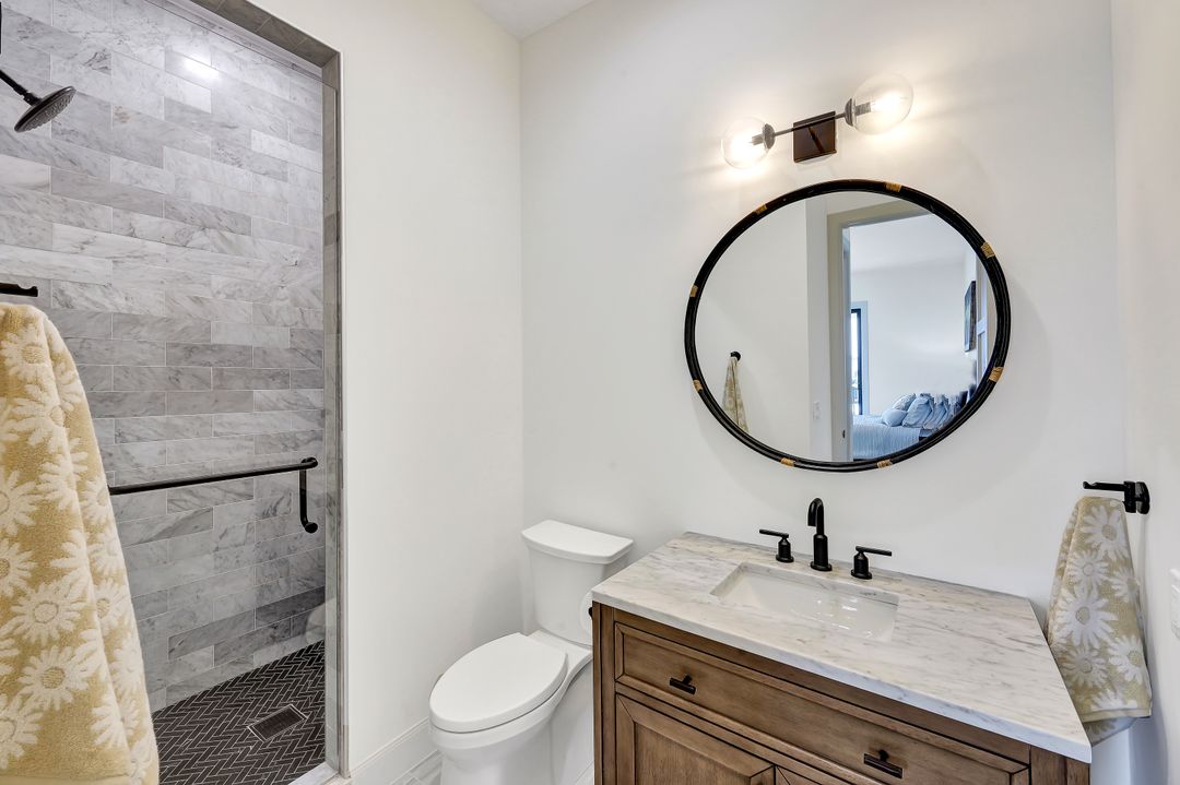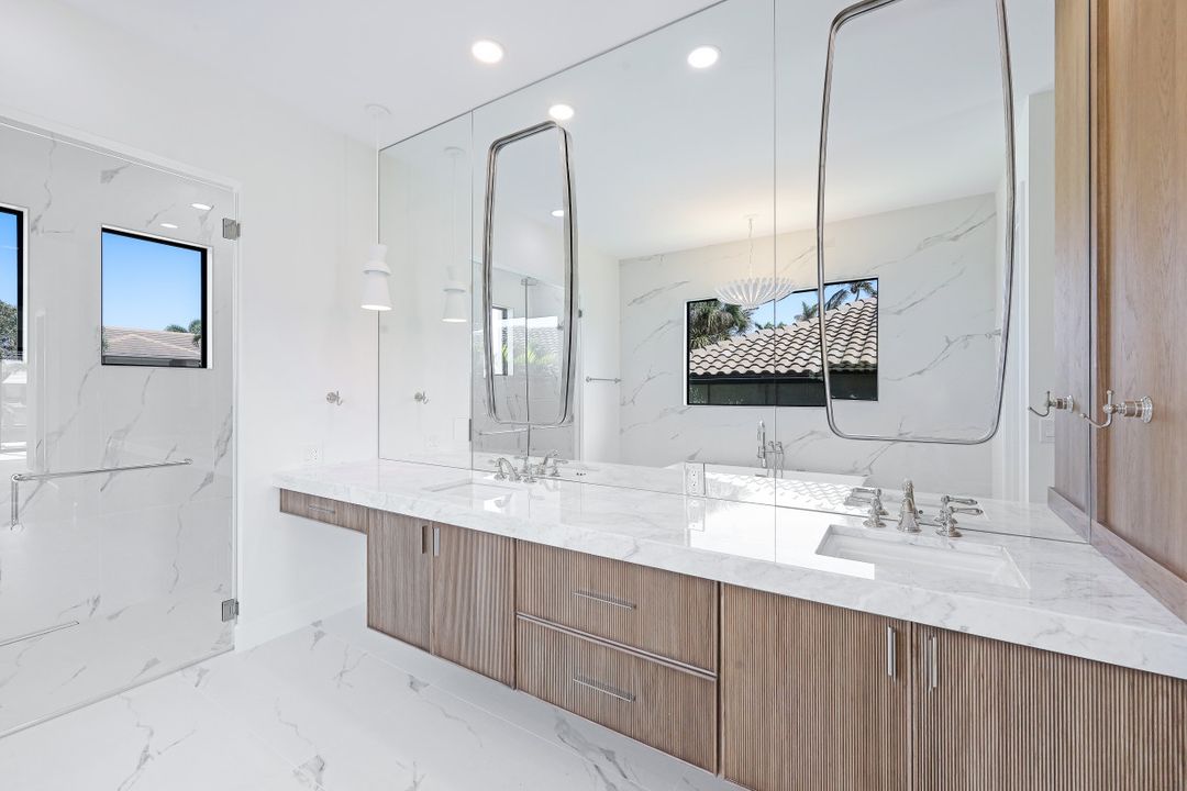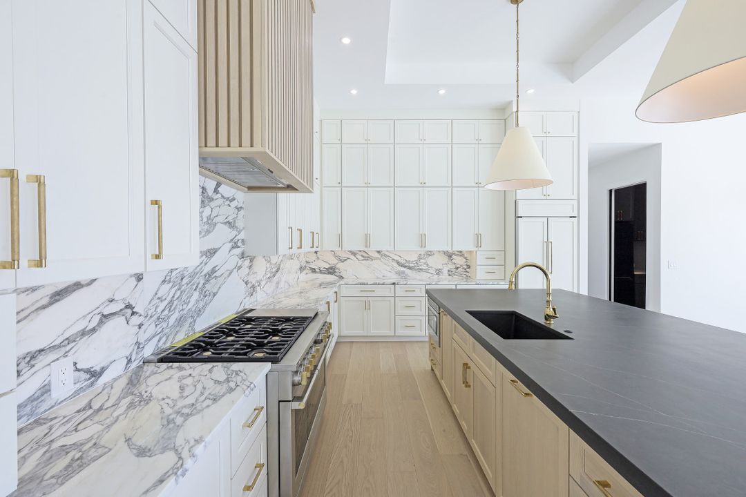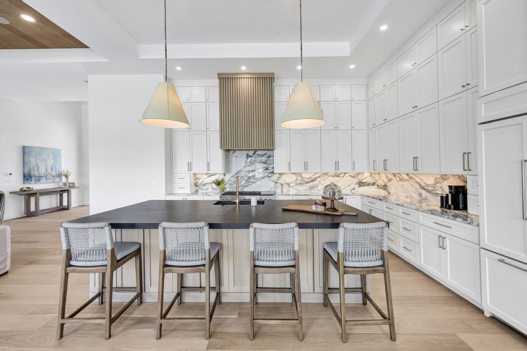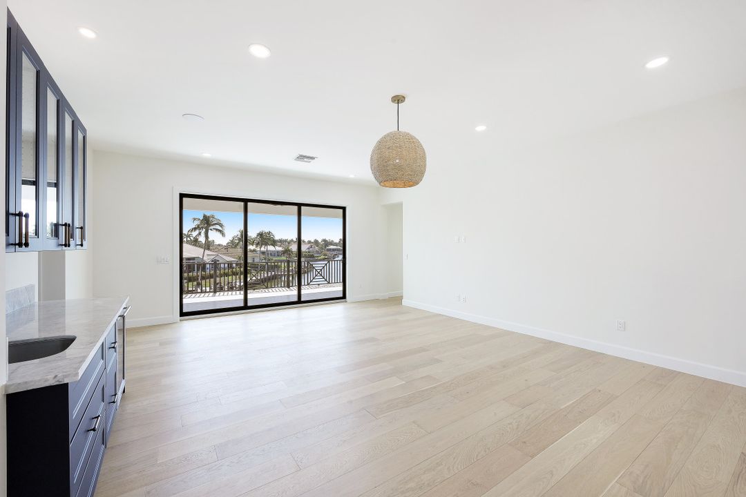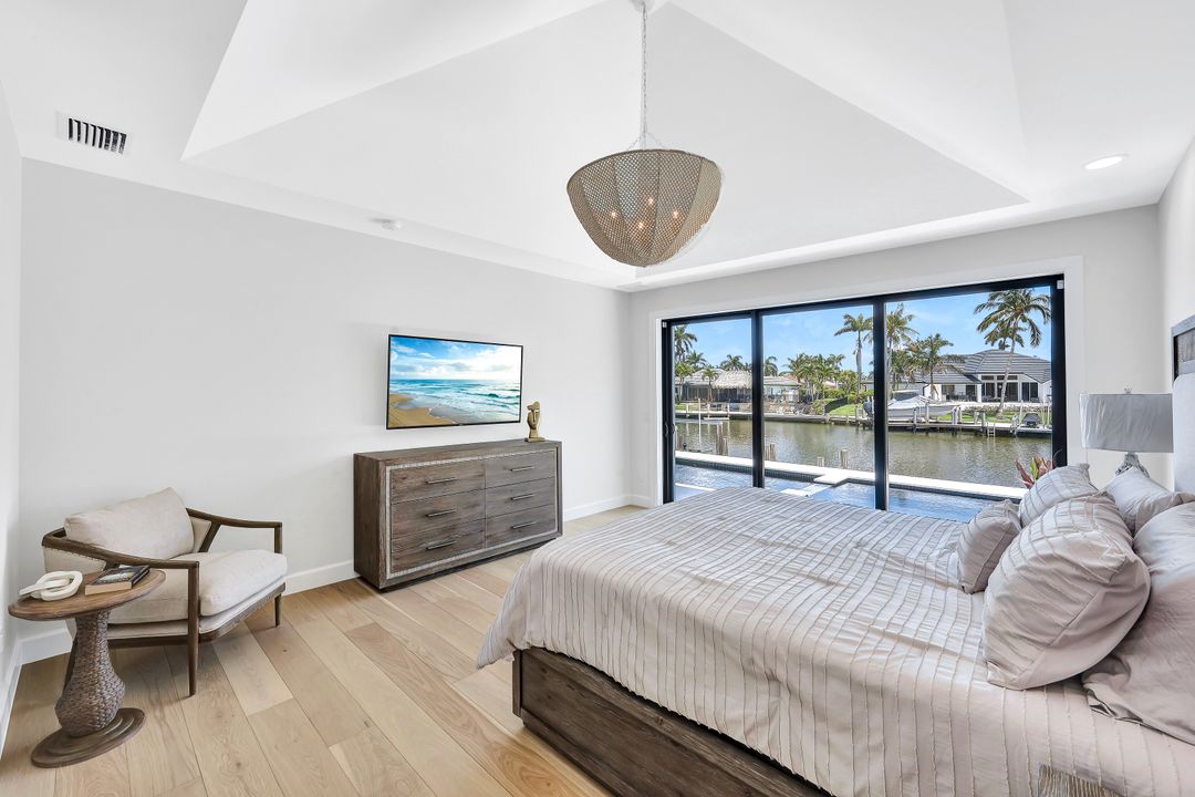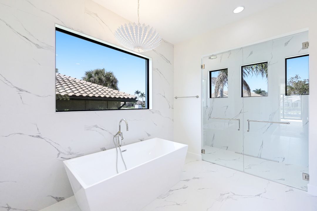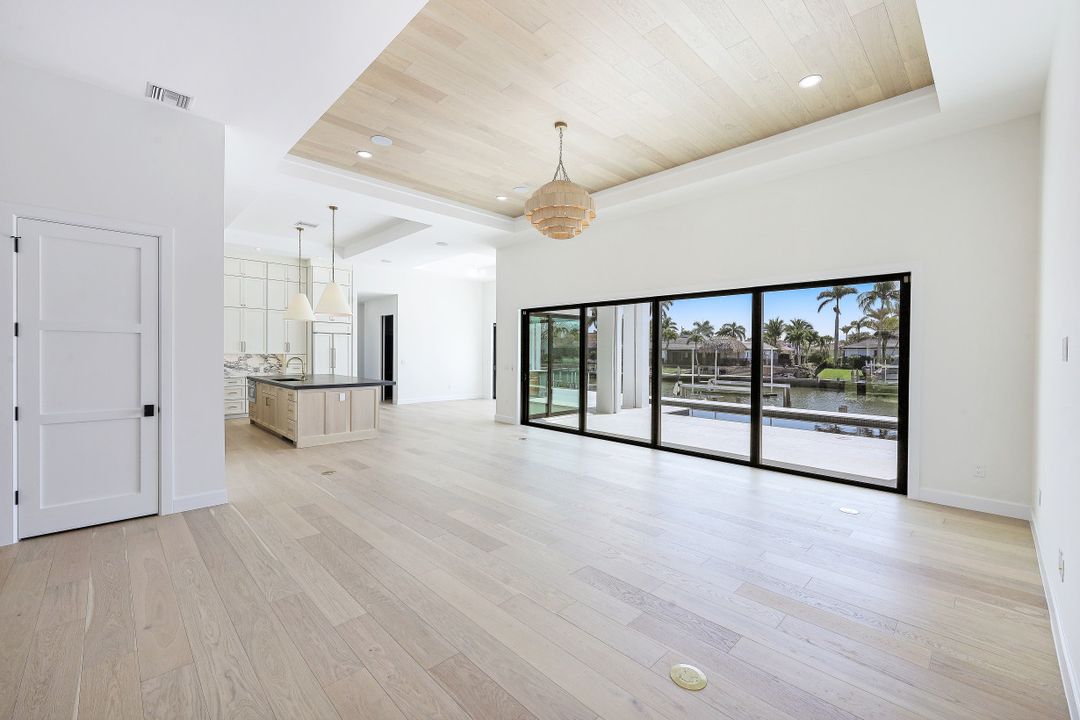 Brand New spectacular coastal contemporary, water direct, 2-story |4 Bed | 5 Bath | 5066SF TTL home with long and wide water views is a breath of fresh air. Open plan living with picture window, beamed living/dining 12-foot ceiling, high end fixtures, finishes and architectural details including, chic wide wood plank flooring, marble and stone counters, custom tile, designer lighting and wall treatments. The kitchen includes a gas cooktop, breakfast bar, wet bar in the butler's pantry; and opens to an outdoor kitchen with built-in grill, fireplace, and lanai with electric screens and shutters. The ground floor primary features 2 walk-in closets, free-standing tub, zero entry shower and dual sinks in bath. 3 upper ensuite bedrooms share a common games room with wet bar, and ALL open to terraces. A southeastern rear exposure brings gorgeous light, to the zero-edge shallow beach infinity pool with spa, water feature and pool bath with new 2020 seawall, dock and lift for quick out to the Marco River and Gulf of Mexico. A mudroom/laundry is off the 3-car garage with 2 separately zoned A/C systems and is generator ready with home security features. Paradise is found in this ultimate all NEW Florida lifestyle home.
