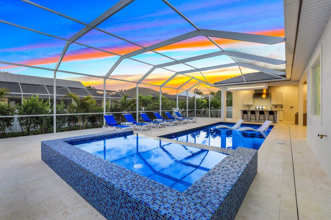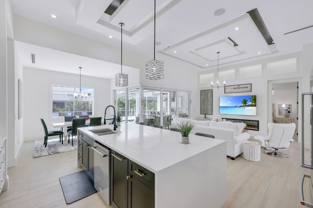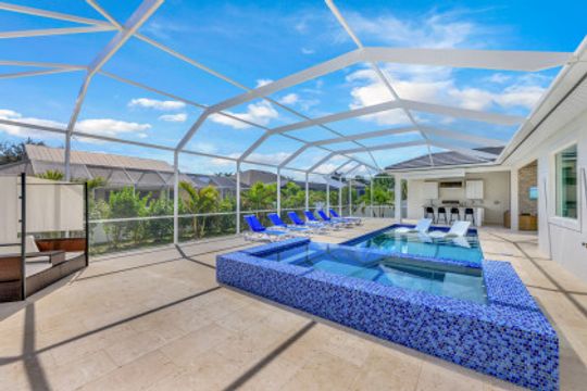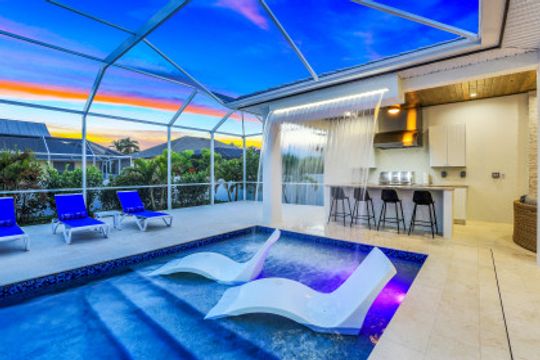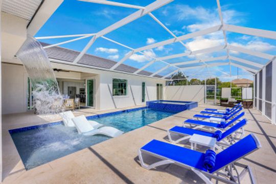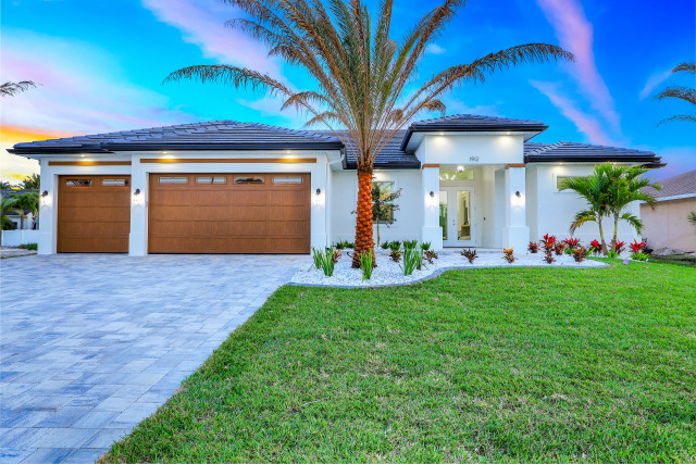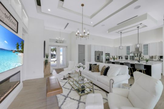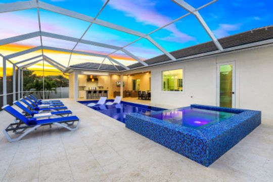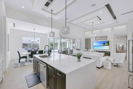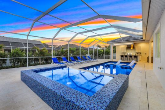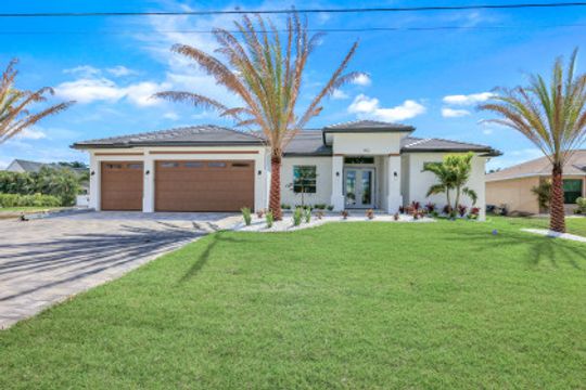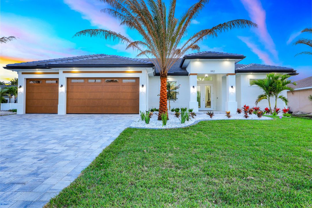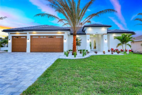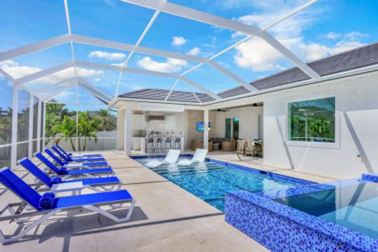 Luxurious Coastal Modern Home located in the Cape Harbour area. New Construction and loaded with every imaginable upgrade. Featuring 4 Bedrooms 3 Full Baths and a 3 Car Garage with an open floorplan, designer coffered ceilings, plank tile floors throughout, and level 5 drywall & paint. Stylish modern kitchen features a 9' waterfall center island, custom contemporary cabinetry, and high-end appliances. Spacious family room with feature wall & fireplace complimented by detailed vaulted ceilings. Designer chandeliers, fans, squared LED lighting. The owners suite feels like a private retreat with spa style with walk-in shower, tub, and vanities. Spacious bedrooms each with unique tray ceilings. Western Exposure for sunsets & afternoon sunlight on the Resort Pool. Pool w/ 8 person integrated hot tub! Massive sun shelf for sunbathing, waterfall from the roofline, and tons of LED lights in the pool & waterfall. Full outdoor kitchen w/ bar top, grill, and fridge alongside the almost 500 SF Cabana Outdoor Living Room! Huge mud set marble deck, cypress ceilings, & extensive landscaping. BOATERS very close to Cape Harbour for wet & dry boat storage, boat rentals, restaurants, dining, events.