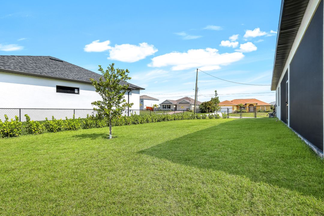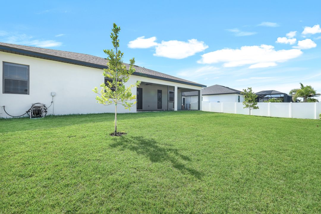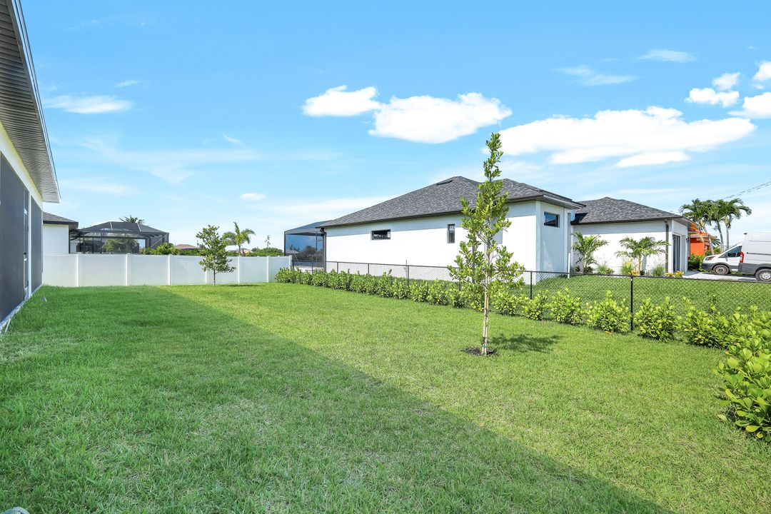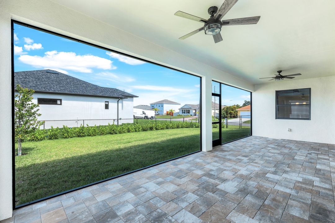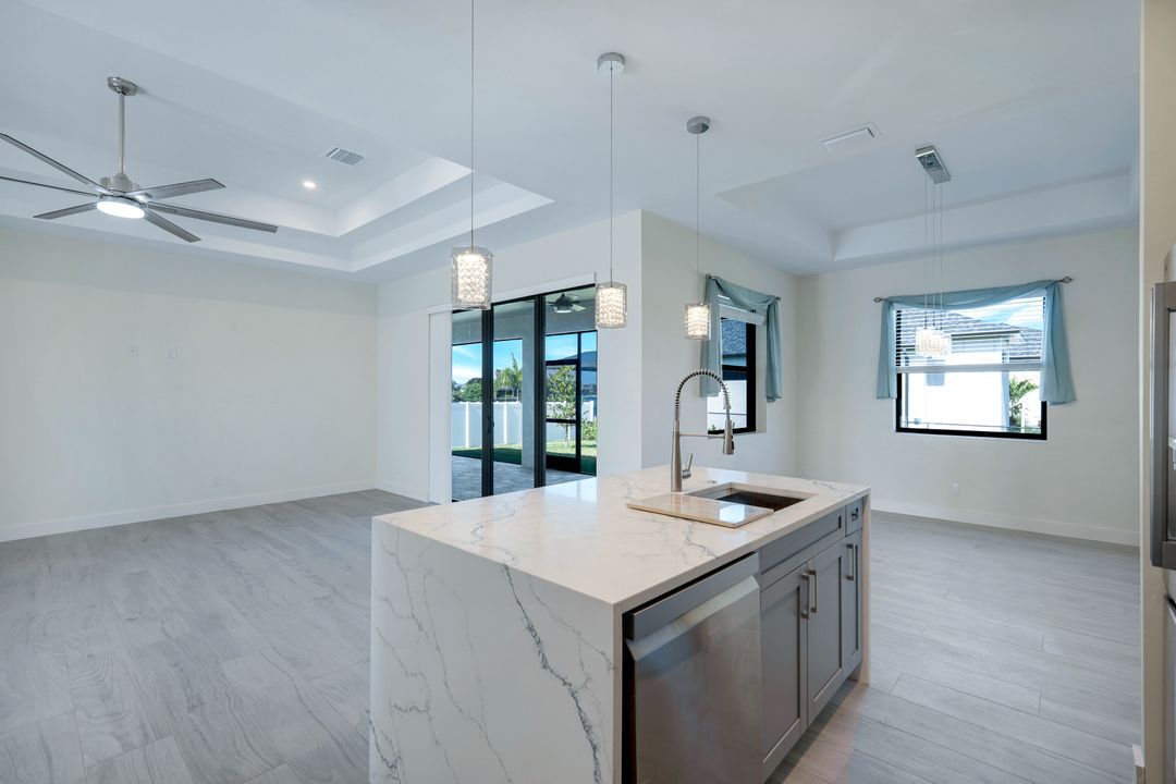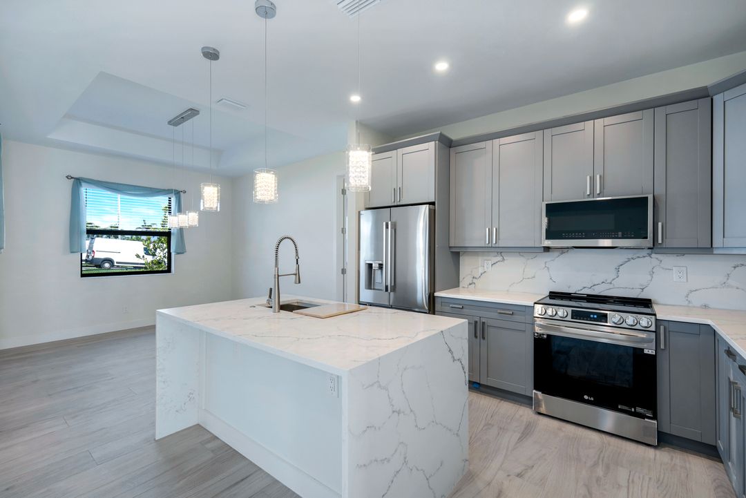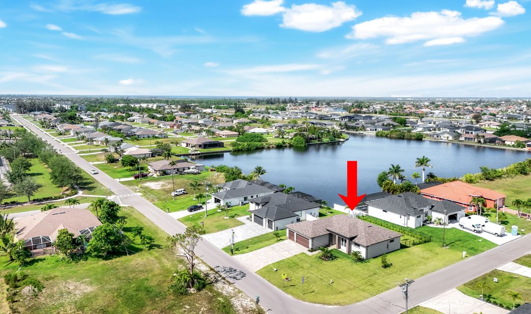 New Construction – This Custom-Built Lakeview Home is situated on an Oversized Corner Lot with 3 Bedrooms, Den, 2 Baths, 1900 sq ft of Living Area, and a 3-Car Garage. You will Love the Chefs Kitchen with Gorgeous Quartz Countertops and Full Quartz Backsplash, Waterfall Countertop Island, Soft-close Wood Cabinets, Luxury LG Stainless Steel Appliances including Craft Ice French door Refrigerator, and a Pantry. The Spacious Owners Suite Boasts a Tray Ceiling, Custom His & Hers Walk-in Closets, Dual Sink Vanity, and Large Walk-in Shower. Added Cabinets and Countertop in the Laundry room provide Extra Storage and Enhanced Functionality of the space. There is even an Electrical Outlet in the Linen Closet to keep your rechargeable vacuum at the ready. The Extended Lanai is the Perfect Place to Relax and Enjoy the Lakeview and the Fenced Backyard is Ideal for Children and Pets. This Home also Features Volume ceilings, 8-foot doors, Multiple Tray ceilings, Upgraded Plank Tile flooring throughout, Custom Closets in all Bedrooms, Recessed lights, Impact Windows, Window Coverings, Epoxy Garage Floor, Black Chain Link Fence, Paver Driveway-Walkway-Lanai, and Premium Landscaping. The Living room, All Bedrooms, Den, and Lanai are equipped with Ceiling Fans. Central Water, Sewer and Irrigation are already in place. Conveniently Located near Jim Jeffers Park and the Burnt Store Boat Ramp, and close to Restaurants, Shopping and Schools, with easy access to Fort Myers RSW International Airport and the Punta Gorda Airport.