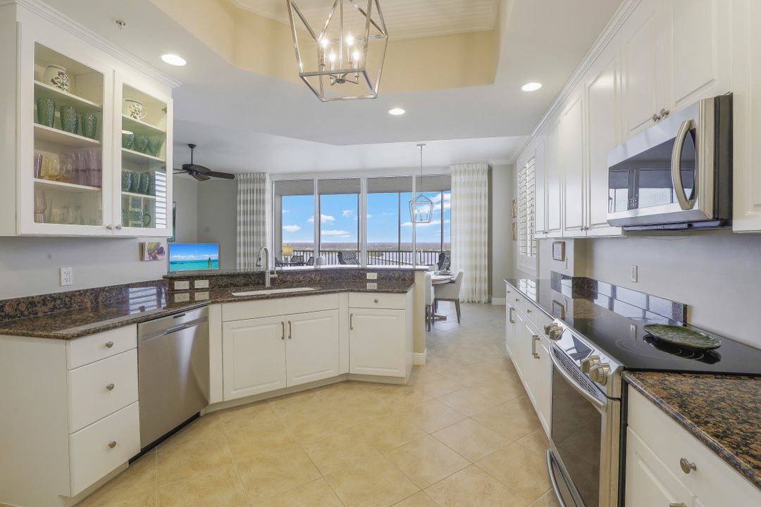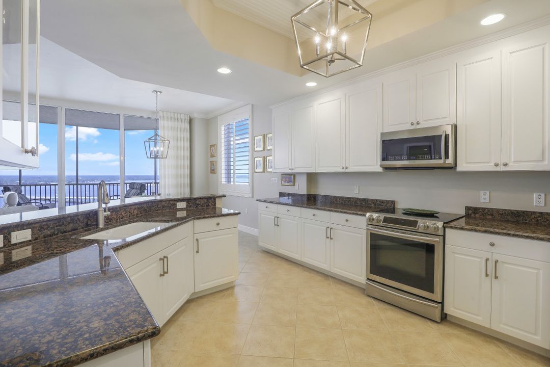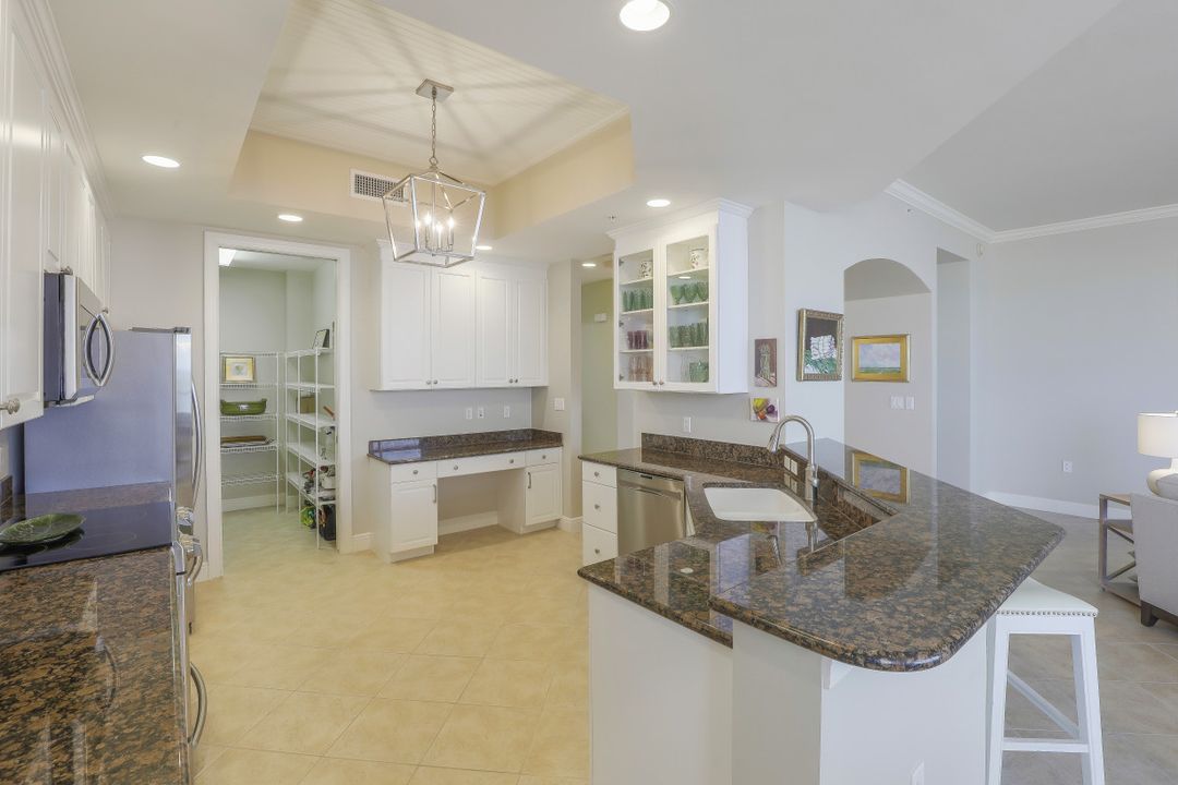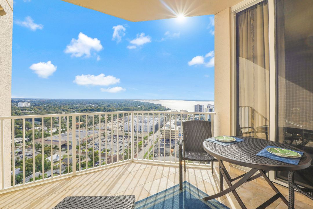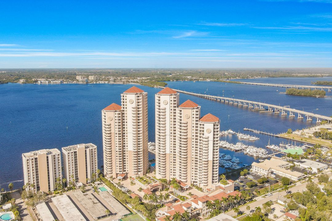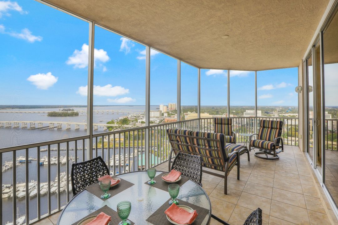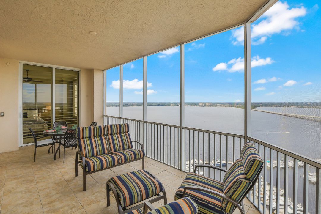 Move-in ready, rare ‘08 stack’ unit with higher ceilings offering privacy & sweeping vistas of the Caloosahatchee River await in this stunning, 25th floor residence! Elevators open to private foyer leading to a 3-Bed, 2-bath open floor plan. Features include Chefs kitchen, new bar area & beverage fridge (being installed 2/1), large walk-in pantry, stainless appliances, new dishwasher, granite and butcher block counter tops, 8 ft. solid wood doors & plantation shutters on all windows. Owner’s suite includes resort-style bath & large walk-in custom closet. New cabinet in living room niche (being installed 2/1). New bedroom floors. Laundry w/ built in cabinets & tub. Large lanai & rear balcony offer 300 degrees of magnificent views, sunsets, & sunrises. Impact glass throughout. Unit includes two enclosed parking spaces & storage unit. Newer AC. Amenities include resort pool, spa, exercise center, large gathering room, guest suites, on site staff, 24-hour security officer, premium cable, water, & many social activities. Within walking distance of historic downtown., Publix, fine dining, Edison-Ford Winter Estates, Florida Repertory Theatre, and Shopping. Florida Lifestyle at its best!