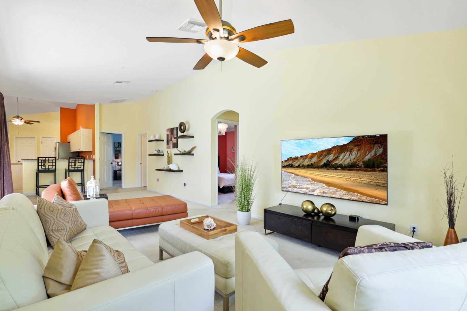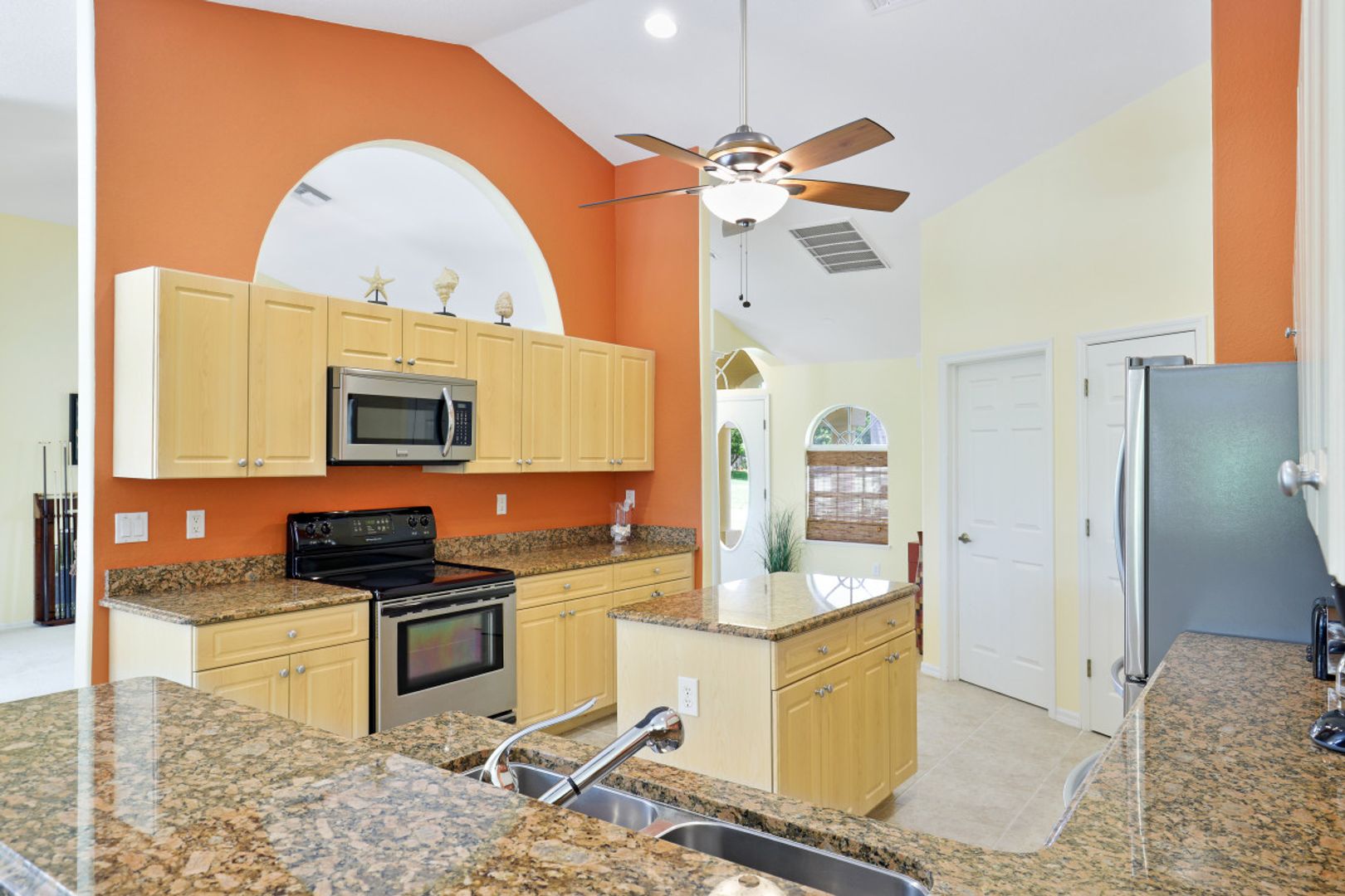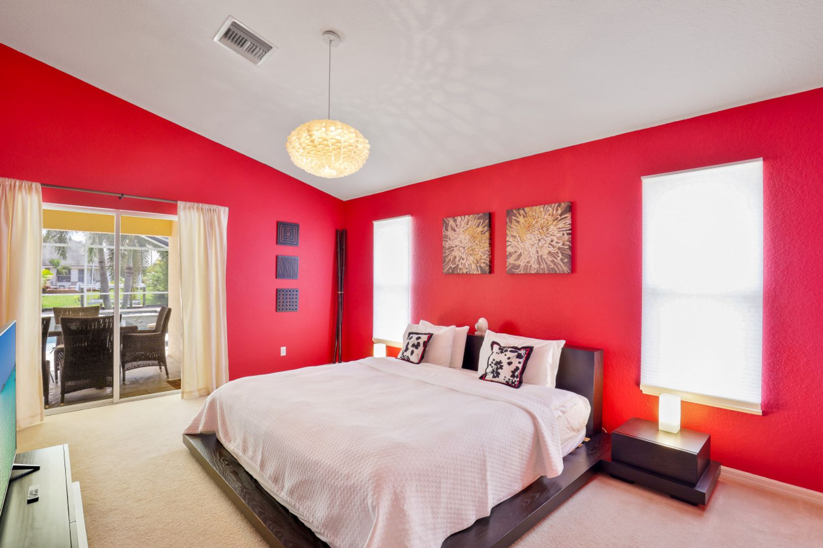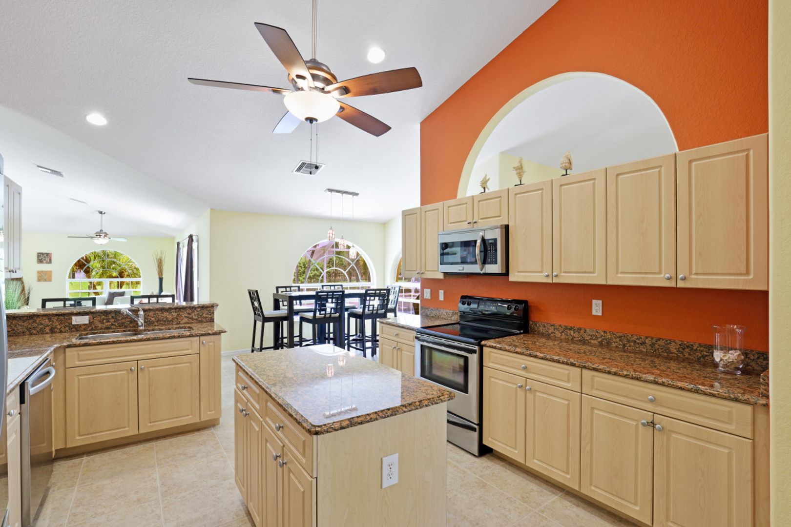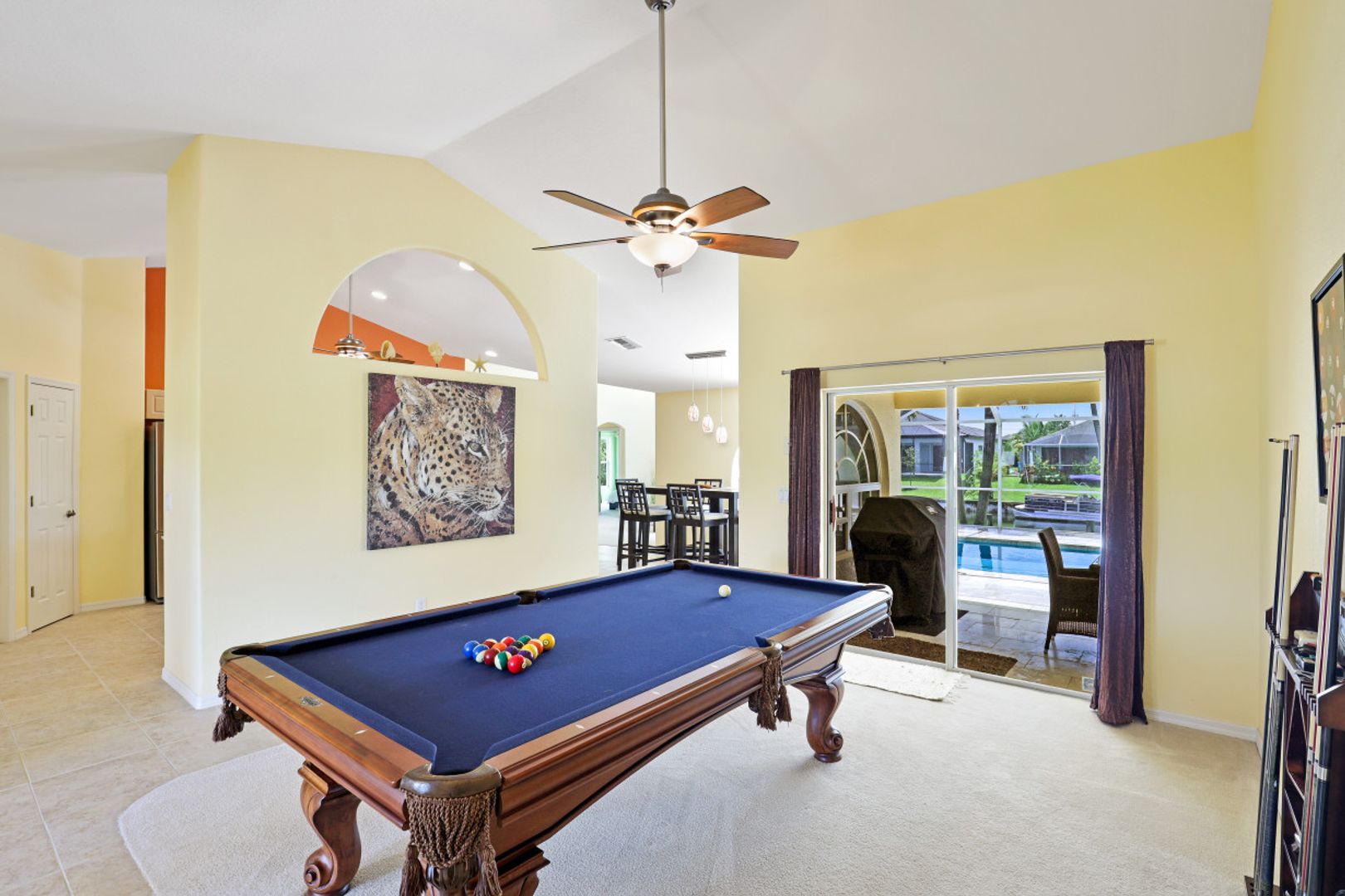Enjoy Florida waterfront living in this tastefully decorated villa with 4 bedrooms, 3 bathrooms, (1 bathroom is a pool bathroom which is only accessible from the patio) kitchen, dining area, pool table and living room that opens to the patio and outdoor area. The patio is equipped with outdoor seating and lounge chairs, dining furniture, grill, electrically heated pool and spa.