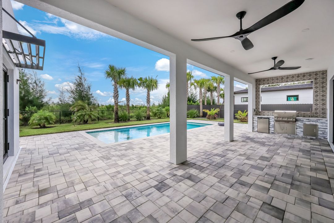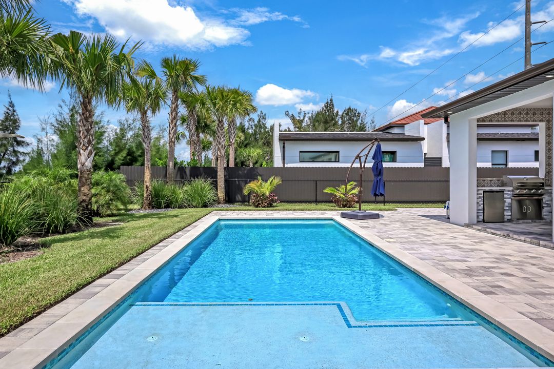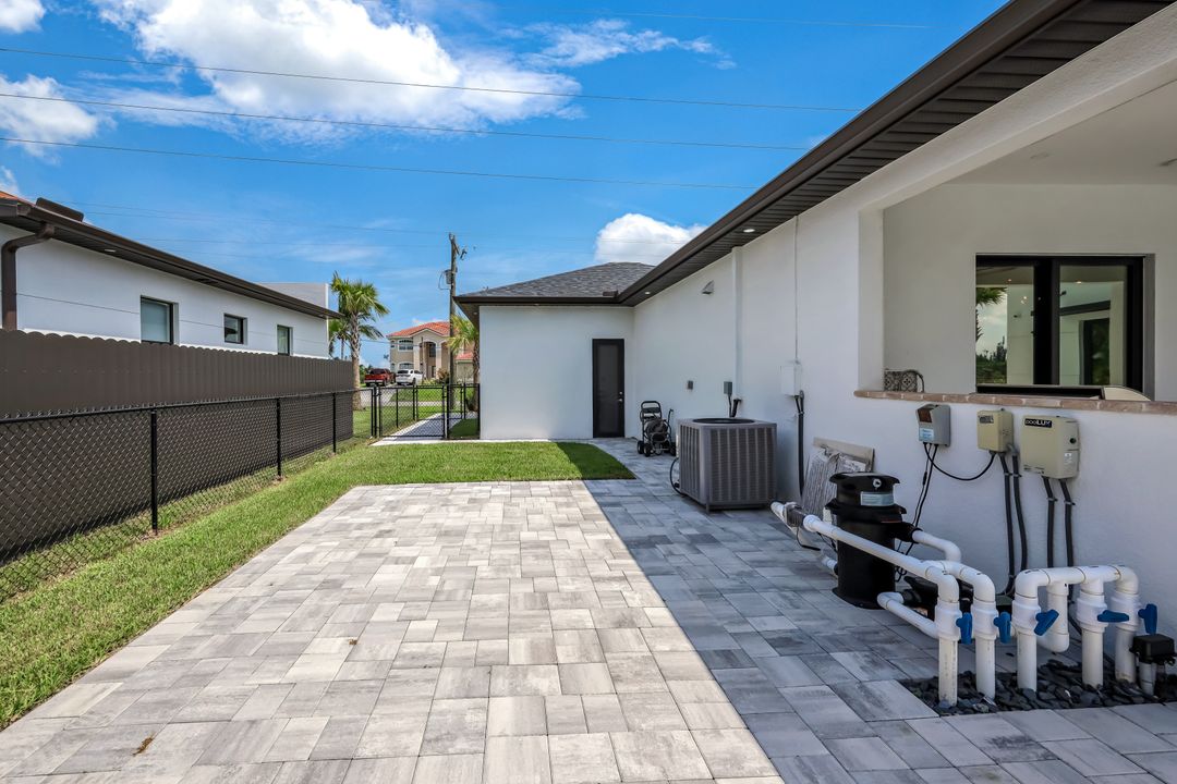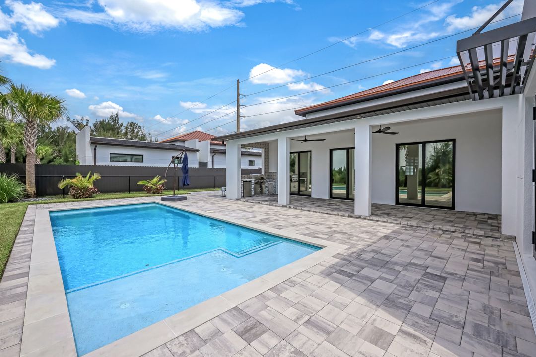Southern Exposure, Newer Built Salt Water Pool Home! ASSUMABLE VA MORTGAGE AT 5.75% - Available to Veterans! Welcome to this stunning modern home in the up and coming and highly sought-after Pine Island Corridor. This exquisite residence features 3 spacious bedrooms and 2.5 well-appointed bathrooms, offering floating cabinets, quartz counters and high end fixtures. Pull into the oversized concrete driveway with a decorative transition, leading to a 3-car epoxy floor garage, plus additional parking pad. Inside, the home is designed with sophisticated touches such as straight stacked porcelain tile throughout, impressive 12 ft ceilings, and elegant brass Sputnik chandeliers, impact windows and doors throughout. The open space kitchen is a chef's dream, featuring a 12 ft quartz countertop island and backsplash, European-style cabinets with soft-close technology, 2 Whirlpool stainless steel ovens and a commercial grade hood vent. The living area includes a wine case feature wall with an art niche and an electric fireplace, creating a cozy and stylish atmosphere. One way solar tinted sliding glass doors lead to the oversized pool area, perfect for outdoor entertaining ensuring privacy as well as energy efficiency. Cool off in the electric heated crystal blue blue salt water pool with sun shelf surrounded by a fenced-in backyard beautifully landscaped with an assortment of pygmy dates, palm trees, flowers, and fruit trees. Additional outdoor amenities include oversized pavered sun pad, outdoor shower and a summer kitchen with a grill, refrigerator, and sink. Smart home features such as a Google entry, security system, along with LED lighting throughout, add to the modern conveniences of this home. Contemporary touches such as a decorative wine display, plantation shutters, remote controlled custom zebra blinds, built in custom closets and floating cabinets make this home is a perfect retreat for those who appreciate modern luxury and enjoy the Florida lifestyle. Head down to the Pine Island Corridor for a plethora of dining, shopping and entertainment options. City Water and Sewer in Place! You deserve to enjoy everything SWFL has to offer - beautiful weather year-round, world class fishing, golfing, kayaking, paddle boarding, tubing, jet ski or just relax in your very own tropical paradise! Call and schedule a private viewing today!
