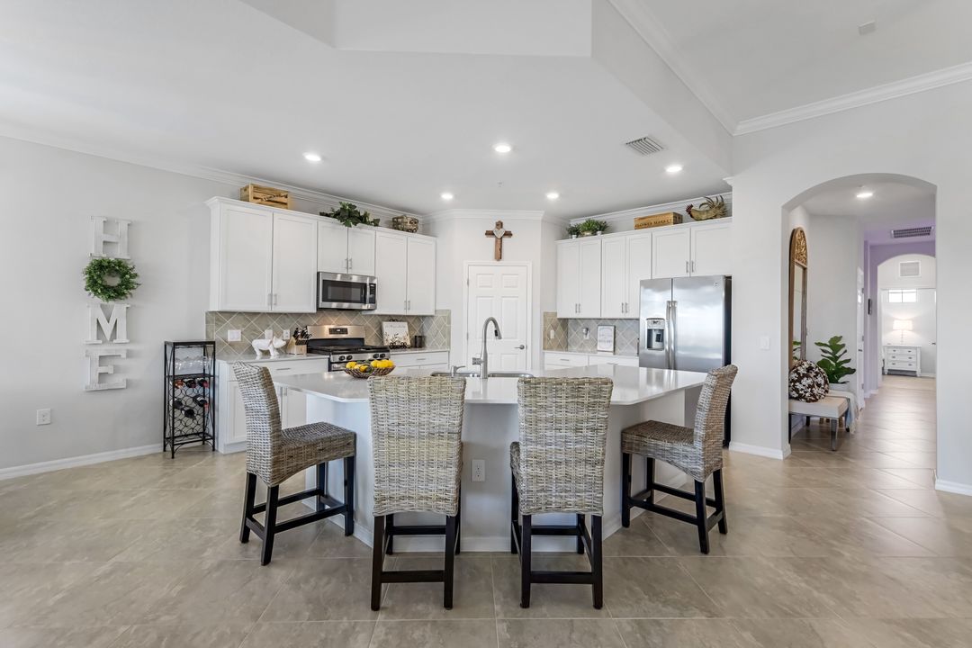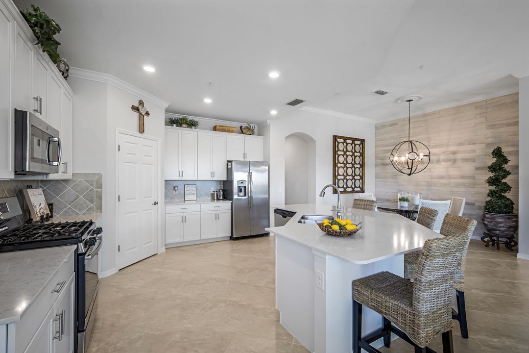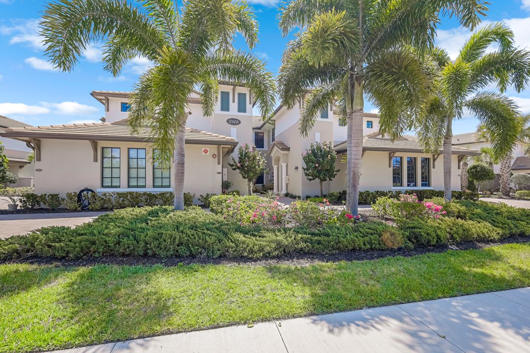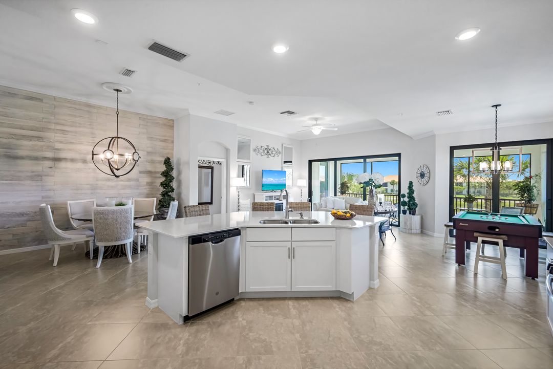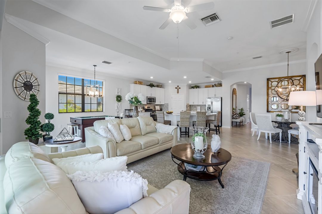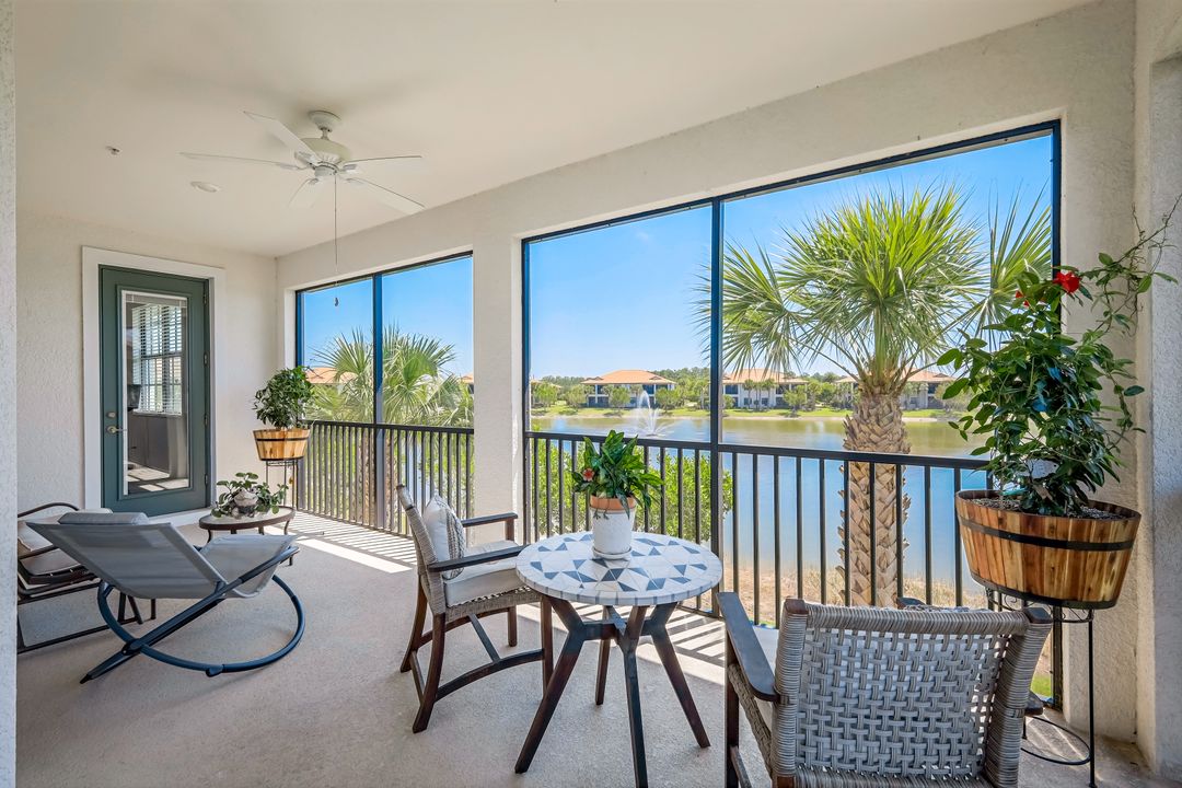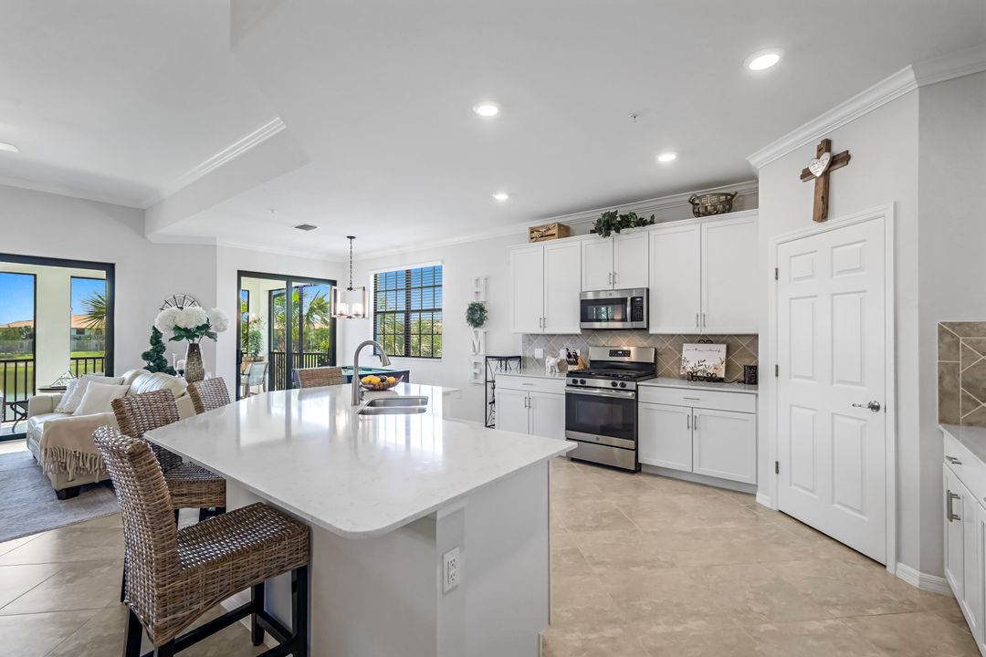 The wait is over for this rarely available, second floor, 3BR+Den luxury coach home with private elevator and two-car garage in Lamorada Naples - a low-density, amenity-packed community in North Naples. Built in 2018 by WCI, quality specifications abound, from solid concrete block construction with impact-rated windows and doors, to high ceilings with architectural detailing, crown molding, quartz countertops, and neutral tile and luxury vinyl plank flooring throughout. With nearly 3,000 square feet of total living, the ease of a low-maintenance condominium lifestyle is blended with the spaciousness and privacy of a single-family home. The chic, open-concept floor plan is bathed in natural light with lots of windows and two sets of sliding glass doors in the great room leading to a large, east-facing lanai where gorgeous panoramic lake views set the stage for magnificent sunrises. A kitchen designed for entertaining features stainless appliances, natural gas cooking, a walk-in pantry, and an expansive island where family and friends will love to gather. The split-bedroom layout lends itself to part-time or full-time living with a gracious primary bedroom suite, with lanai access, in addition to two guest bedrooms, plus an ample size den/office/flex space that could convert to a fourth bedroom if needed. Frangipani Circle offers a tranquil setting within the community and is tucked away from busy roads. In walking distance is the show-stopping lifestyle center with on-site activity director who creates a robust calendar of social events, resort/lap pool, poolside bar and restaurant, culinary arts studio, fitness center, pickleball, tennis, bocce, even a movie theater! Lamorada is a North Naples jewel, within minutes to a variety of dining and entertainment venues, as well as the famed sugar-sand beaches along the Gulf of Mexico.