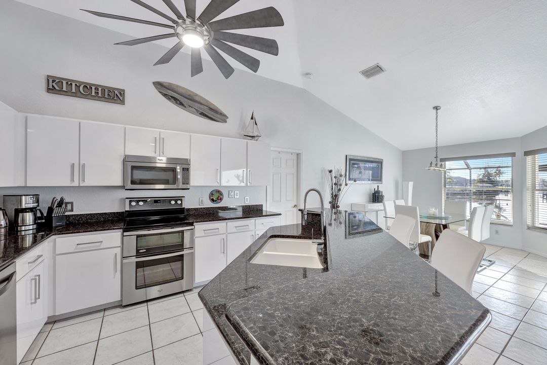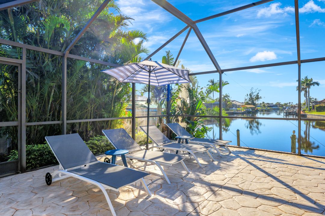 Beautiful Gulf Access Home with Southern Exposure and intersecting canal view. Home is being sold TURNKEY with all bells and whistles. 3 Bed, 3 Full Bath, fully equipped island kitchen with granite countertop, master bath with extra shower, double sinks, walk-in closets, and a separate toilet. Tile and wood floors throughout (no carpet). Spacious outside area with heated pool and spa, Tiki Hut and Captains Walk. NEW METAL ROOF PLUS NEW GUTTERS AND SOFFITS, NEW EXTERIOR PAINT, NEW KITCHEN AND BATHROOM FRONTS, NEW FRIDGE, NEW FANS, AND NEW FURNITURE (partial)! This is a perfect home for entertainment and would be ideal for someone seeking a second home with rental income or an estate-sized home with a beautiful waterfront view in Cape Coral. All assessments are in and paid! Please see the video tour. I appreciate your interest in my listing!