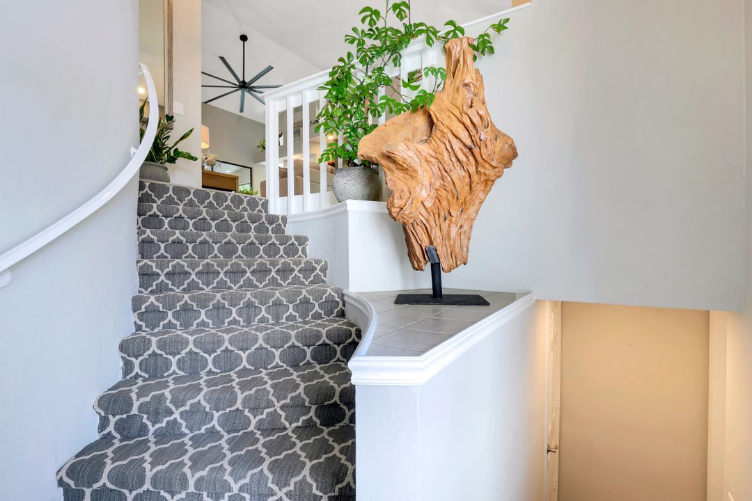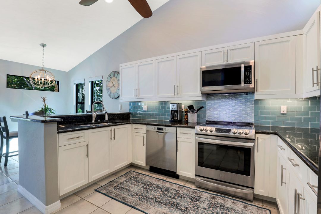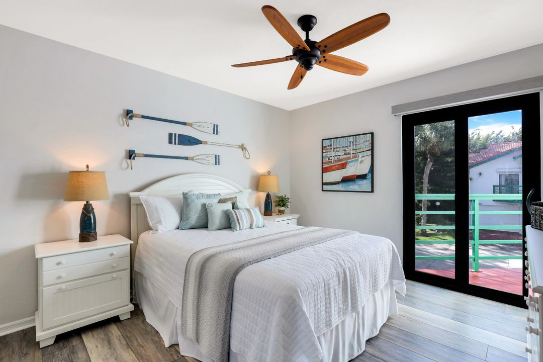 You will never want to leave the vacation-at-home vibe of this fully renovated, turnkey condo sold fully furnished w/private pond view & water feature, and gulf access w/boat slip, up to 24ft, only $500/year. Fresh paint, including doors, breathes new life into this gorgeous end unit on the top floor which has been updated throughout, including newer high-quality vinyl flooring, remodeled bathrooms, all windows & sliders replaced w/new Hurricane Windows, new blinds, new epoxy garage floor, plus primary closets & pantry finished by Closets By Design. Vaulted ceilings & ample windows allow light to flow free-range throughout to transform the space before your eyes. Enjoy preparing meals in this impressive kitchen equipped w/white cabinets, black granite & all SS appliances. The primary is a dream enhanced with double sinks & freestanding soaker tub with shiplap accent walls. The guest bedroom is fitted w/built-in desk & new Murphy bed. Fantastic location close to Downtown Naples, beaches & restaurants. Gulf access w/boat slip, up to 24ft, only $500/year.