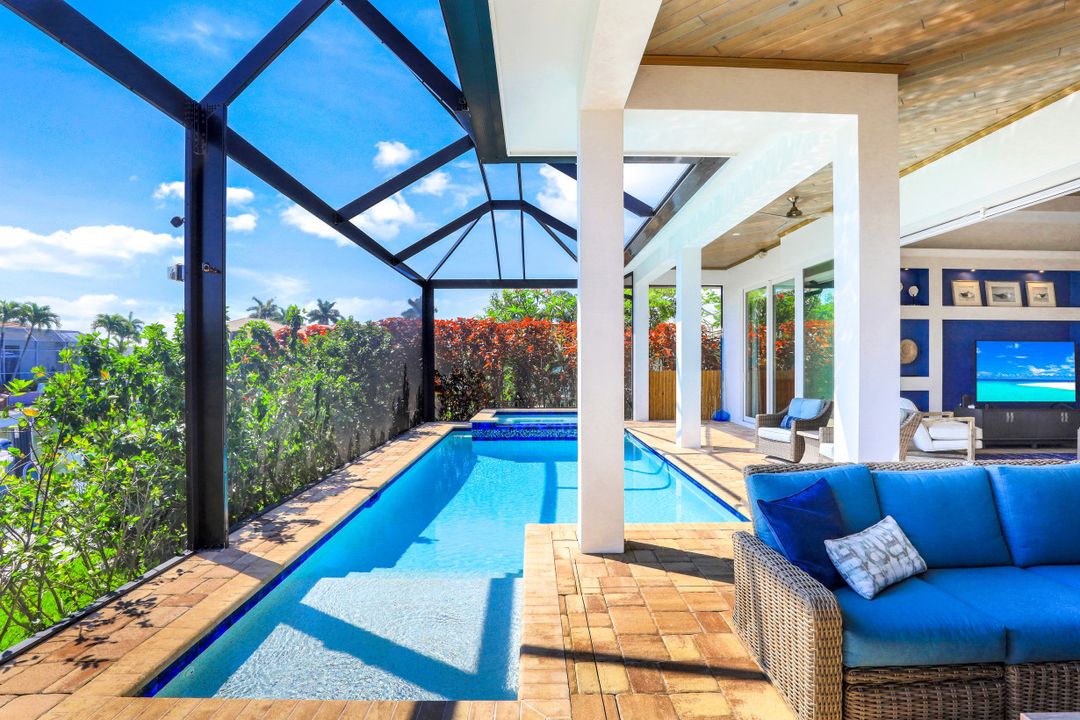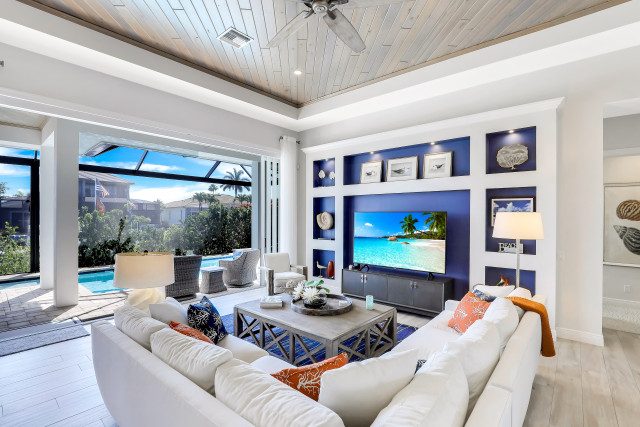 Stunning coastal former Model Home built in 2016, professionally decorated in the heart of Marco Island. Water direct and only five minutes to open water. Desirable open floor plan integrates the spacious and comfortable great room with dining and kitchen featuring rich cabinetry, gas cook top and large quartz island making it an ideal setting to cook and entertain. Exquisite attention to detail and impeccable craftsmanship. This immaculate residence features soaring and tray ceilings, recessed lighting, transom and high impact windows, sound and security system, generator, circular driveway, overhead storage in the garage, and powered window treatments. Split floor plan. All ensuite bedrooms and a gorgeous master bathroom featuring walk-in shower with multiple rain shower heads.
