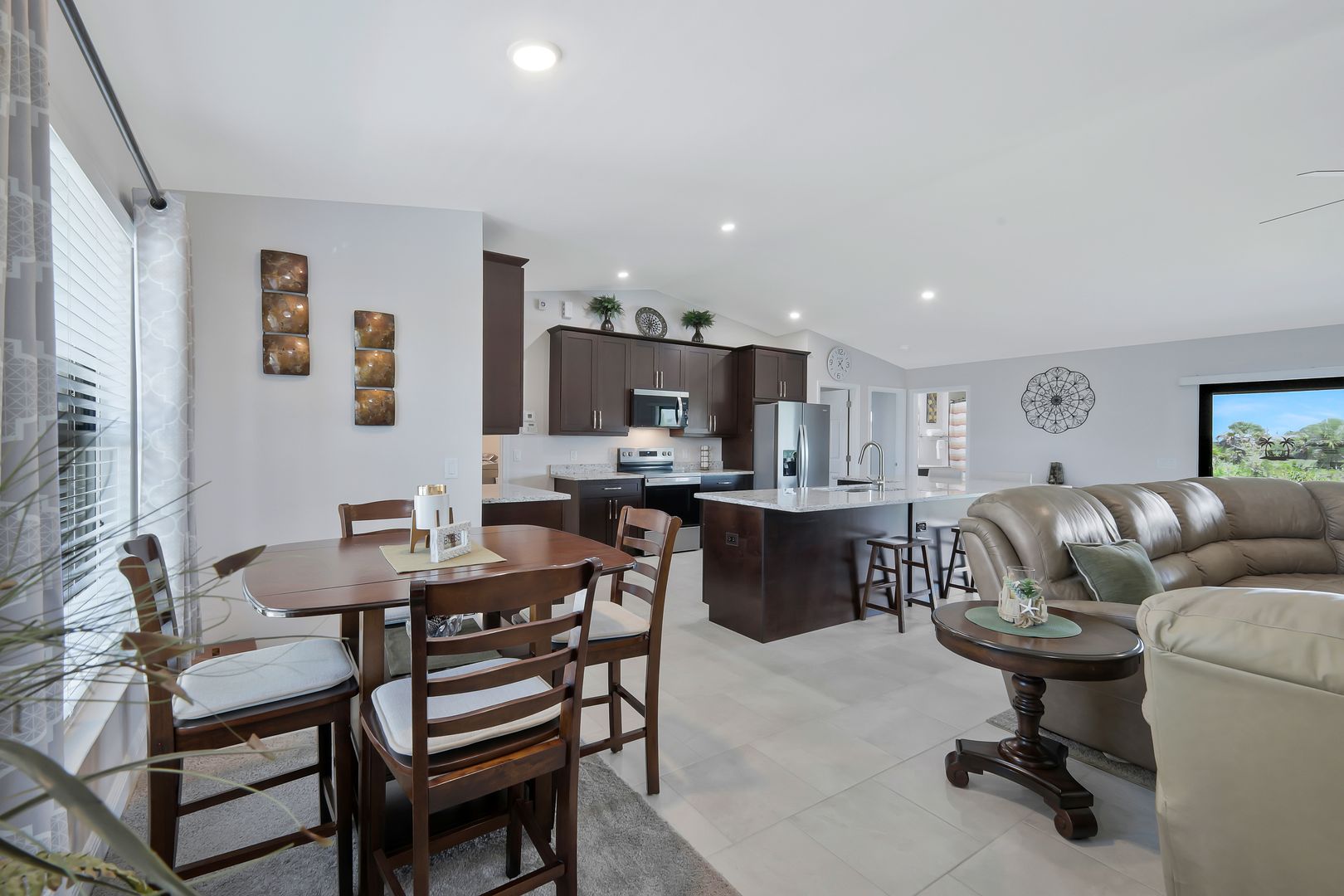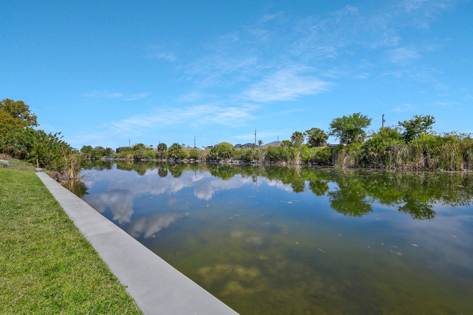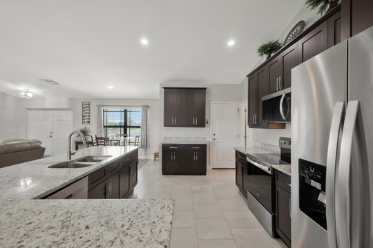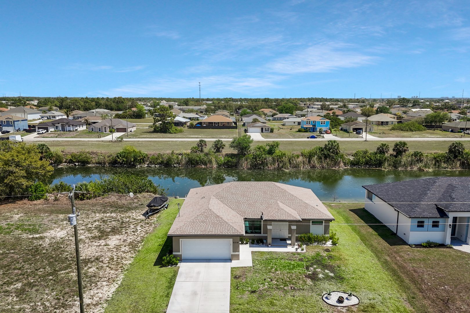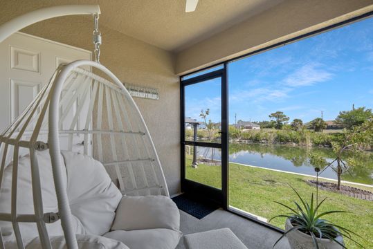 Welcome to this beautifully crafted newer construction home on a wide freshwater canal in the rapidly growing Northeast Cape Coral area. Offering 3 bedrooms, 2 bathrooms, and over 1,700 sq ft under air, this home combines modern design with everyday functionality. Step inside to an open-concept layout featuring 18-inch tile throughout the main living areas, creating a clean and cohesive feel. The kitchen is designed to impress with granite countertops, soft-close cabinetry, and a full suite of Whirlpool appliances. The split-bedroom floor plan provides privacy, while the spacious owner’s suite serves as a true retreat. Enjoy a large walk-in closet and a spa-like bathroom complete with an oversized walk-in shower. Additional highlights include carpeted bedrooms for comfort, ample natural light, and a layout that maximizes space and flow. Enjoy true indoor-outdoor living with a large screened-in lanai overlooking the canal—ideal for relaxing, entertaining, or enjoying peaceful water views year-round. The backyard offers plenty of room to add a pool or customize your outdoor space to fit your lifestyle. NO FLOOD ZONE! Freshwater canals are perfect for kayaking, fishing, and taking in the natural surroundings. Convenient access to shopping, dining, parks, and hiking. Enjoy all that SWFL has to offer!
