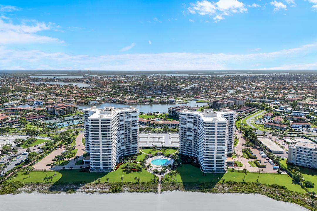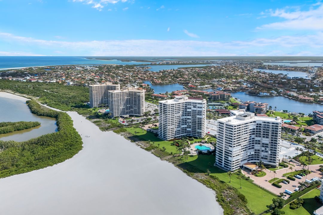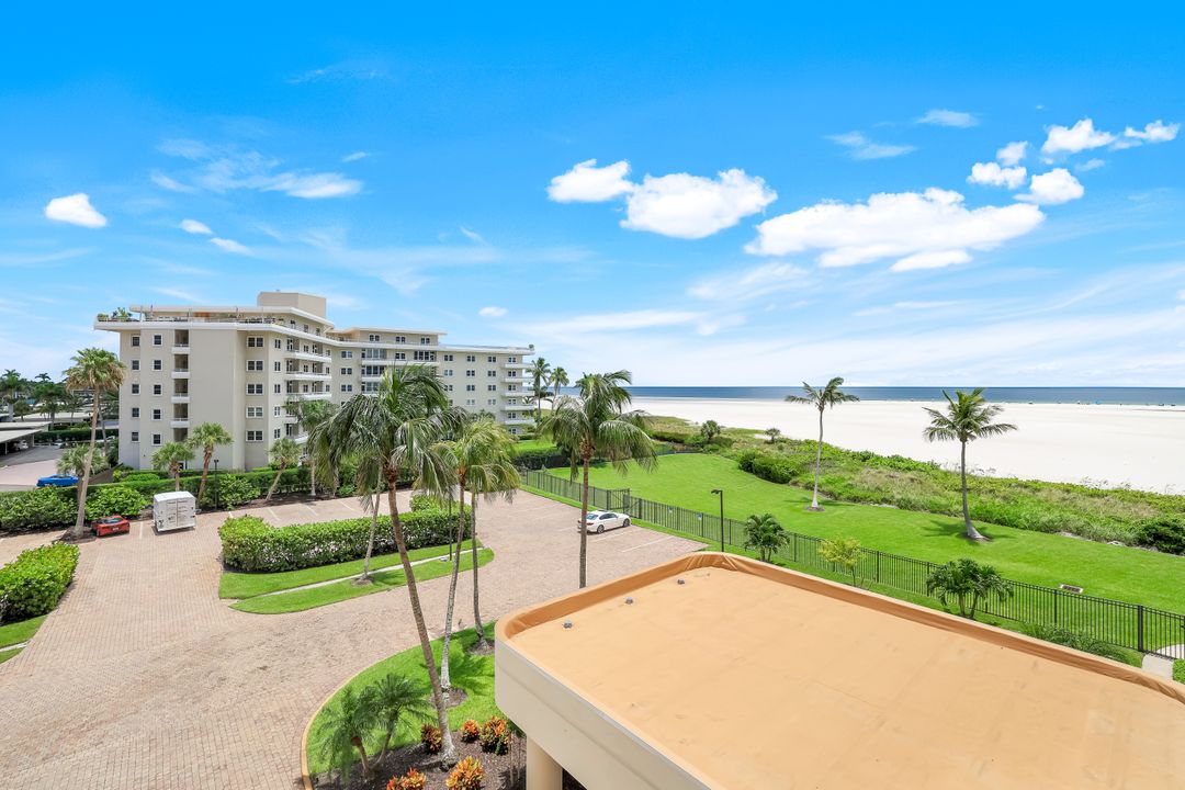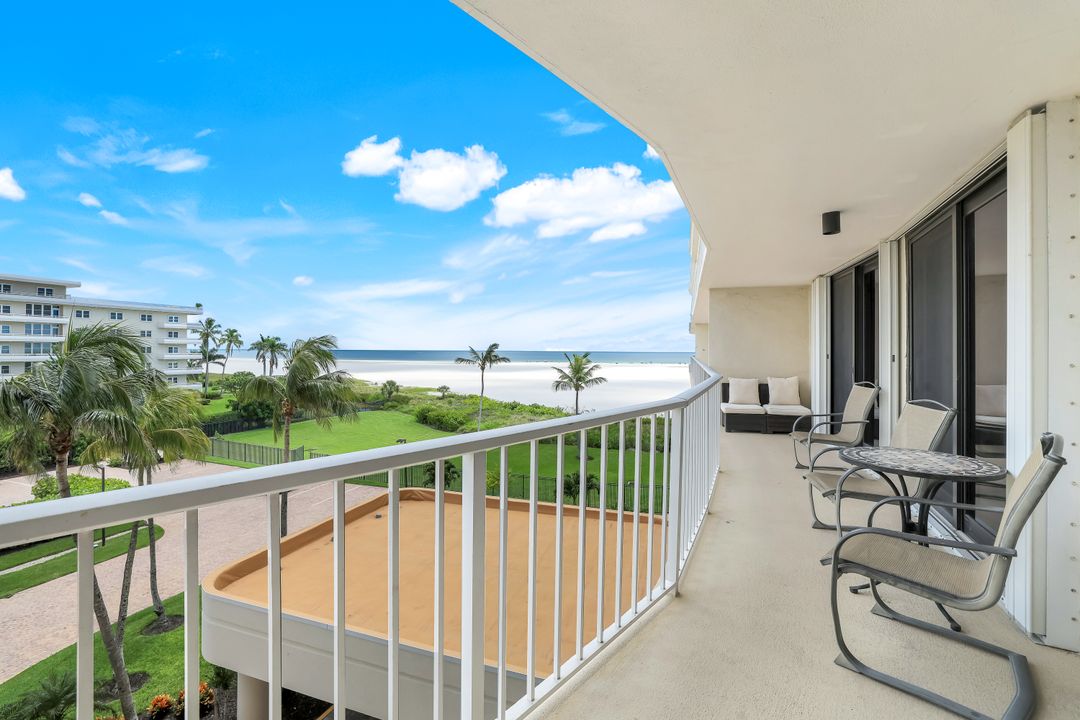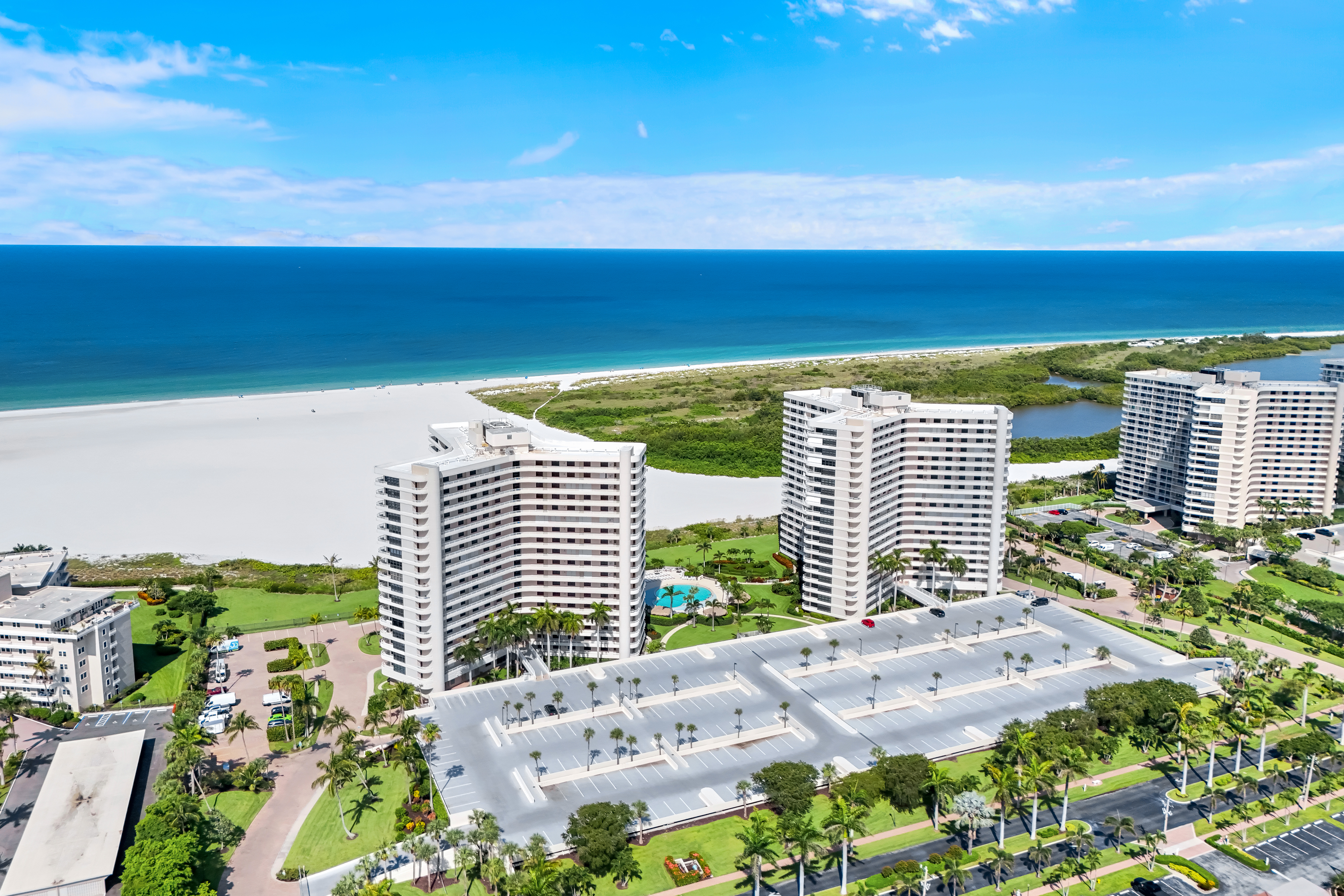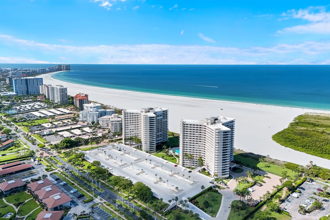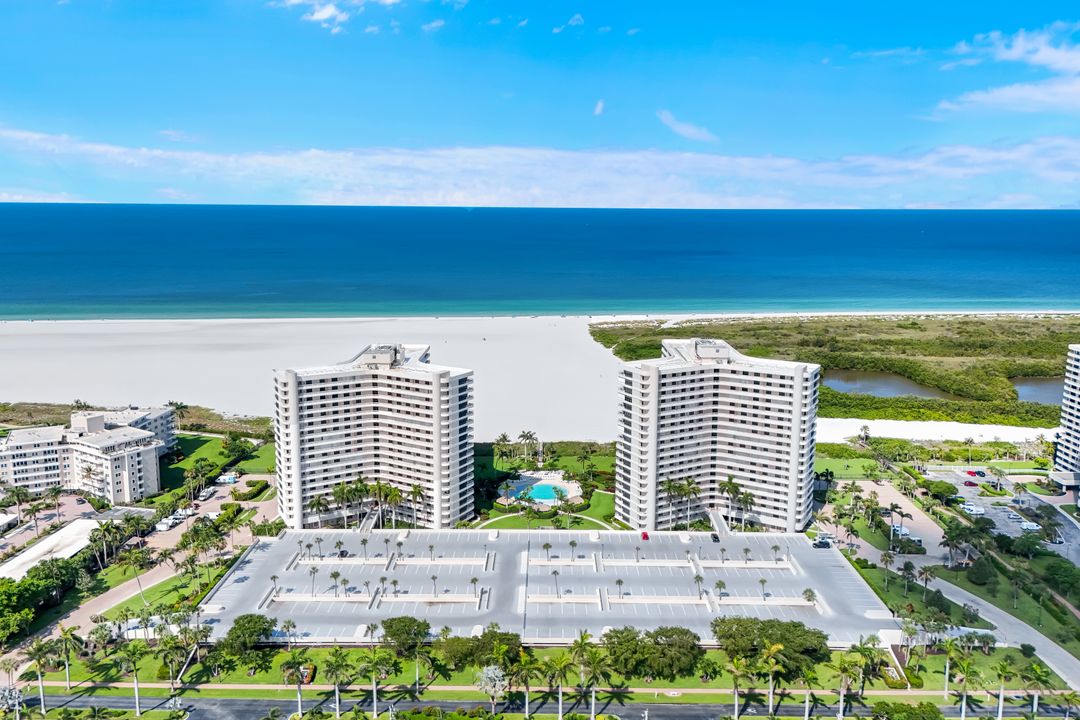 Coastal Elegance at South Seas Towers on Marco Island. Located on the 4th floor and nestled along the pristine shoreline of Tigertail Beach, this beautifully appointed two-bedroom, two-bathroom condominium is offered Turnkey and exhibits the quintessential Marco Island lifestyle. This condo's south-facing vantage point with captivating views of the majestic Gulf of Mexico and the powdery white sandy beach provide a picturesque backdrop for everyday living and memorable moments alike. Once inside, discover a spacious great-room layout that effortlessly blends comfort with sophistication. The inviting dining area creates a perfect space for entertaining or unwinding. The kitchen is both stylish and functional, featuring crisp white raised panel cabinetry, stainless steel appliances and elegant countertops. The bedrooms offers two serene retreats, each with updated bathrooms and access through the impact resistant glass siding doors onto the expansive balcony spanning the entire width of the condo to take in sweeping coastal views just perfect for morning coffee, evening cocktails, or alfresco dining. The recently renovated lobby, common areas and hallways throughout the building add a touch of modern upscale luxury to your everyday experience. South Seas Towers is a 24-hour guard-gated community that offers exceptional peace of mind with secure garage parking and on-site management. Resort-style amenities abound: enjoy direct beach access, a tropical heated pool, available boat slips, and kayak storage for water enthusiasts. Stay active with tennis and pickleball courts, bocce, shuffleboard, and a fully equipped fitness center. Additional conveniences are the extra storage and laundry facilities on the same floor as the condo. Whether you're looking for a serene beachfront escape or an active coastal lifestyle, this residence at South Seas Towers delivers the perfect blend of luxury, leisure, and location—where every detail is designed to elevate your living experience.