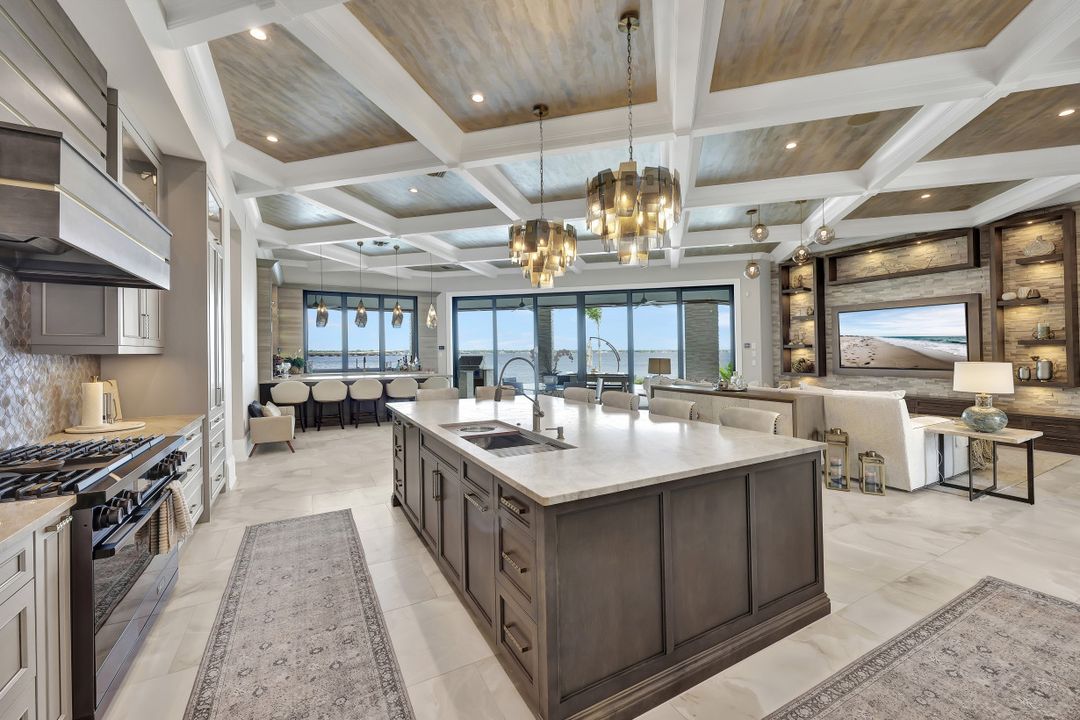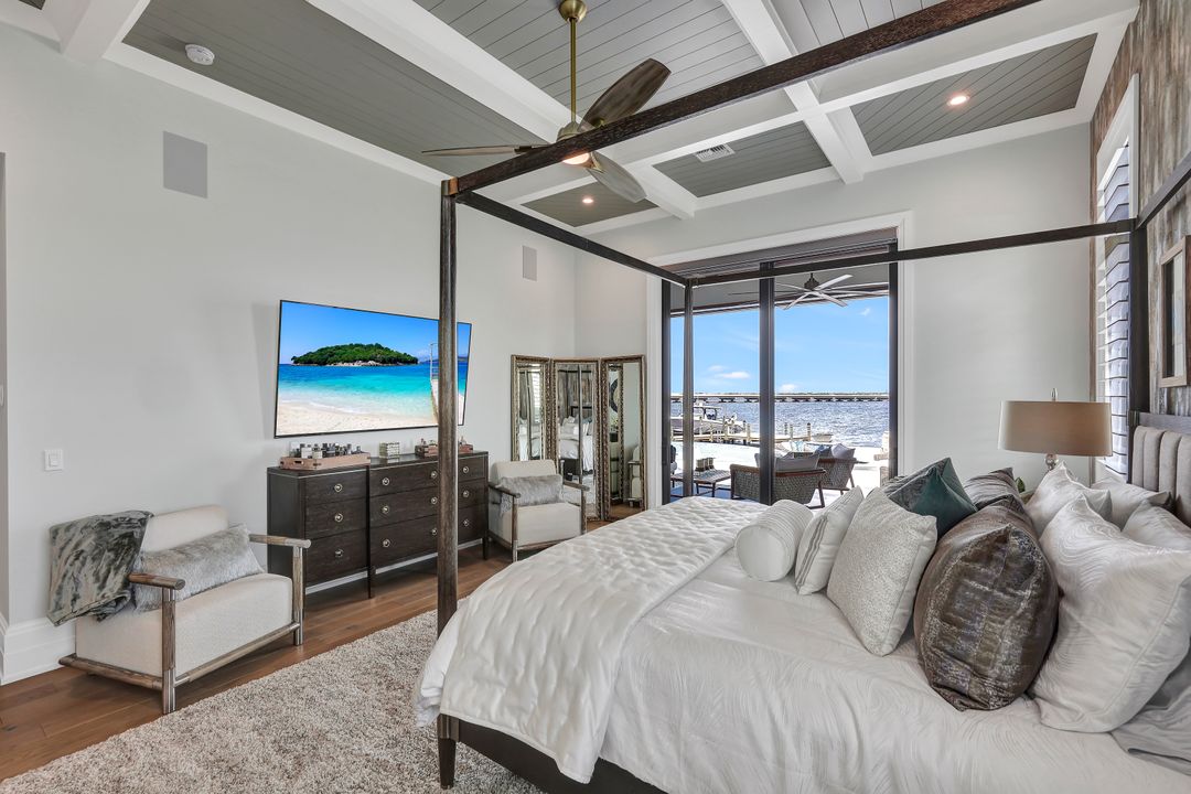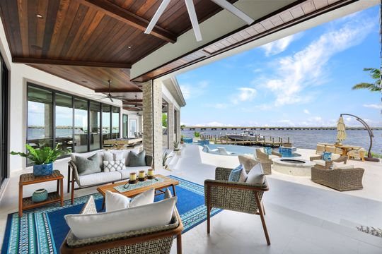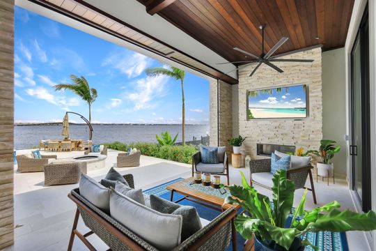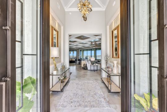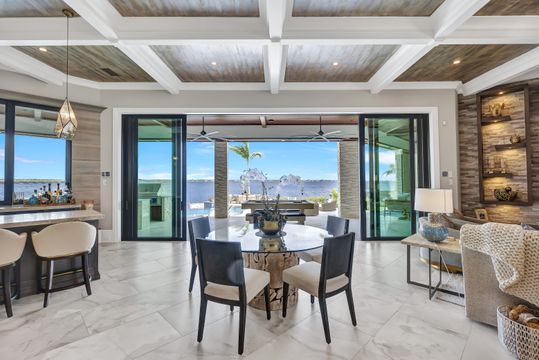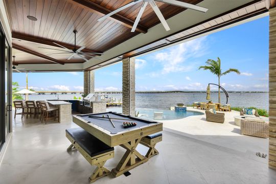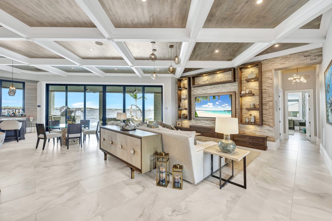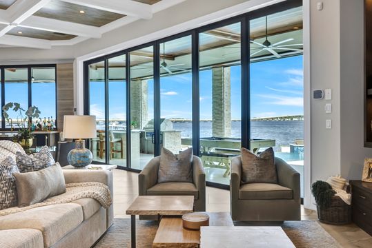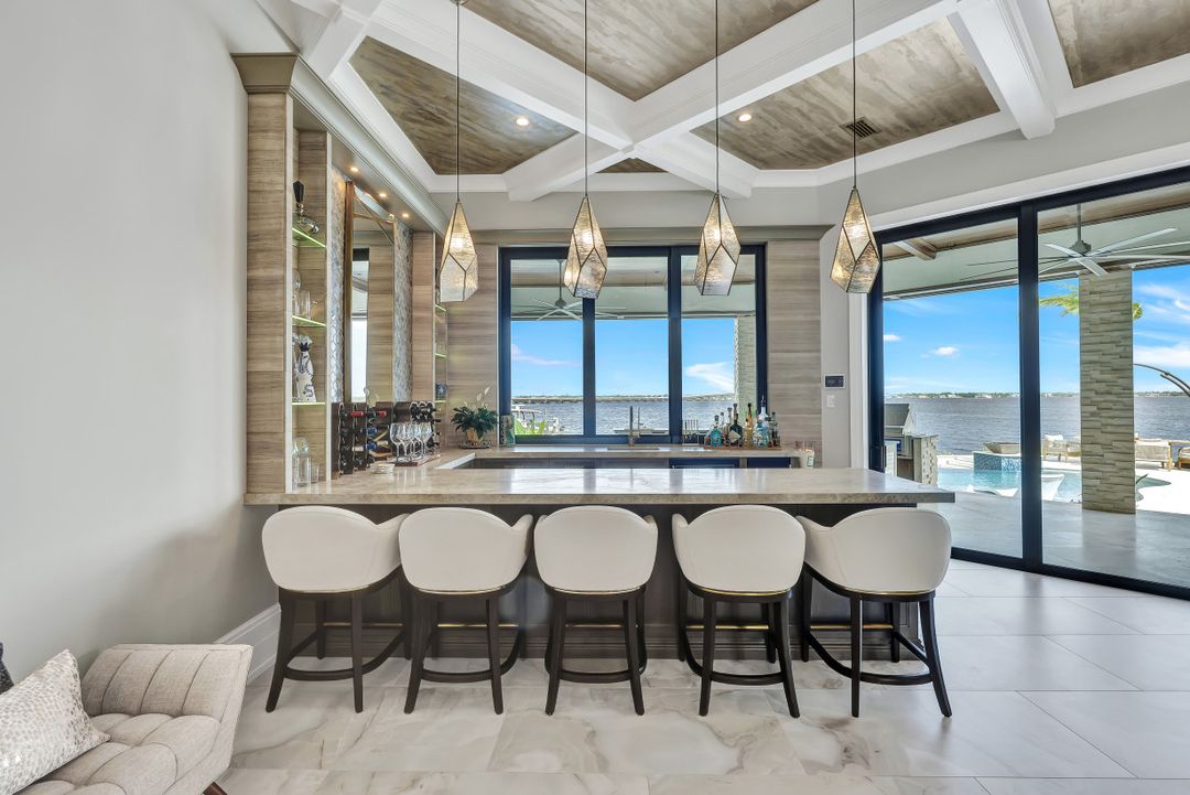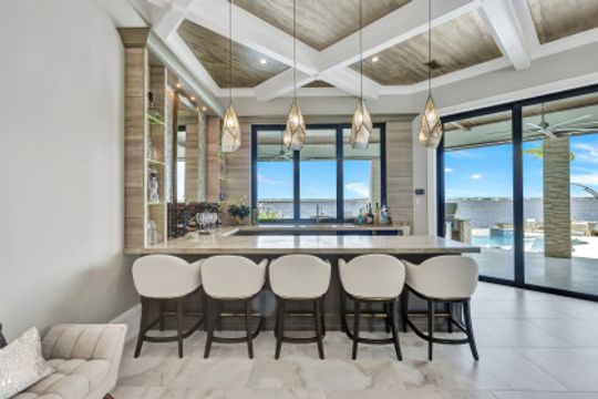 Open floor plan with soaring coffered ceilings, beautiful flooring, high-end lighting & fans, and the high attention to detail that Koogler Homes is known for. The family room overlooks the River out of an impressive 11 panels of impact windows and sliders. Your view evolves from sunrises in the morning, boats travelling the river in the afternoon, to a backlit cityscape at night. The living room offers a Home Theater Experience with custom designed feature wall, built-in entertainment, and whole home surround sound system. An entertainer's kitchen is open to the living space and offers the chef a gas range, gorgeous cabinetry, walk-in butler’s pantry, and high-end appliance package. No party is complete without an elegant waterfront bar with seating. Room for guests and family with two riverfront Master Suites. The formal master features a resort bathroom, elegant cabinetry, large custom closet, jetted tub, and Steam Shower. Visitors will appreciate that every bedroom has its own private en-suite full bathroom.