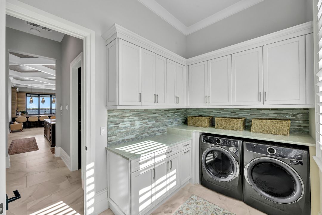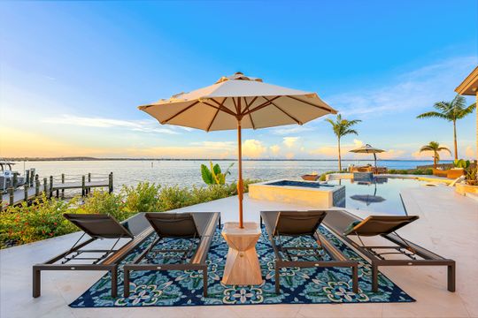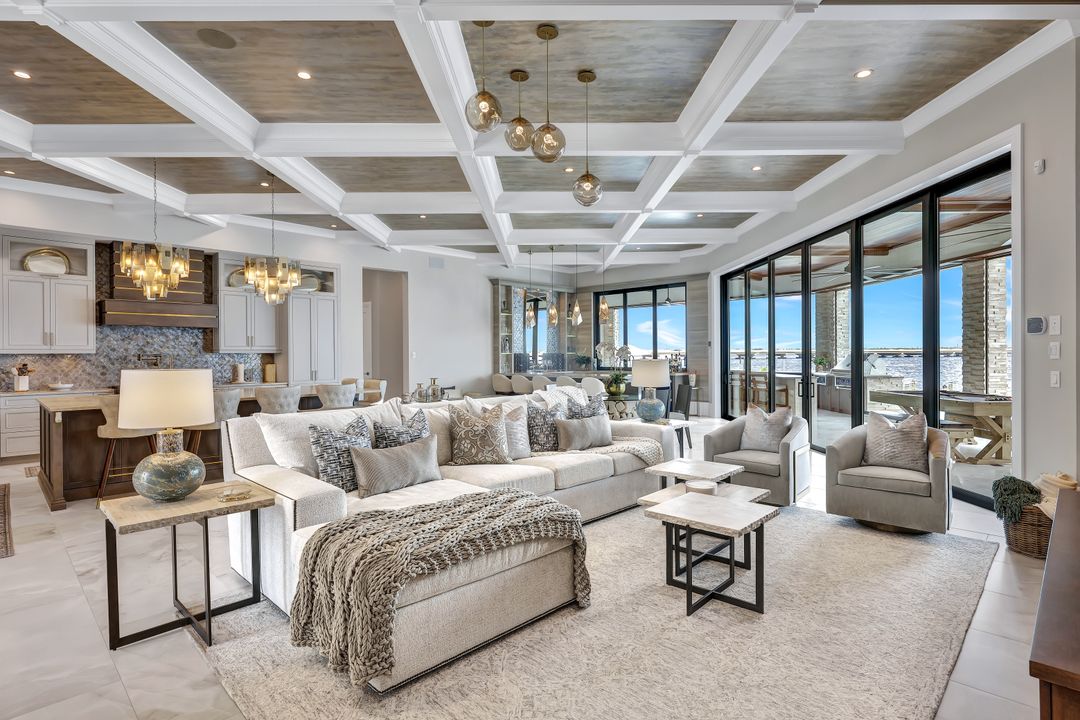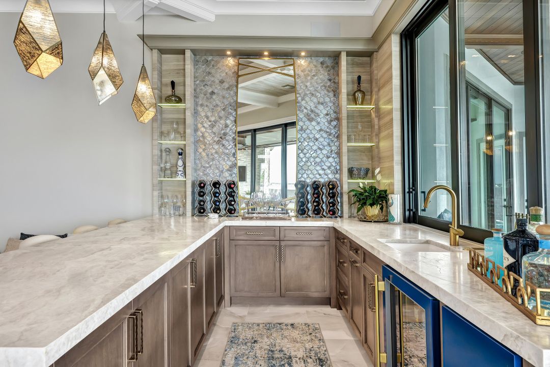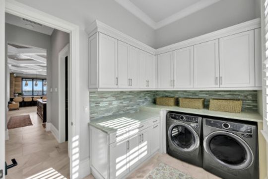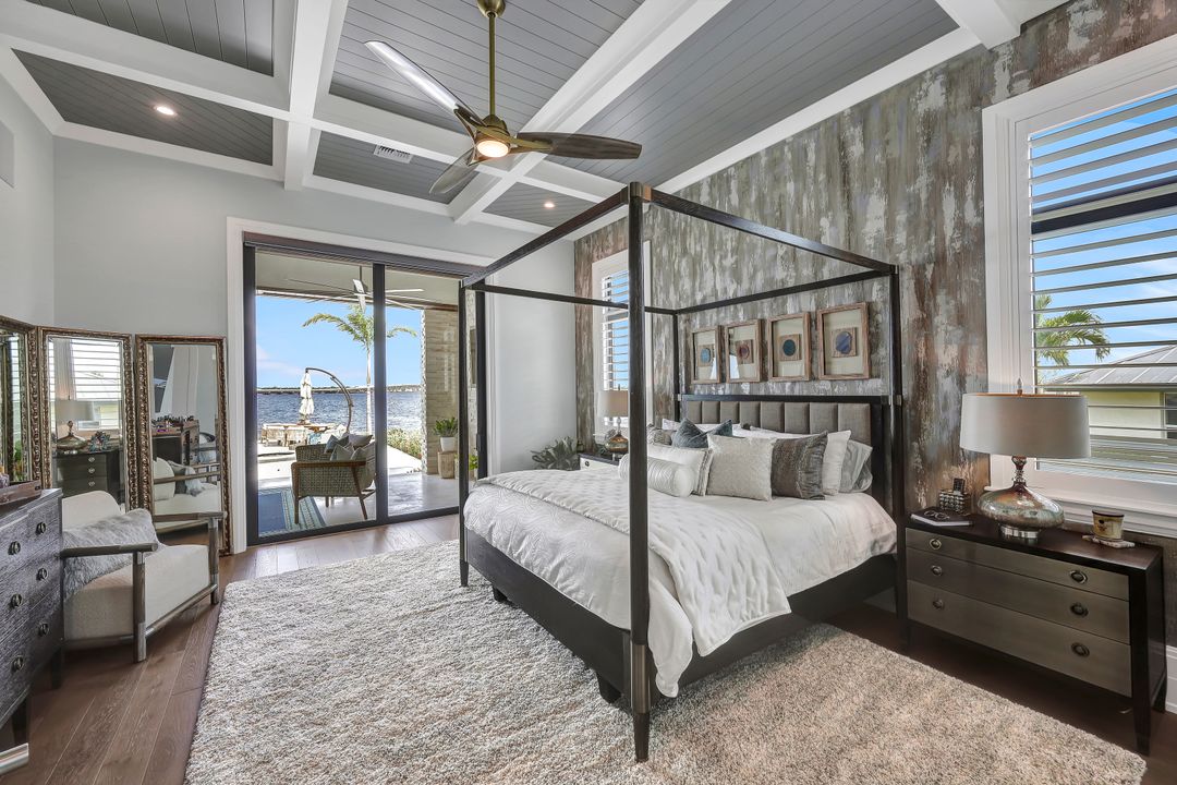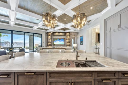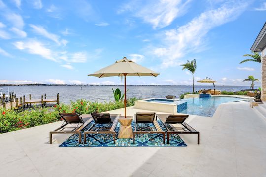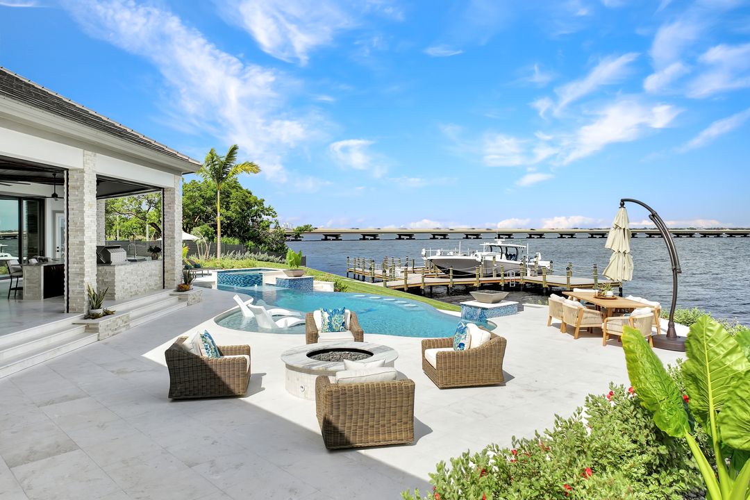 Open floor plan with soaring coffered ceilings, beautiful flooring, high-end lighting & fans, and the high attention to detail that Koogler Homes is known for. The family room overlooks the River out of an impressive 11 panels of impact windows and sliders. Your view evolves from sunrises in the morning, boats travelling the river in the afternoon, to a backlit cityscape at night. The living room offers a Home Theater Experience with custom designed feature wall, built-in entertainment, and whole home surround sound system. An entertainer's kitchen is open to the living space and offers the chef a gas range, gorgeous cabinetry, walk-in butler’s pantry, and high-end appliance package. No party is complete without an elegant waterfront bar with seating. Room for guests and family with two riverfront Master Suites. The formal master features a resort bathroom, elegant cabinetry, large custom closet, jetted tub, and Steam Shower. Visitors will appreciate that every bedroom has its own private en-suite full bathroom.