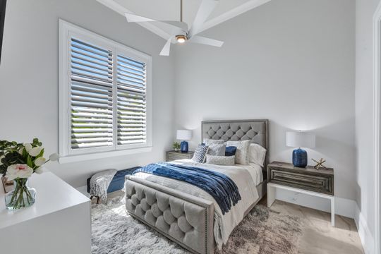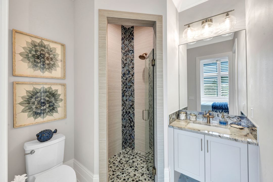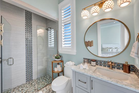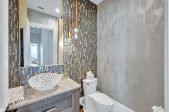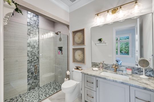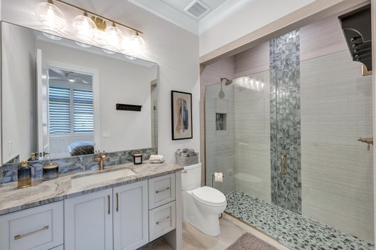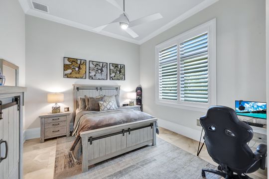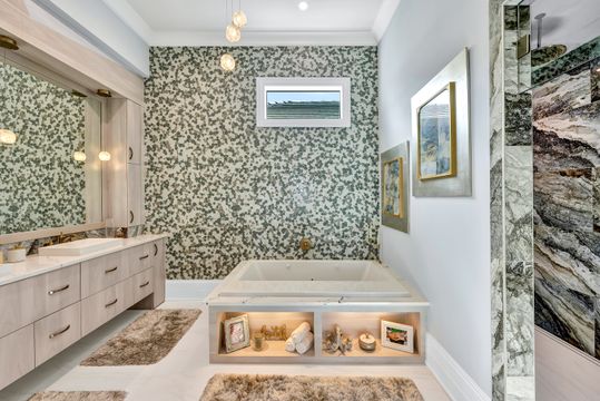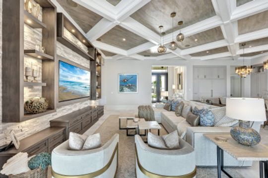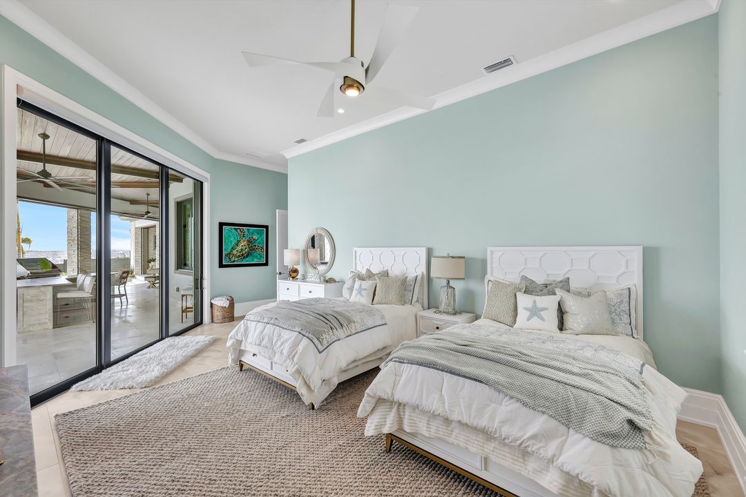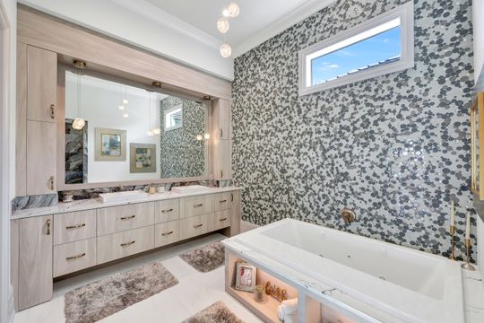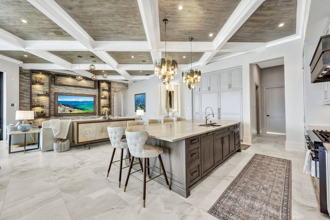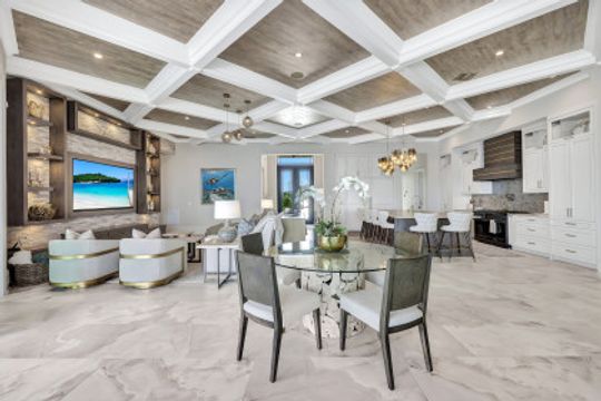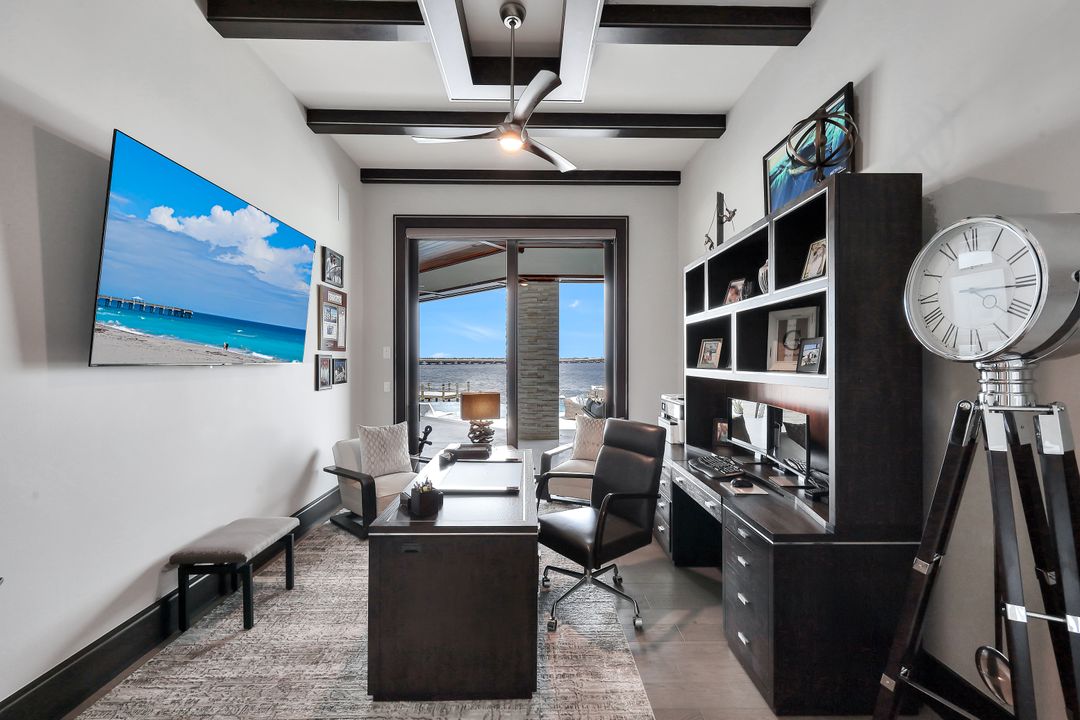 Open floor plan with soaring coffered ceilings, beautiful flooring, high-end lighting & fans, and the high attention to detail that Koogler Homes is known for. The family room overlooks the River out of an impressive 11 panels of impact windows and sliders. Your view evolves from sunrises in the morning, boats travelling the river in the afternoon, to a backlit cityscape at night. The living room offers a Home Theater Experience with custom designed feature wall, built-in entertainment, and whole home surround sound system. An entertainer's kitchen is open to the living space and offers the chef a gas range, gorgeous cabinetry, walk-in butler’s pantry, and high-end appliance package. No party is complete without an elegant waterfront bar with seating. Room for guests and family with two riverfront Master Suites. The formal master features a resort bathroom, elegant cabinetry, large custom closet, jetted tub, and Steam Shower. Visitors will appreciate that every bedroom has its own private en-suite full bathroom.