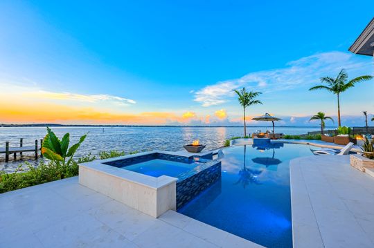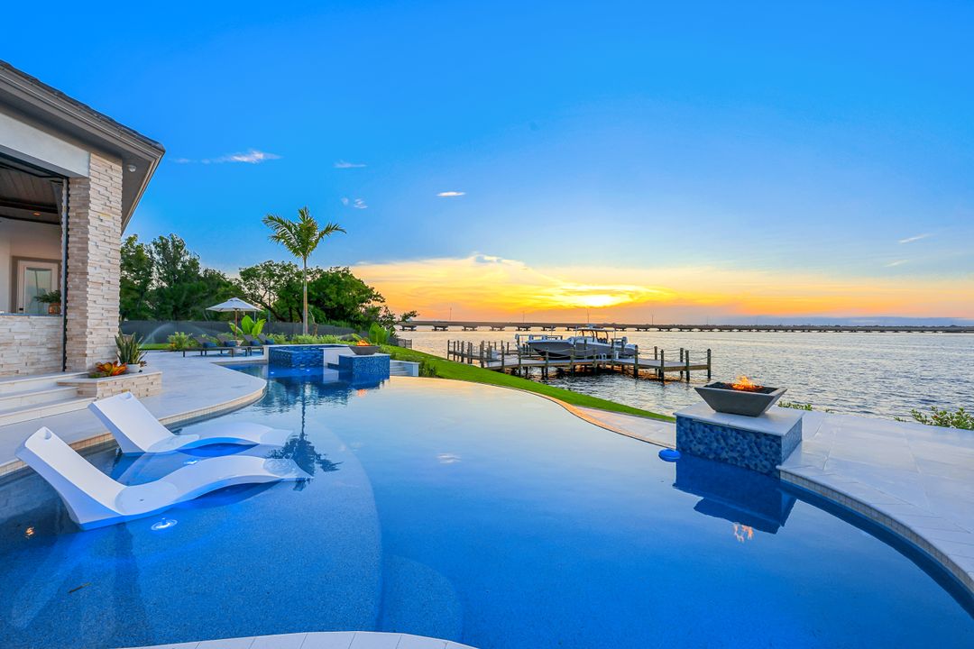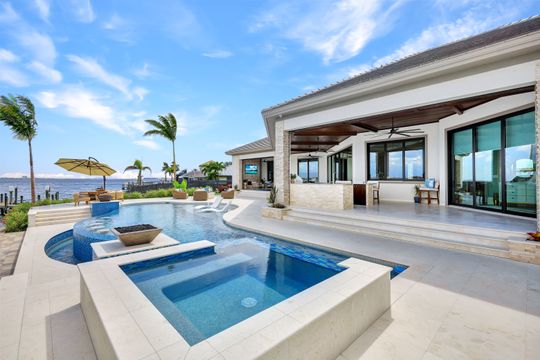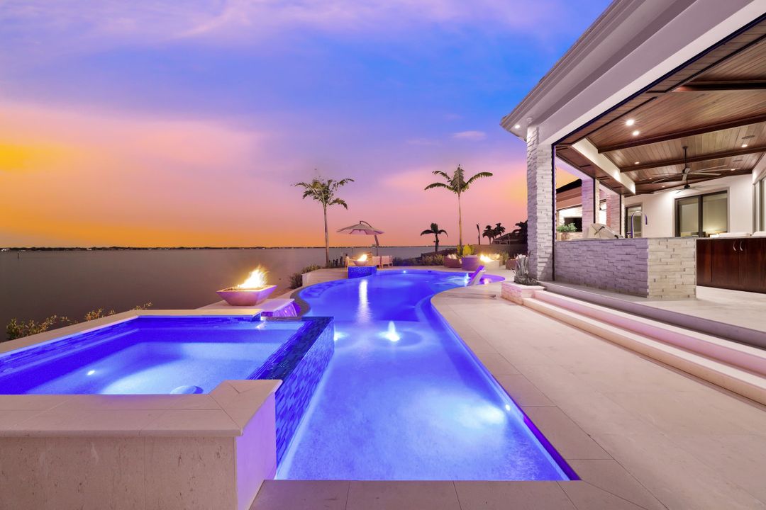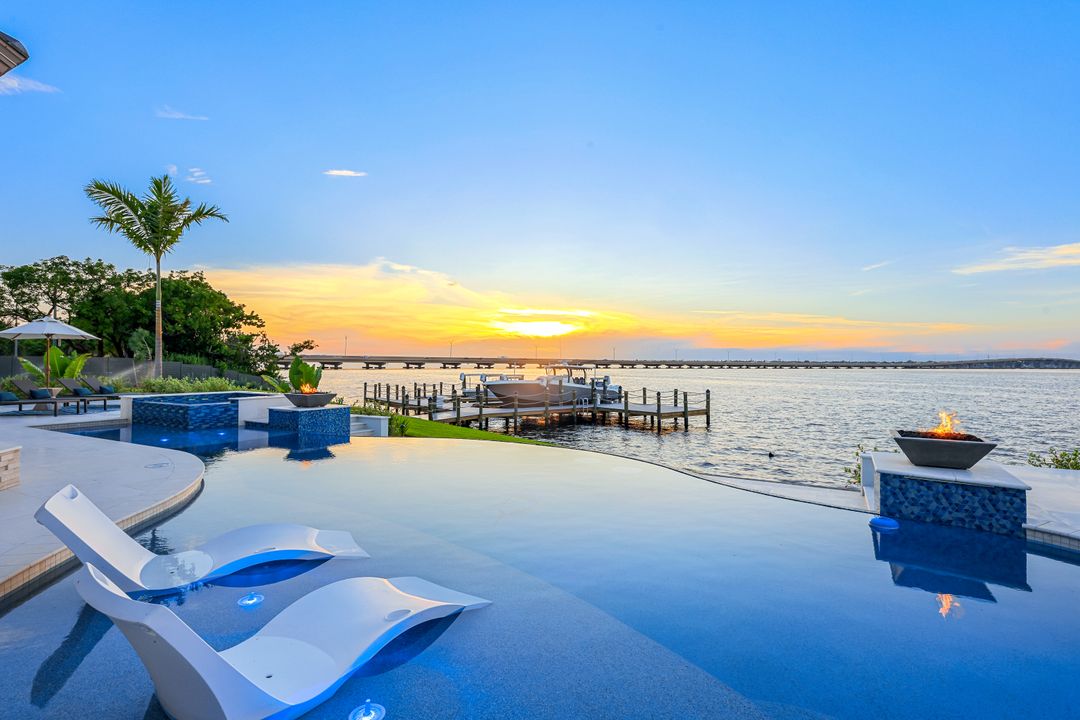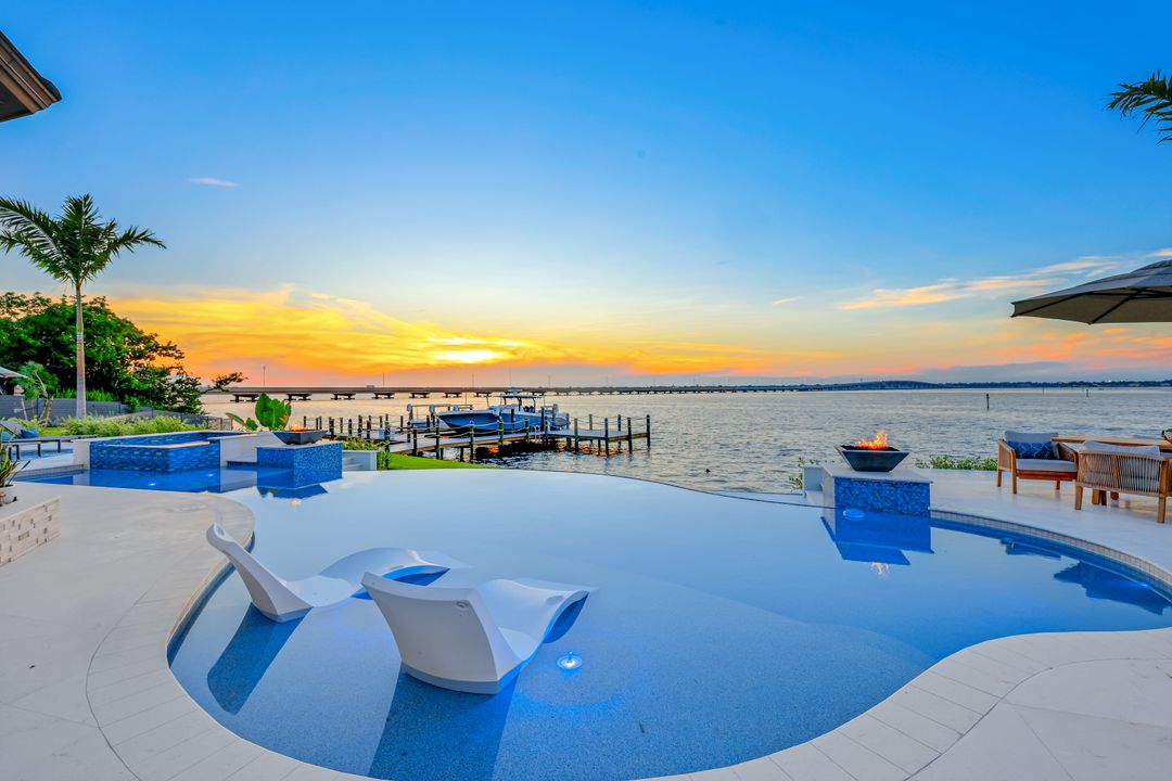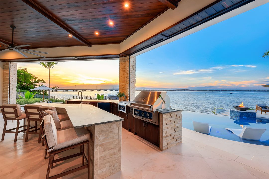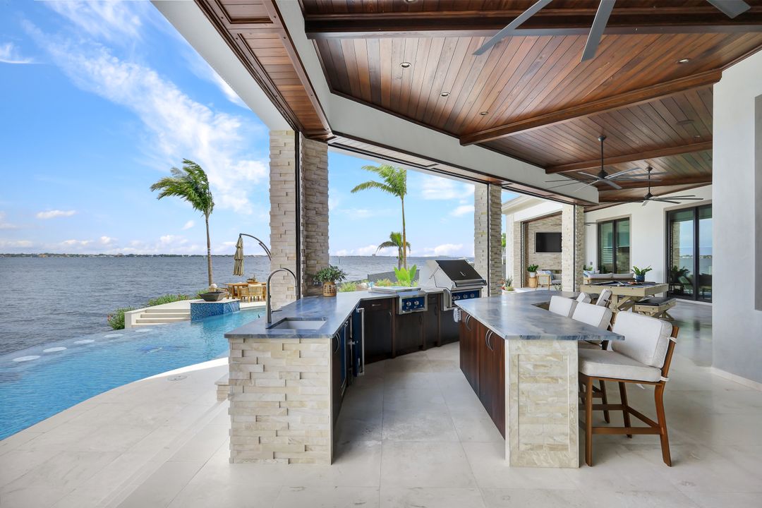 A waterfront Oasis with an outdoor living room with TV and fireplace, wood ceilings, a full outdoor kitchen with bar top seating, a waterside built-in firepit with seating. Take a dip in the infinity edge pool with fire bowls and an integrated hot tub. The lanai space is well over 1,000 SF offering ample space for to entertain, sunbath, and relax with friends and family.