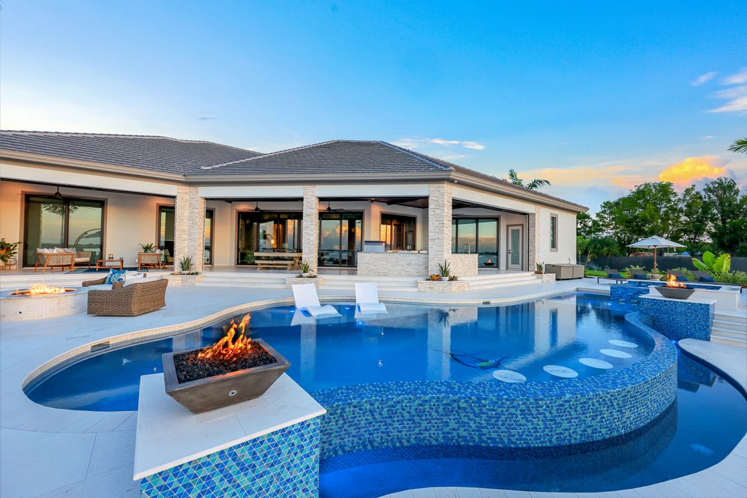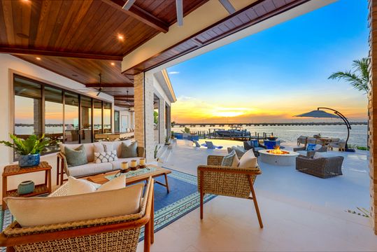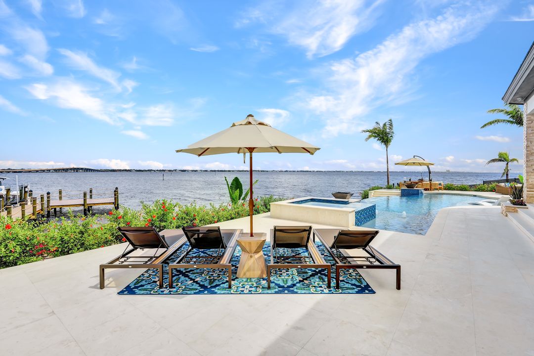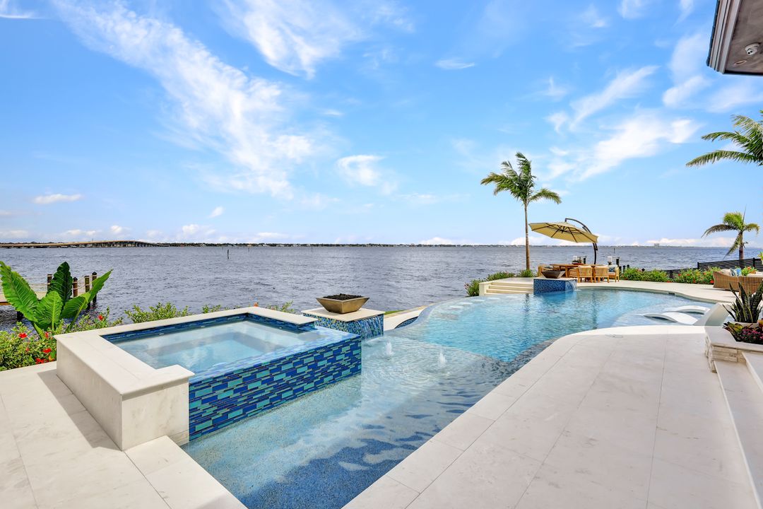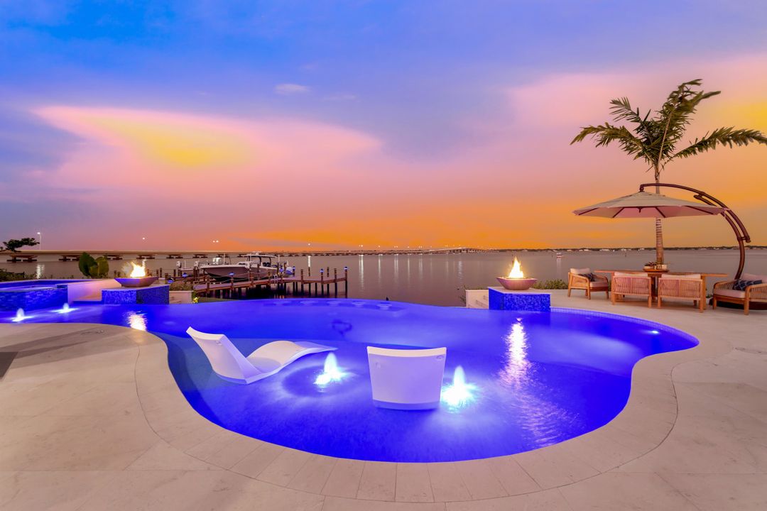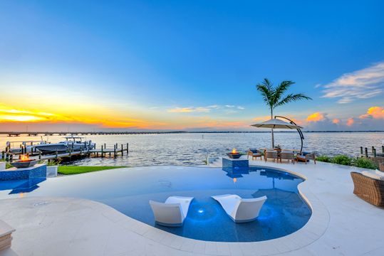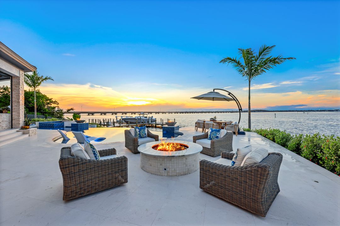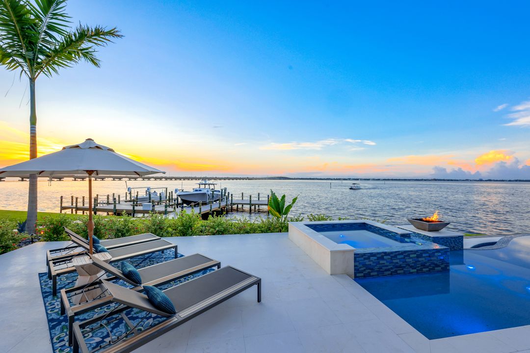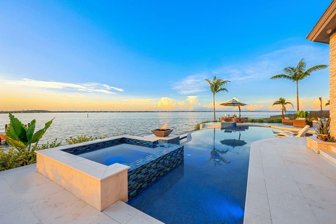 A waterfront Oasis with an outdoor living room with TV and fireplace, wood ceilings, a full outdoor kitchen with bar top seating, a waterside built-in firepit with seating. Take a dip in the infinity edge pool with fire bowls and an integrated hot tub. The lanai space is well over 1,000 SF offering ample space for to entertain, sunbath, and relax with friends and family.