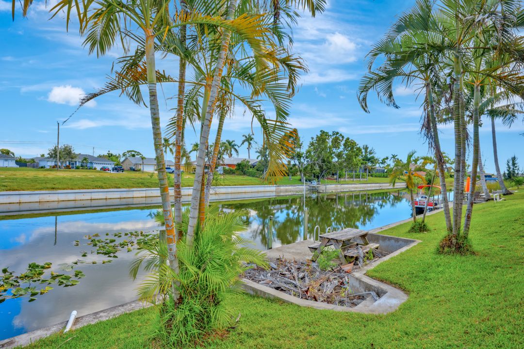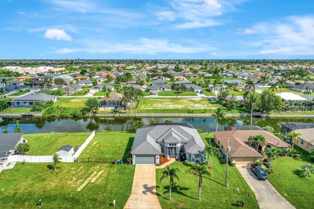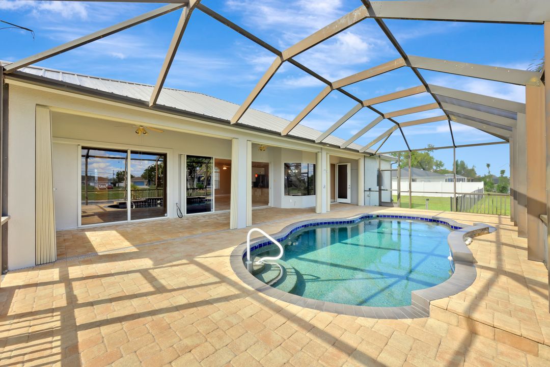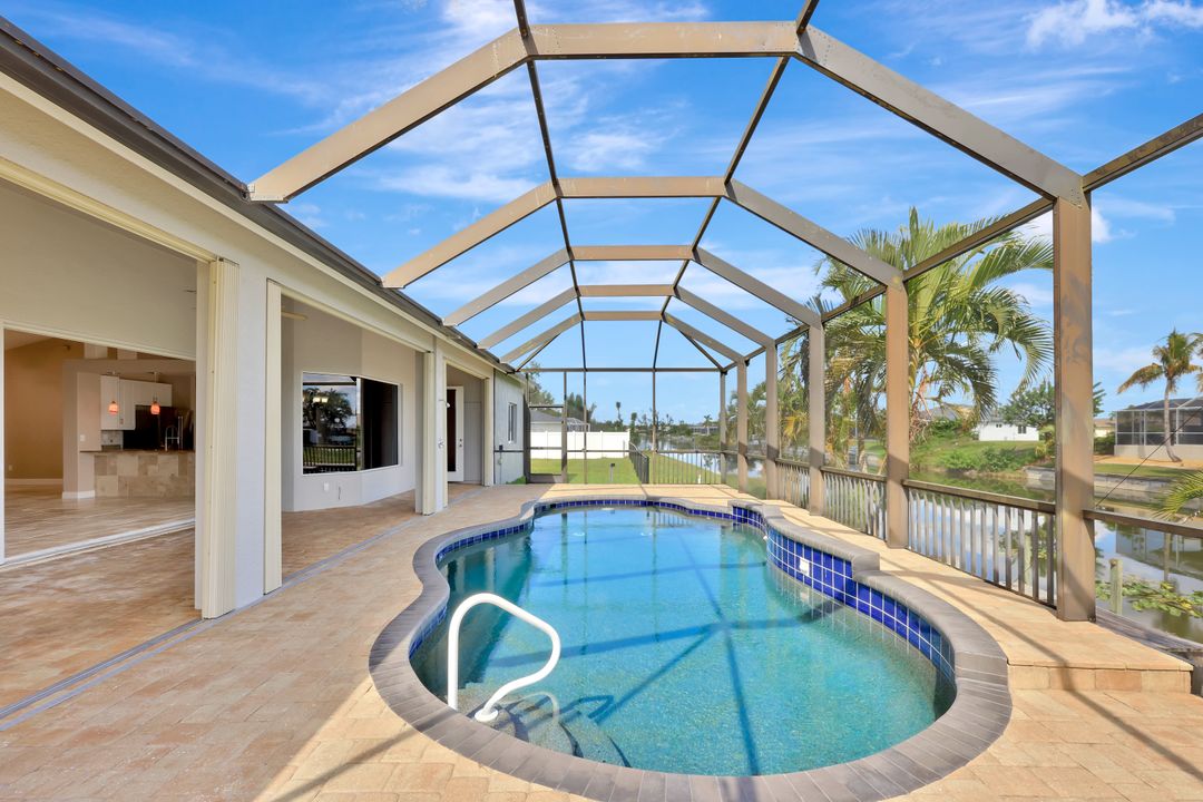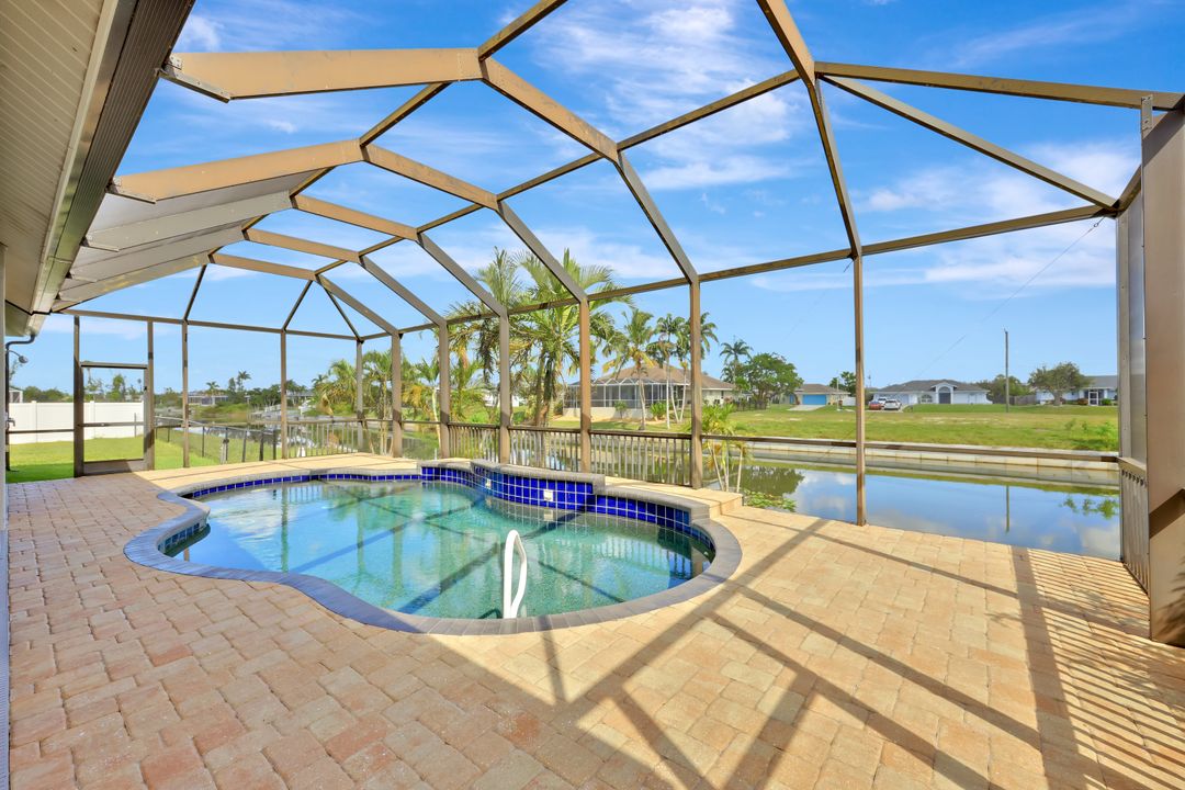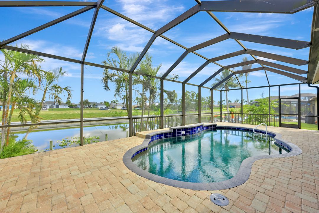 Motivated and Priced to sell! Fresh Water Pool Home on HUGE Fenced In Triple Lot! Nestled in sunny SW Cape Coral this 3BR, 2BA encompasses 2210 sqft of living space overlooking the Aries Canal. Recent Updates in 2023 Include - New Metal Roof, Pool Screen, Gutters, Pool Tile & Coping, Fresh Interior and Exterior Paint & Travertine Floors Refreshed. Step inside & you are greeted by the warm open floor plan, formal dining, spacious den, shimmering travertine flooring & high ceilings. The kitchen w/granite countertops is complemented by newer stainless steel appliances, plentiful cabinet space & nook area overlooking the pool & canal. The master suite is a private retreat w/double vanities, a luxurious soaking jetted tub & custom-designed closets, perfectly accentuated by the oversized walk-in shower. Outdoor living here is nothing short of spectacular. The expansive screened-in lanai invites you to unwind in the shade while overlooking the pavered pool area & canal. Dive into the heated pool, complete with mesmerizing waterfall feature & let the worries of the world wash away. Finally the oversized lot can be utilized as dog yard, kid play area OR dream big & build your own extended RV/toy garage in the future! Call today!