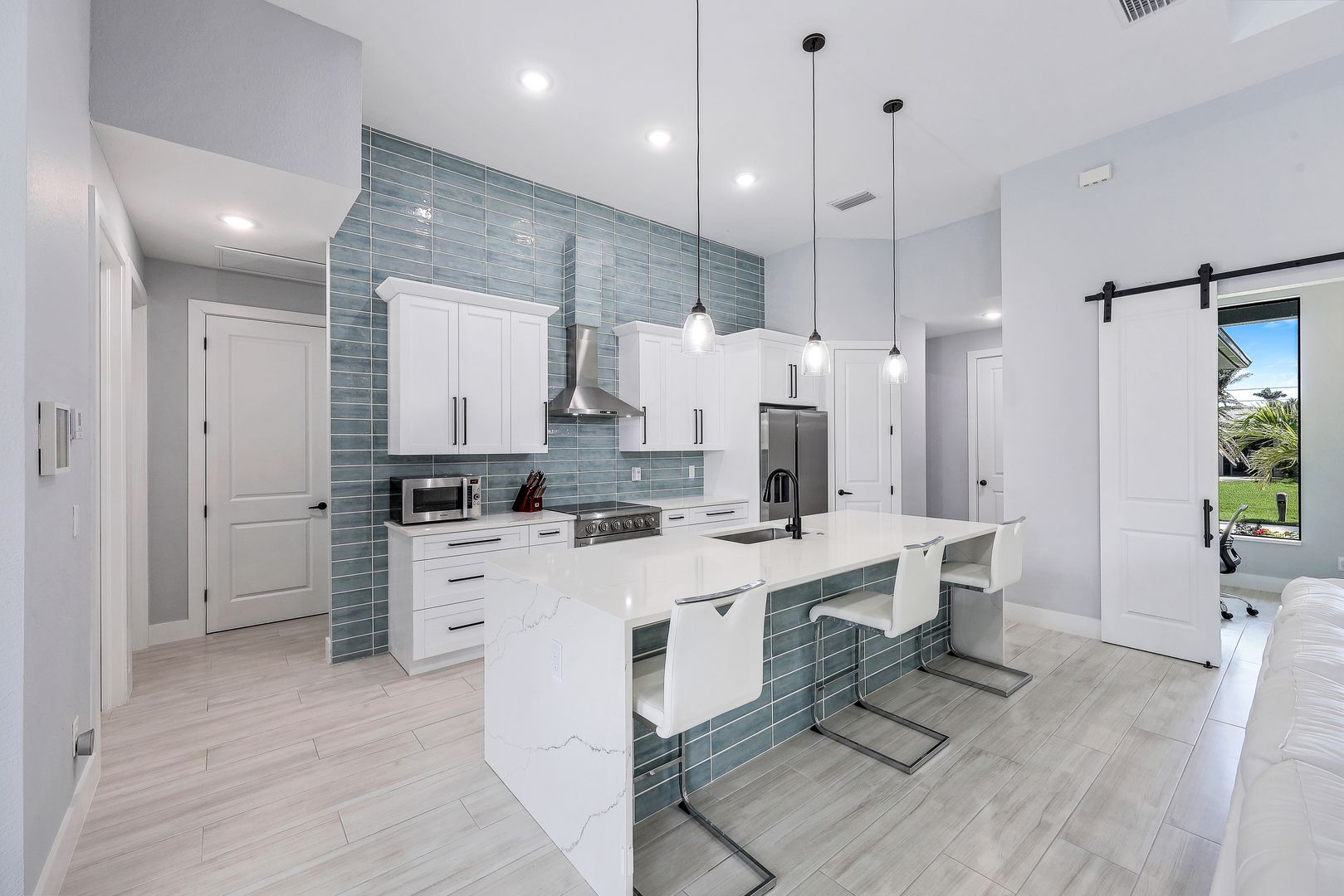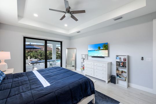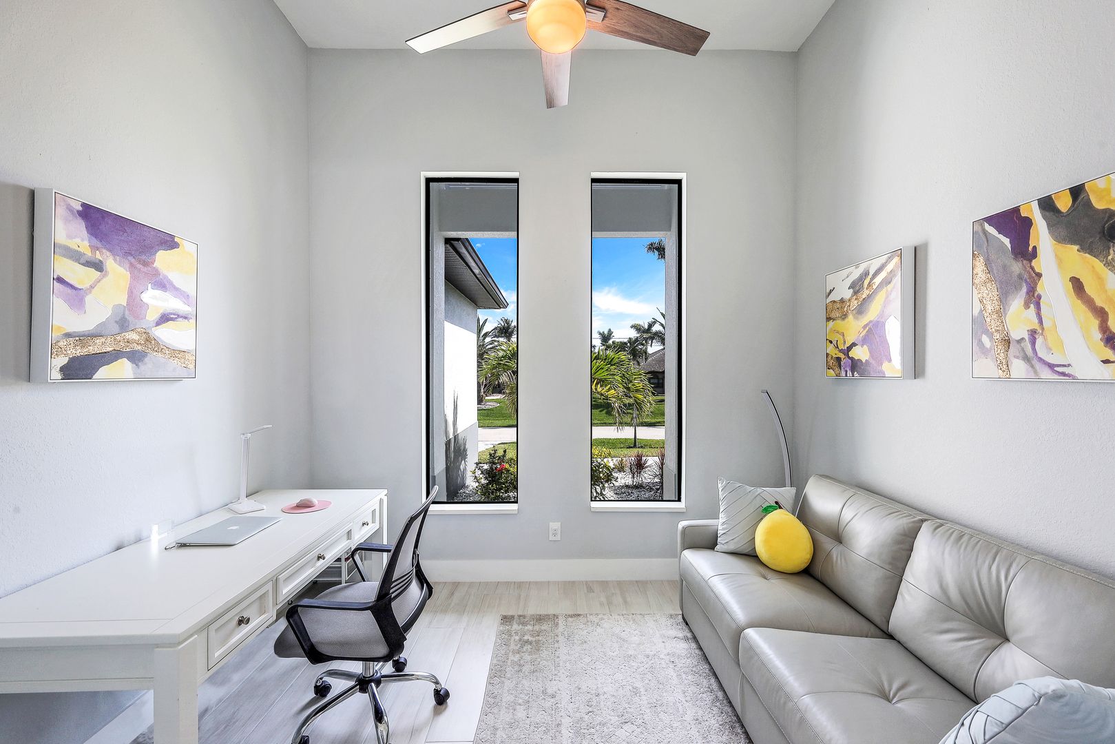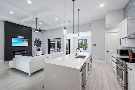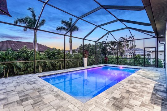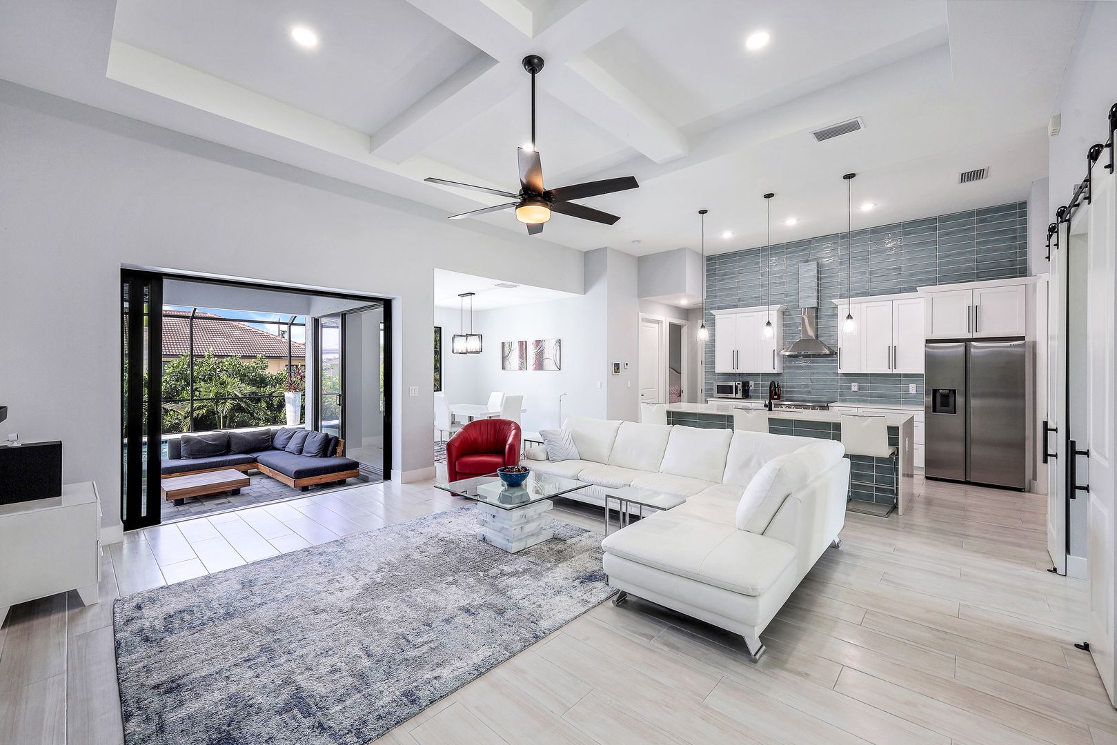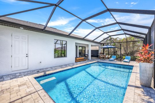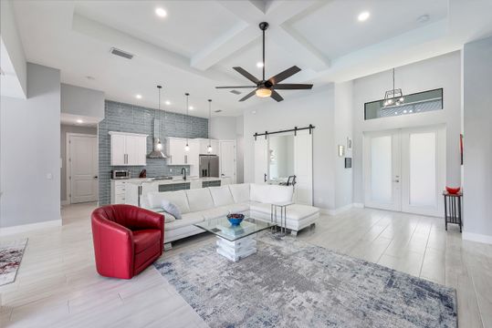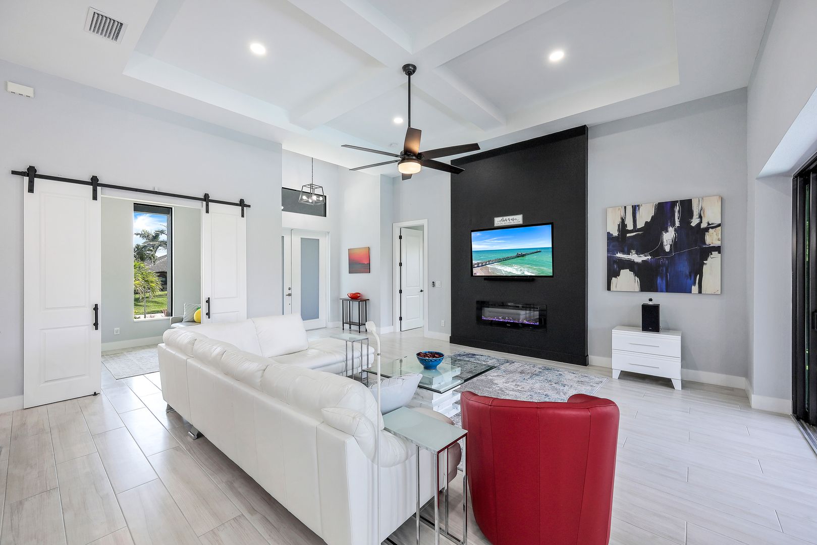 Stunning 1 year old Pool Home in SW Cape Coral! Loaded with features rarely found in new homes, this 3 Bed 2 Full Bath with an Office/den is perfect! Modern & inviting w/ 12 ft coffer ceilings in the living room, 9.4 ceilings in the bedrooms, porcelain tile throughout (no carpet), custom wood storage in every closet & pantry, and high-end lighting & fans. Relax in the living room w/ feature wall & fireplace with lots of natural light from the double sliders. Kitchen features waterfall quartz island, stainless appliances, upgraded professional stove, and tile backsplash all the way to the ceiling! Den/Office includes a sliding barn door for privacy and12 ft Coffer Ceiling. Master suite overlooks the pool & magnificent spa bath with floor to ceiling glass tile, dual vanities, 2 walk-in closets w/ wood shelving. Spare bedrooms w/walk in closets. 1200 SQFT Patio with extra deep Saltwater Heated & Lighted Pool overlooking tropical palms and $7,500 added lush clusia & Palm Trees for privacy! Home built high 9.5 Elevation - safe from flooding. Quiet neighborhood by high-end waterfront homes, the area's best restaurants, shopping, schools, and the new Sands Park & walking trails nearby!