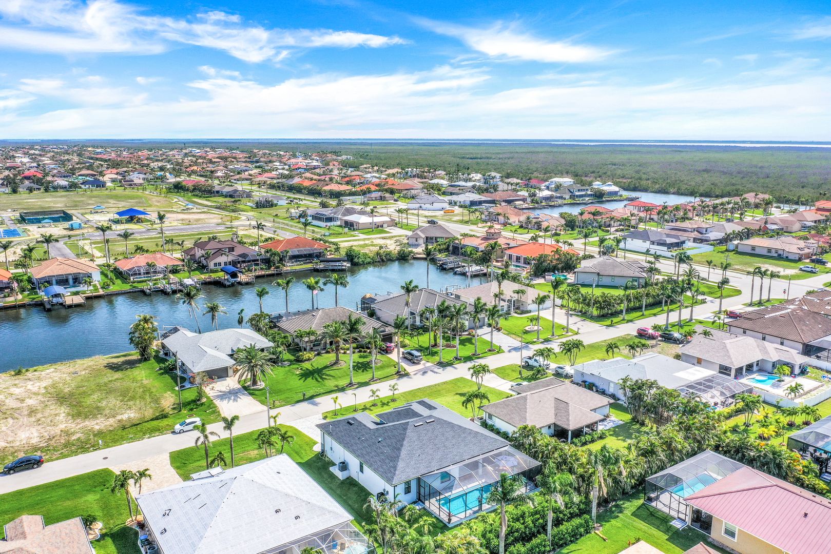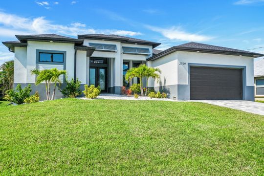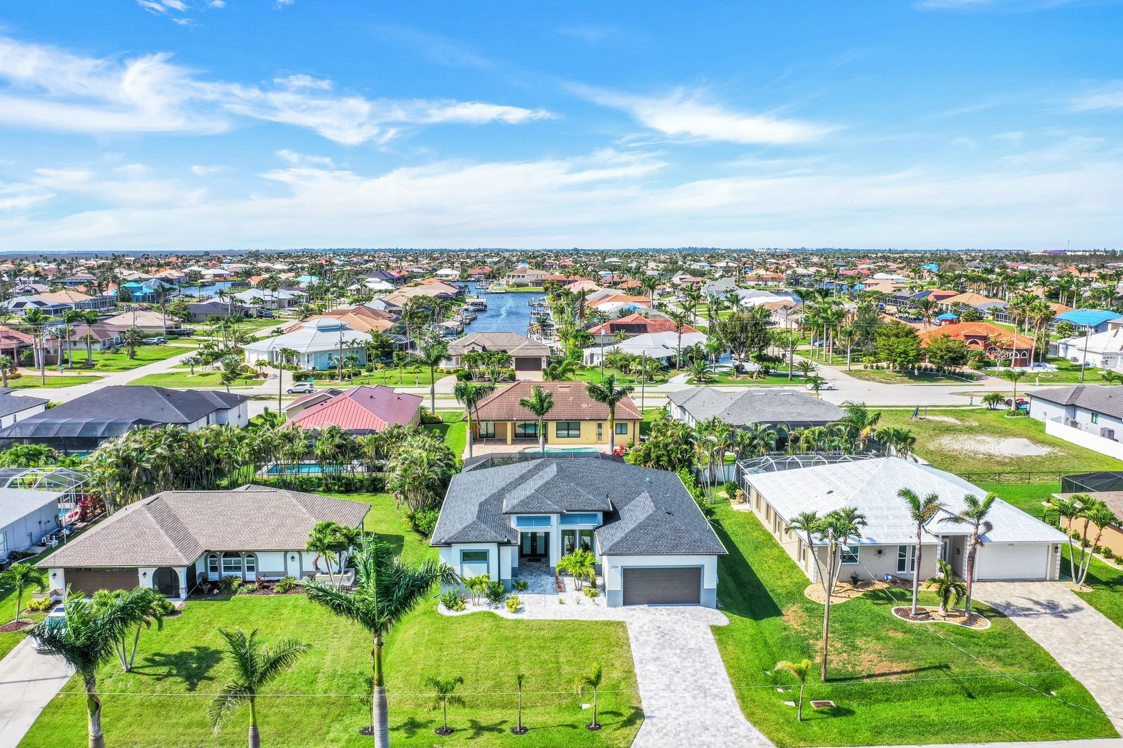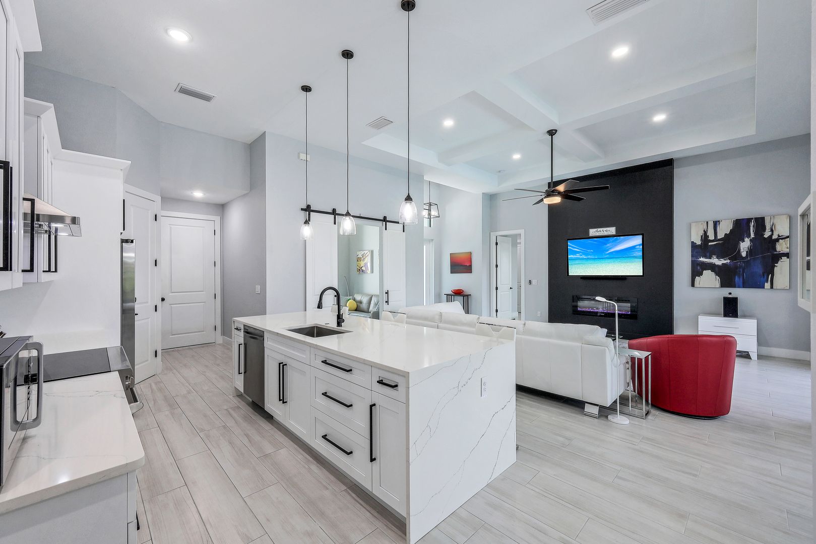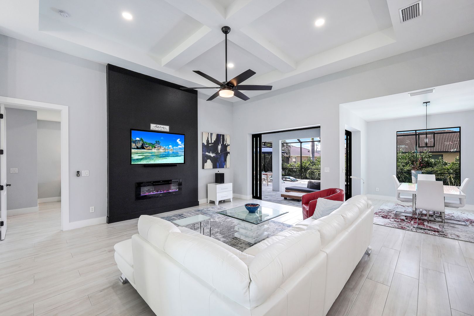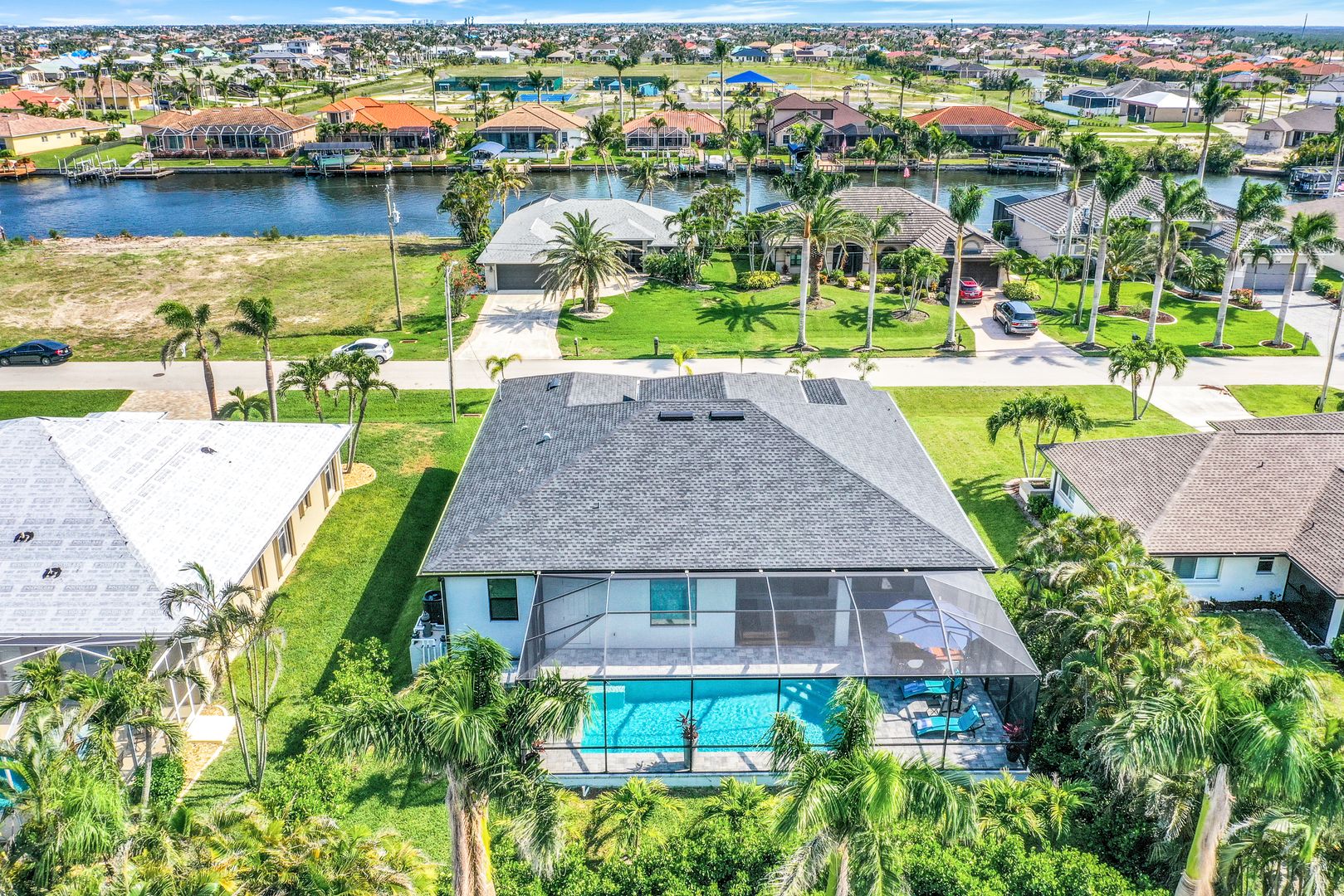 Stunning 1 year old Pool Home in SW Cape Coral! Loaded with features rarely found in new homes, this 3 Bed 2 Full Bath with an Office/den is perfect! Modern & inviting w/ 12 ft coffer ceilings in the living room, 9.4 ceilings in the bedrooms, porcelain tile throughout (no carpet), custom wood storage in every closet & pantry, and high-end lighting & fans. Relax in the living room w/ feature wall & fireplace with lots of natural light from the double sliders. Kitchen features waterfall quartz island, stainless appliances, upgraded professional stove, and tile backsplash all the way to the ceiling! Den/Office includes a sliding barn door for privacy and12 ft Coffer Ceiling. Master suite overlooks the pool & magnificent spa bath with floor to ceiling glass tile, dual vanities, 2 walk-in closets w/ wood shelving. Spare bedrooms w/walk in closets. 1200 SQFT Patio with extra deep Saltwater Heated & Lighted Pool overlooking tropical palms and $7,500 added lush clusia & Palm Trees for privacy! Home built high 9.5 Elevation - safe from flooding. Quiet neighborhood by high-end waterfront homes, the area's best restaurants, shopping, schools, and the new Sands Park & walking trails nearby!