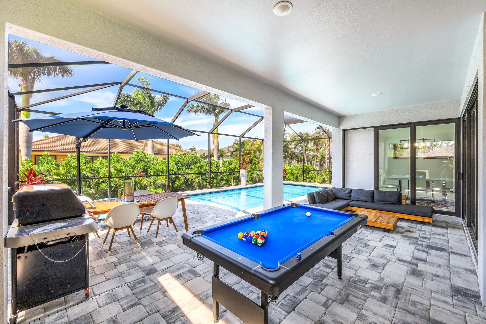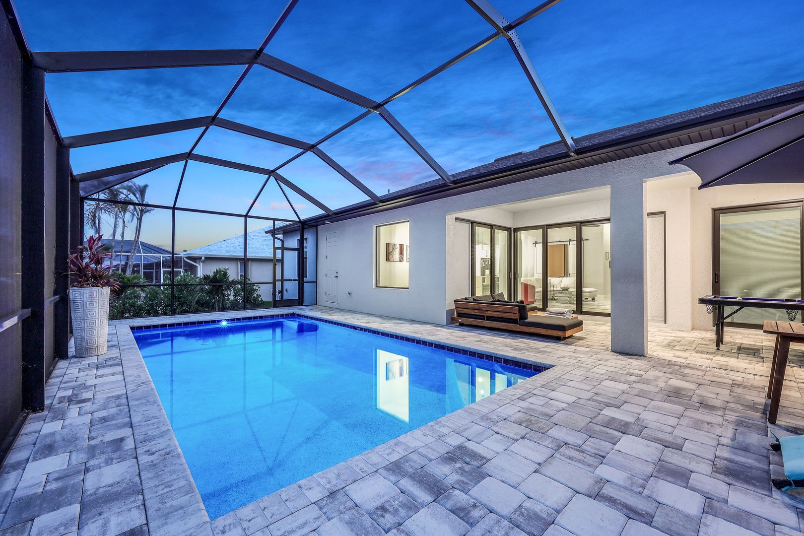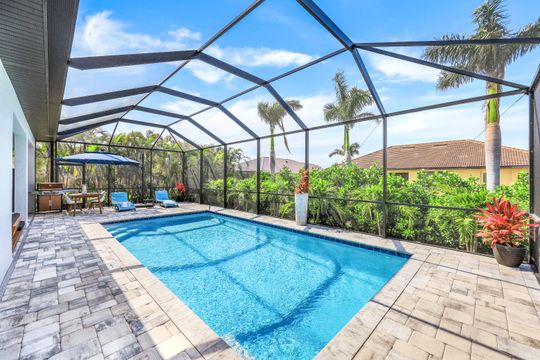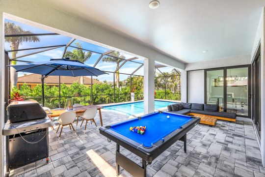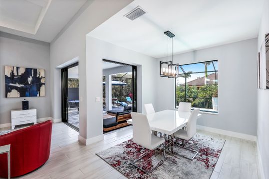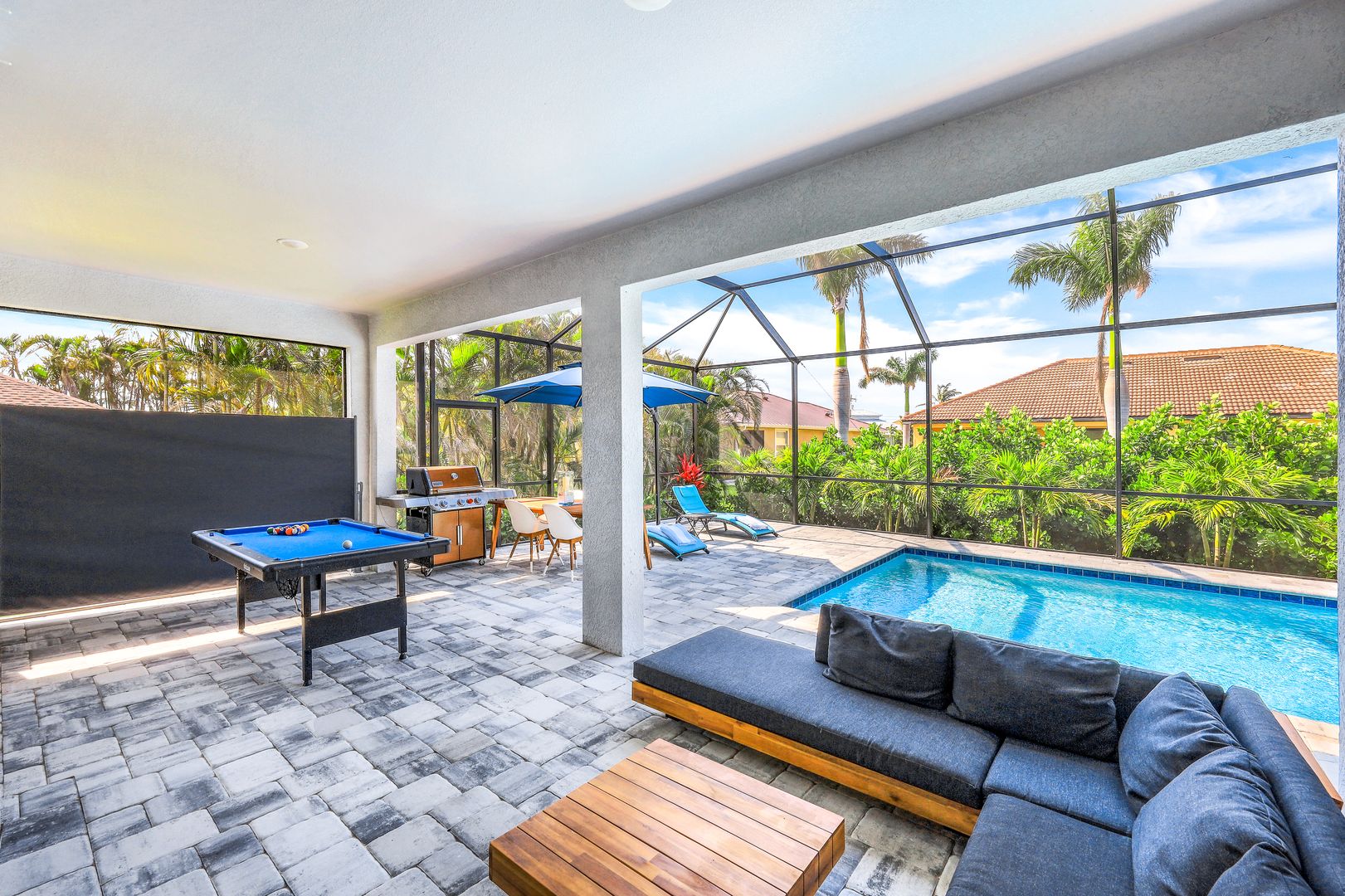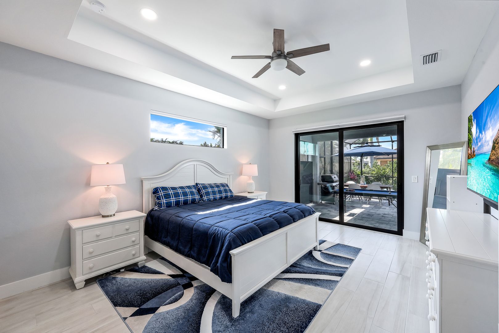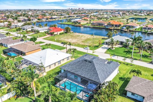 Stunning 1 year old Pool Home in SW Cape Coral! Loaded with features rarely found in new homes, this 3 Bed 2 Full Bath with an Office/den is perfect! Modern & inviting w/ 12 ft coffer ceilings in the living room, 9.4 ceilings in the bedrooms, porcelain tile throughout (no carpet), custom wood storage in every closet & pantry, and high-end lighting & fans. Relax in the living room w/ feature wall & fireplace with lots of natural light from the double sliders. Kitchen features waterfall quartz island, stainless appliances, upgraded professional stove, and tile backsplash all the way to the ceiling! Den/Office includes a sliding barn door for privacy and12 ft Coffer Ceiling. Master suite overlooks the pool & magnificent spa bath with floor to ceiling glass tile, dual vanities, 2 walk-in closets w/ wood shelving. Spare bedrooms w/walk in closets. 1200 SQFT Patio with extra deep Saltwater Heated & Lighted Pool overlooking tropical palms and $7,500 added lush clusia & Palm Trees for privacy! Home built high 9.5 Elevation - safe from flooding. Quiet neighborhood by high-end waterfront homes, the area's best restaurants, shopping, schools, and the new Sands Park & walking trails nearby!