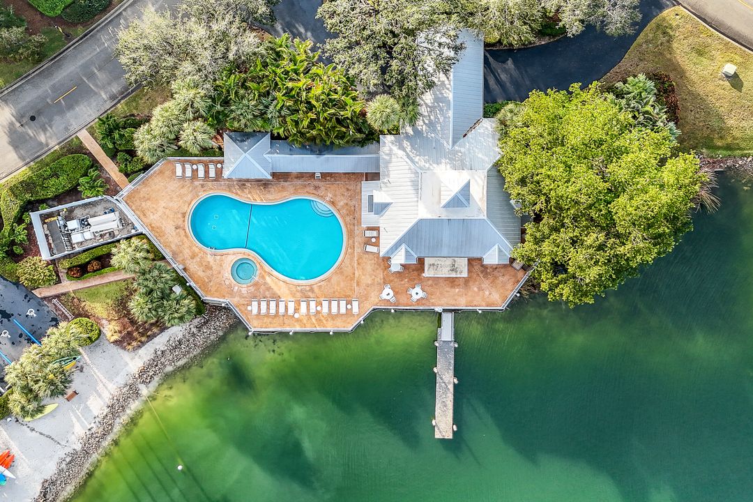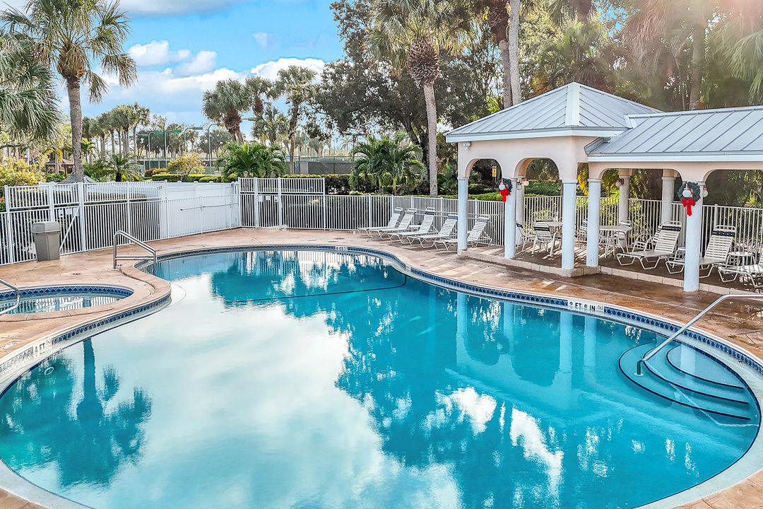 Two swimming pools, spa, and a two-story clubhouse featuring a sauna, weight room, library, game rooms, and kitchen facilities.