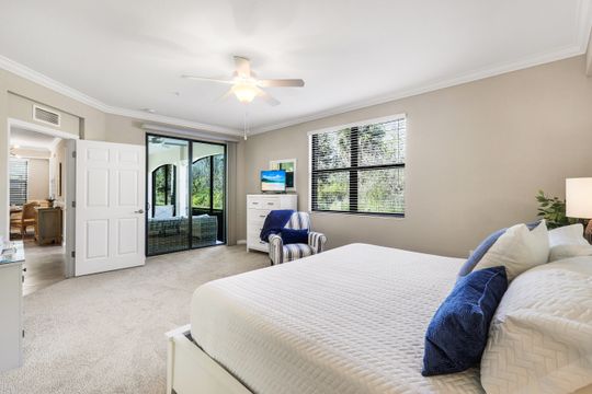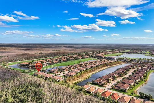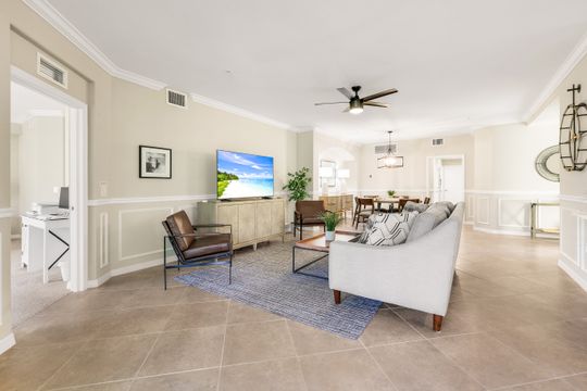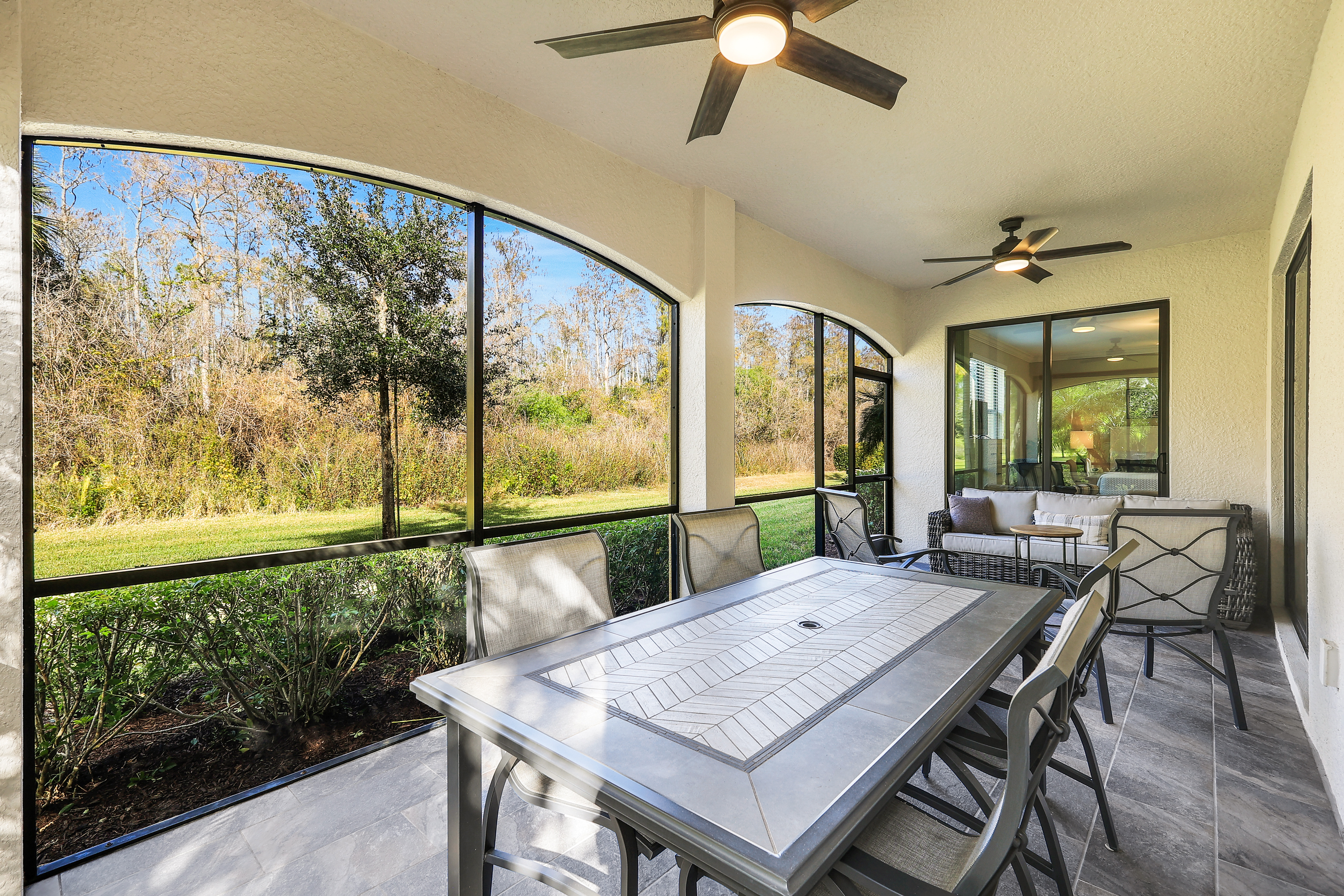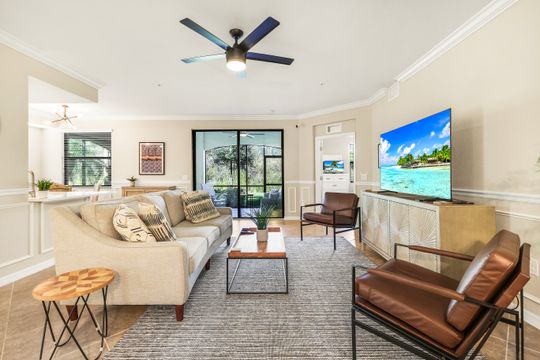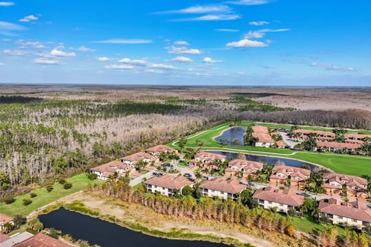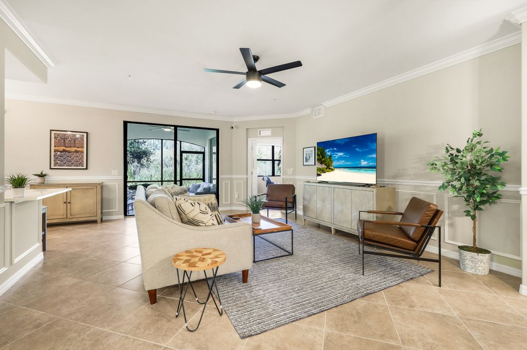 SOCIAL MEMBERSHIP INCLUDED! Step into this beautifully appointed, and turnkey first-floor corner coach home, featuring three spacious bedrooms, two full baths, and a two-car attached garage. The moment you enter, you’ll appreciate the exquisite details—crown molding, elegant wainscoting, and diagonally laid tile flooring. The open Great Room floor plan is perfect for entertaining, while the kitchen is discreetly tucked behind a wall to keep your living spaces neat and inviting. The primary suite serves as a private retreat with dual walk-in closets and a luxurious bathroom featuring an oversized soaking tub, separate shower, and dual vanities. A split-bedroom design ensures privacy for guests with two additional bedrooms and a full bath. Enjoy casual meals or game nights in the charming breakfast nook, and host more formal gatherings in the defined dining area of the Great Room. Unwind on the spacious screened lanai overlooking tranquil wooded views for ultimate privacy. Tucked away on a quiet cul-de-sac, this home offers a peaceful setting to embrace the SWFL lifestyle. Residents have access to an amenity-rich center with a lagoon-style pool featuring a waterfall and lap lanes, poolside cabanas and café, a state-of-the-art fitness center, the U-Topia full-service spa and sauna, and a stunning clubhouse offering fine dining, game rooms, and meeting spaces.