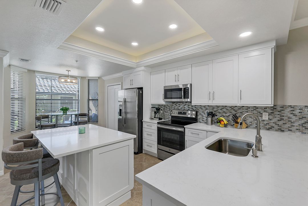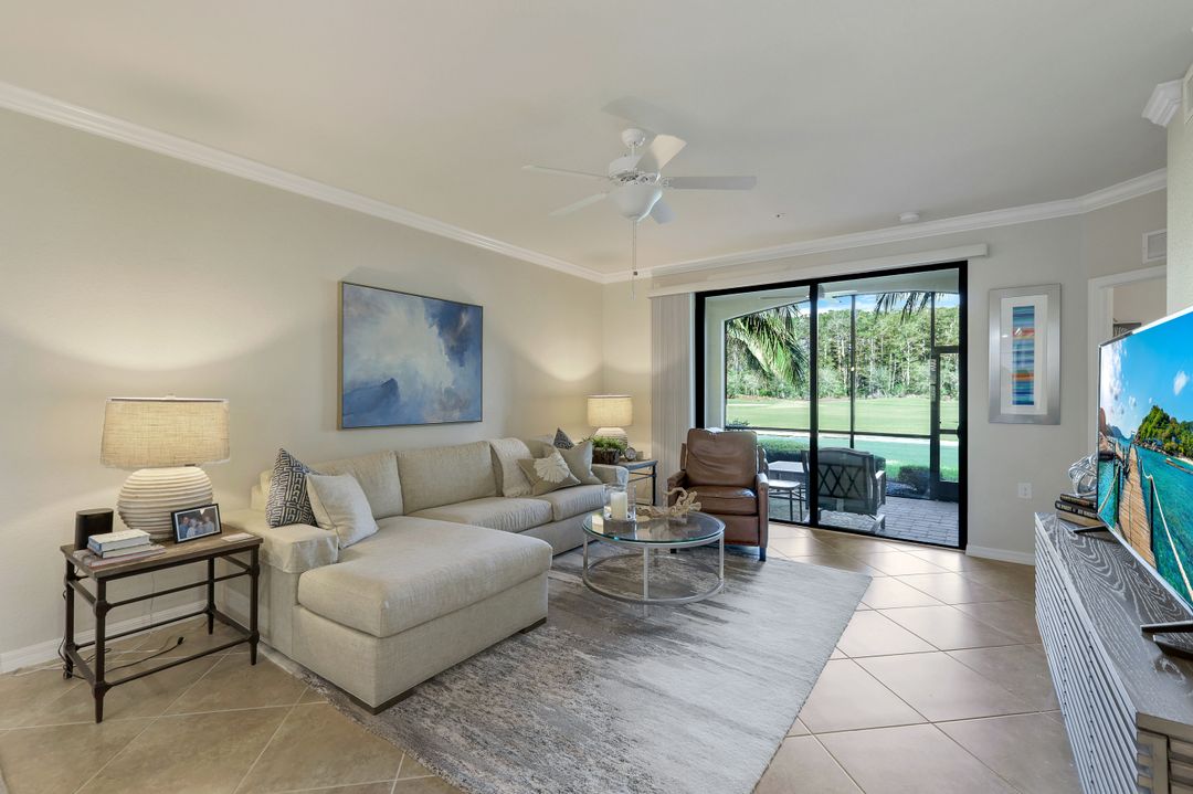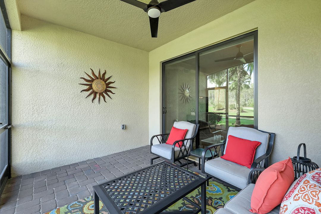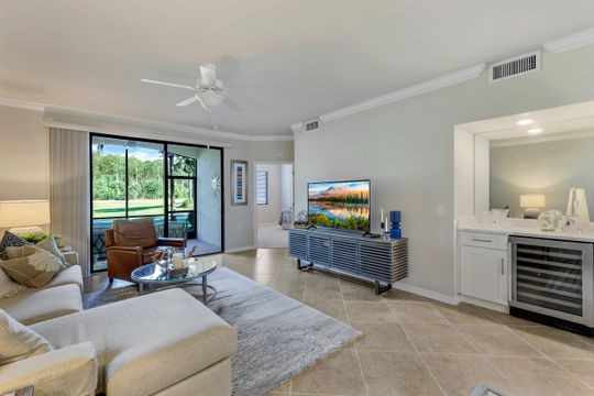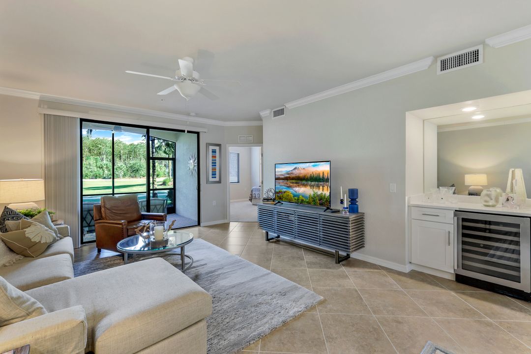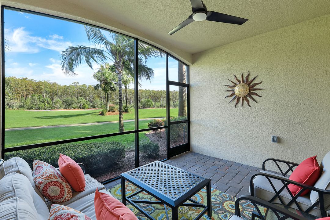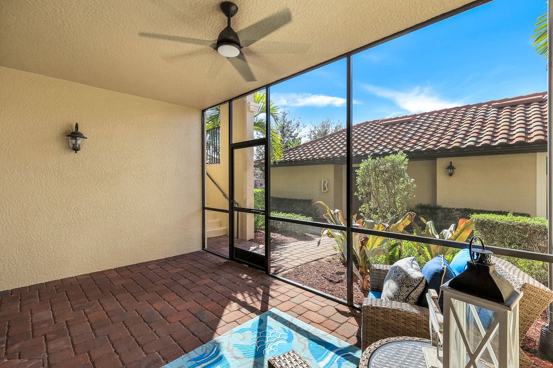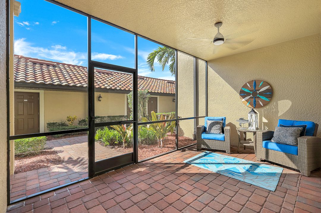 GOLF INCLUDED with this stunning, end unit veranda condo conveniently located on the first floor. Boasting breathtaking sunrise views over the golf course from your rear lanai, while the front lanai offers relaxing sunset views, both screened in. With 2 bedrooms, 2 bathrooms, and a flex room, this unit offers comfort and flexibility. The kitchen and baths have all been updated, featuring stylish white cabinets and beautiful quartz countertops. Additionally, the condo includes a one car garage just steps away and perfect for storing your Florida toys and auto. Amenity Rich Bonita National offers 18 competitive holes of golf with putting green and aqua range, lighted har-tru tennis courts, a state-of-the-art fitness facility, complete with exercise rooms. When it's time to relax, you can utilize the full service salon and sauna. For sheer fun there's the lagoon pool complete with waterfall, lap lanes, poolside cabanas and bar/grill offering chair service! Enjoy a more formal dining fare in the opulent clubhouse with game and meeting rooms, lockers and more!