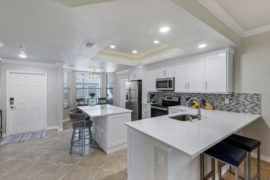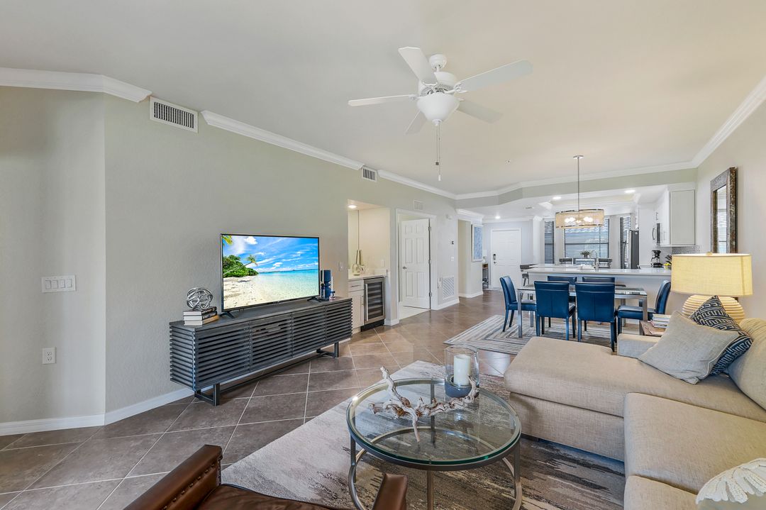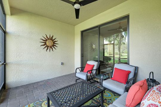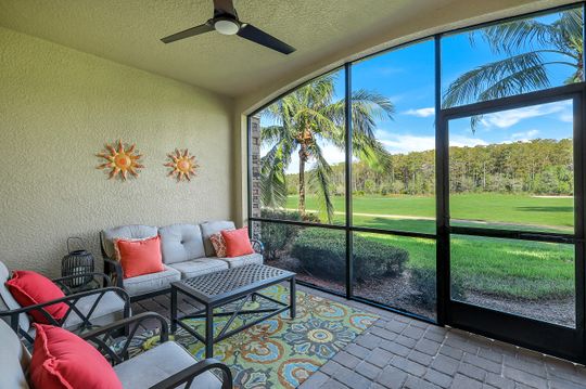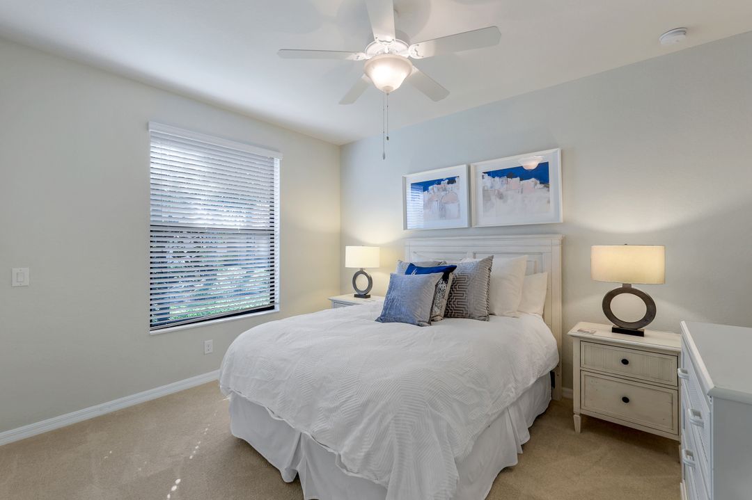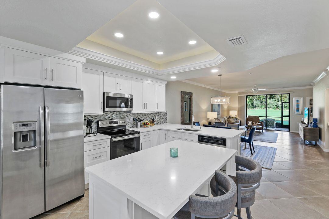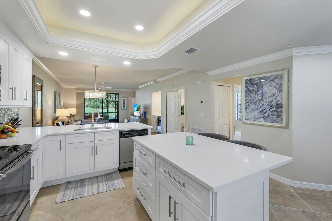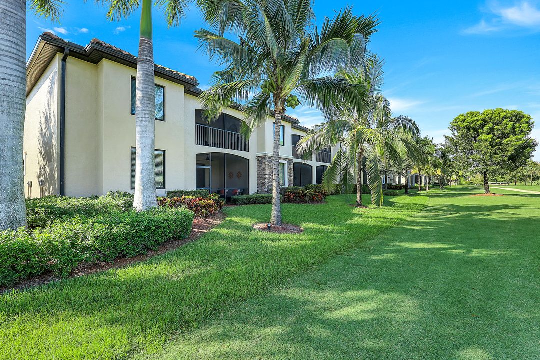 GOLF INCLUDED with this stunning, end unit veranda condo conveniently located on the first floor. Boasting breathtaking sunrise views over the golf course from your rear lanai, while the front lanai offers relaxing sunset views, both screened in. With 2 bedrooms, 2 bathrooms, and a flex room, this unit offers comfort and flexibility. The kitchen and baths have all been updated, featuring stylish white cabinets and beautiful quartz countertops. Additionally, the condo includes a one car garage just steps away and perfect for storing your Florida toys and auto. Amenity Rich Bonita National offers 18 competitive holes of golf with putting green and aqua range, lighted har-tru tennis courts, a state-of-the-art fitness facility, complete with exercise rooms. When it's time to relax, you can utilize the full service salon and sauna. For sheer fun there's the lagoon pool complete with waterfall, lap lanes, poolside cabanas and bar/grill offering chair service! Enjoy a more formal dining fare in the opulent clubhouse with game and meeting rooms, lockers and more!