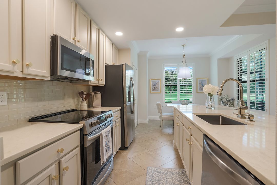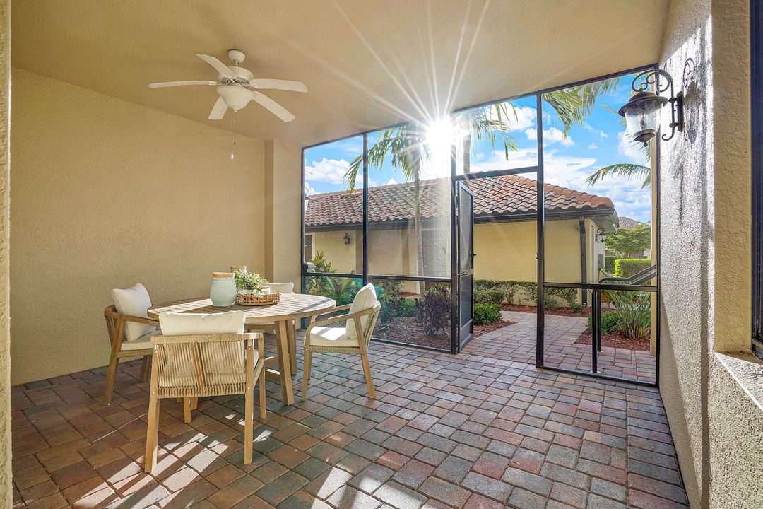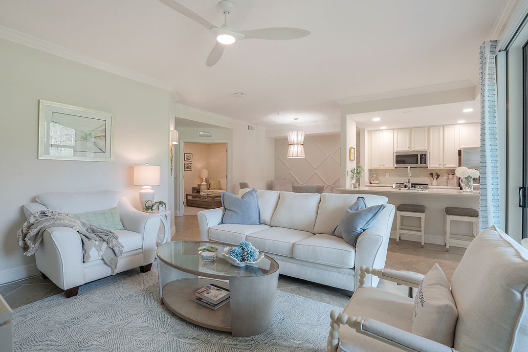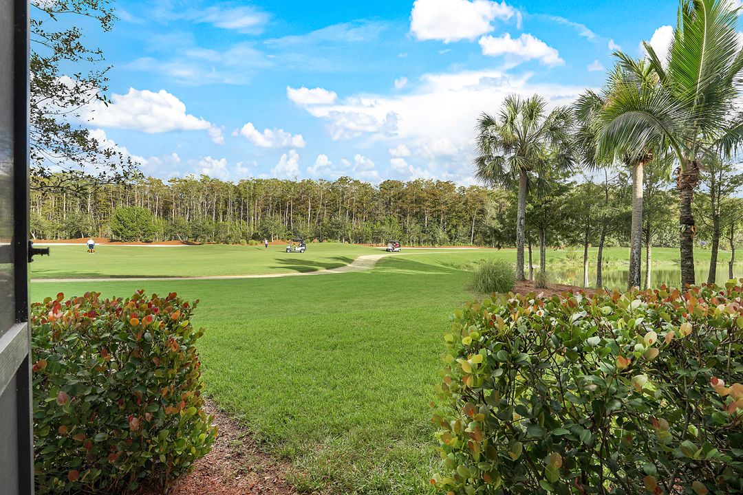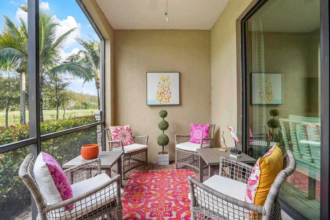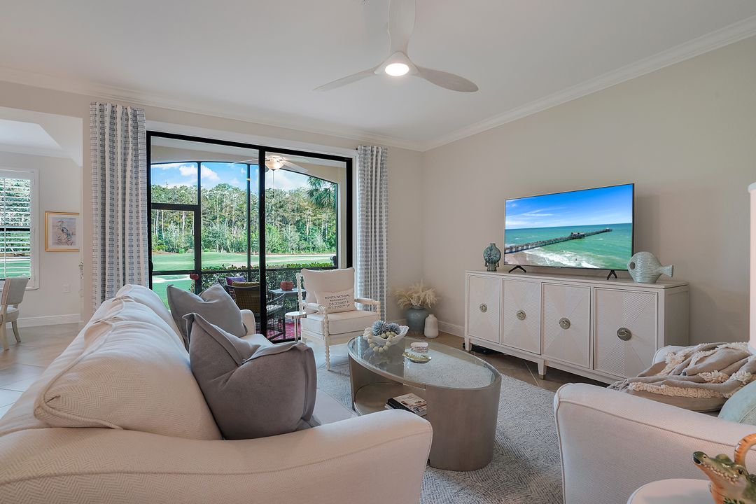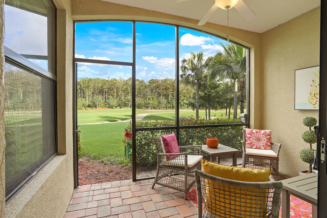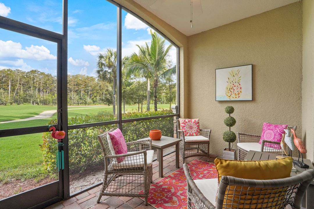 SOCIAL MEMBERSHIP. Welcome to the beautiful Bonita National Golf and Country Club! Nestled in a prime location, this veranda condo offers the perfect blend of elegance, social living and breathtaking views. As you step onto the rear facing lanai you'll be greeted by stunning morning vistas that will energize you for the day ahead. You will enjoy mesmerizing views of the golf course, sparkling water and lush preserve. While the front screened lanai provides a peaceful sanctuary to unwind and admire the vibrant sunsets. With first floor location, convenience and accessibility are at your fingertips. The attention to detail is evident throughout this immaculate home. No expense was spared in creating a space that resembles a model home. Custom millwork adds sophistication, and the upgraded white cabinets and countertops create a sleek and modern aesthetic. Designer finishes and custom lighting fixtures enhance the ambiance, giving each room a unique and luxurious appeal. The open floor plan seamlessly connects the great room, dining area, and kitchen, making it ideal for both relaxing and entertaining. This is more than just a home; it is a lifestyle. Furnished and ready to enjoy.