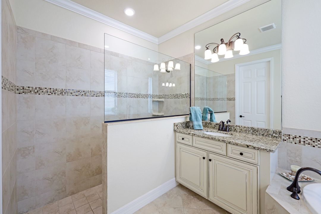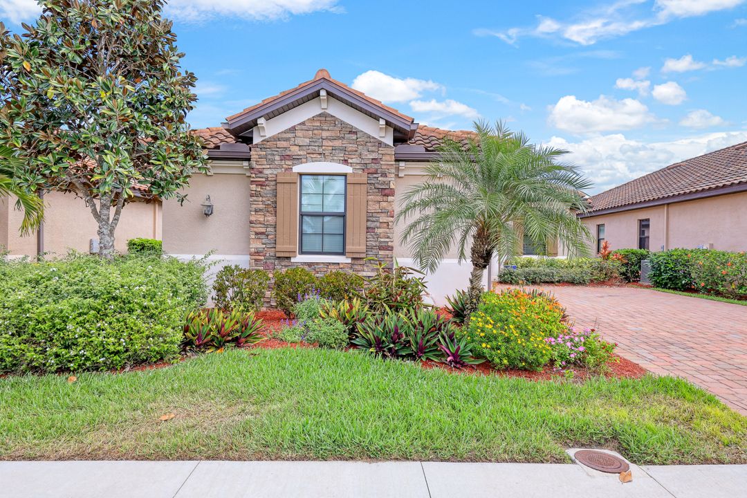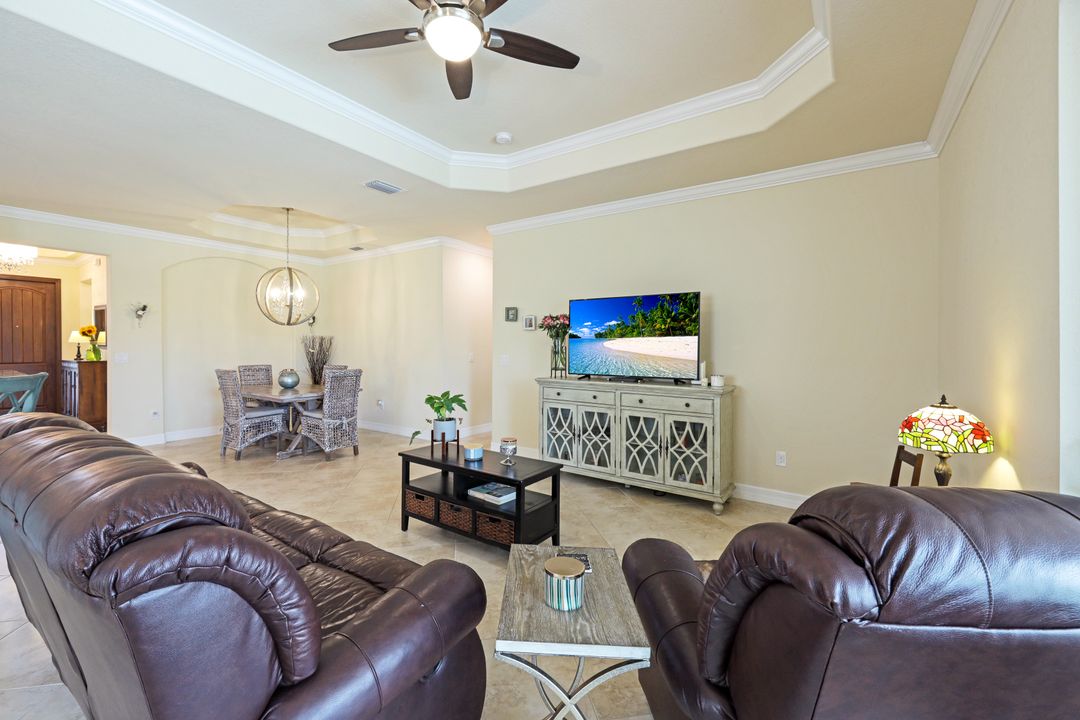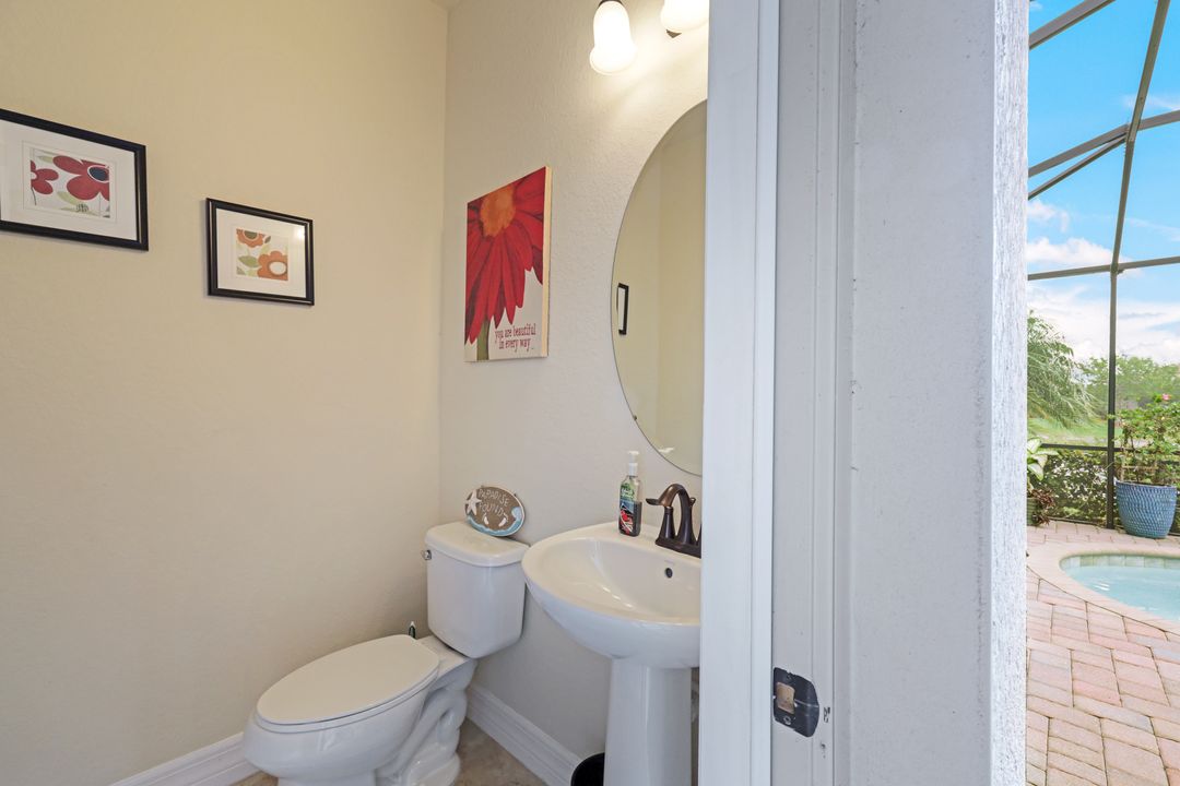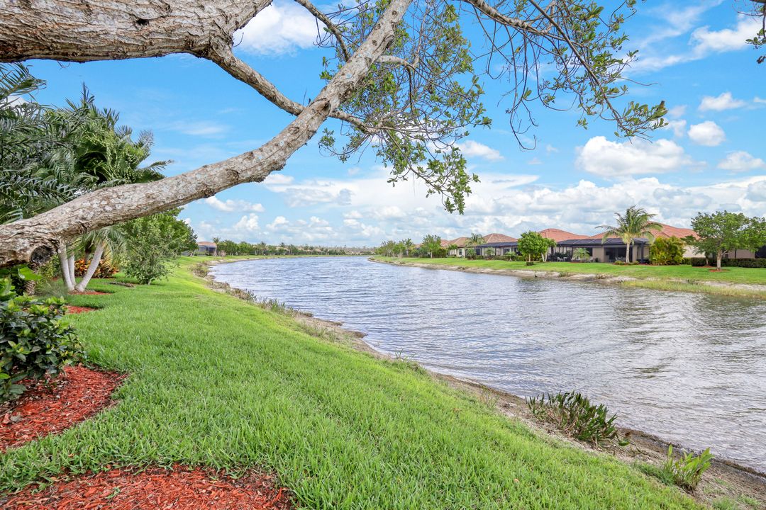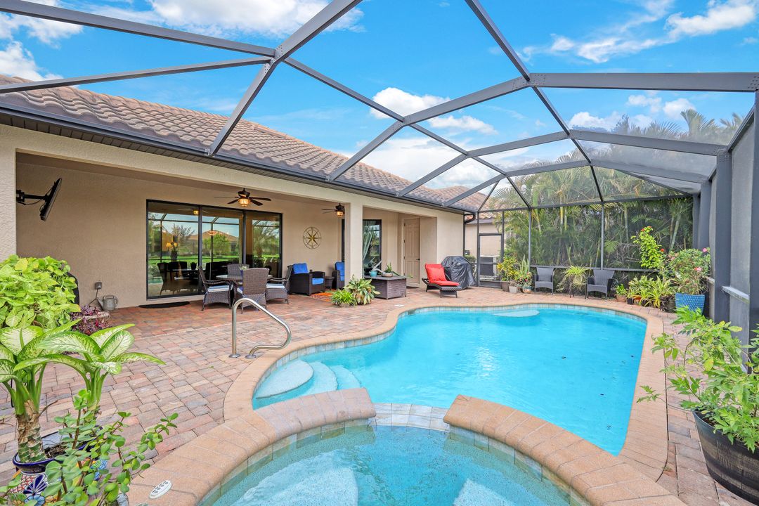 Social Membership included - Spectacular SWFL sunrise views from your spacious screened lanai overlooking your sparkling pool w integrated spa and the lake! You're going to love entertaining in your beautiful home featuring the open floorplan concept with tile on the diagonal & crown molding on soaring tray ceilings. Step through the generous foyer and impress as you are immediately drawn to the beautiful views. Live graciously with 2 bedrooms and a flex room ideal for den, office, Zen and more. With the split bedroom floor plan offered in the Victoria, your guests & family will appreciate the privacy offered as much as you do. The spacious master suite features private access to the lovely lanai, large walk in closet and additional closet space to the spa inspired bath featuring dual vanities and separate soaking tub & large walk-in shower. With a pool bath off the lanai, you can maximize the additional living space offered as you enjoy your private tropical oasis. A 2-car attached garage and superior location within the community make this the perfect year-round or Seasonal home. Enjoy amenity rich Bonita Nationals pool, poolside bar/grill, spa, fitness, clubhouse and more!
