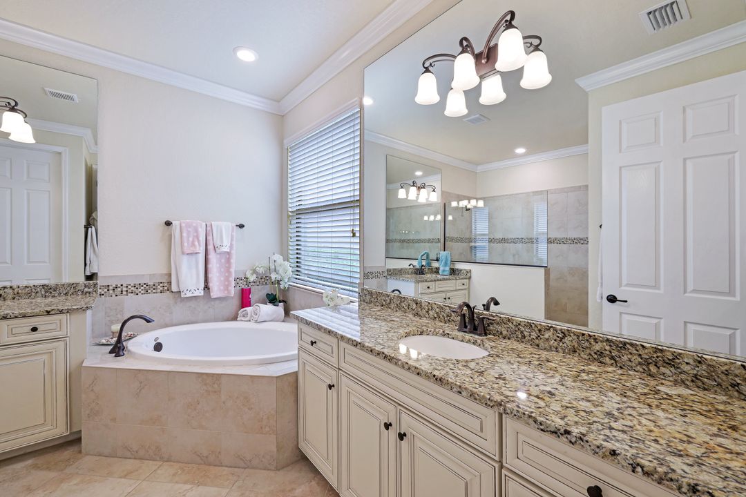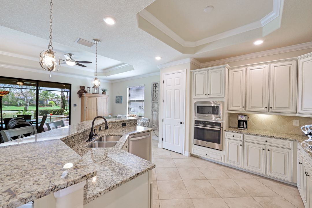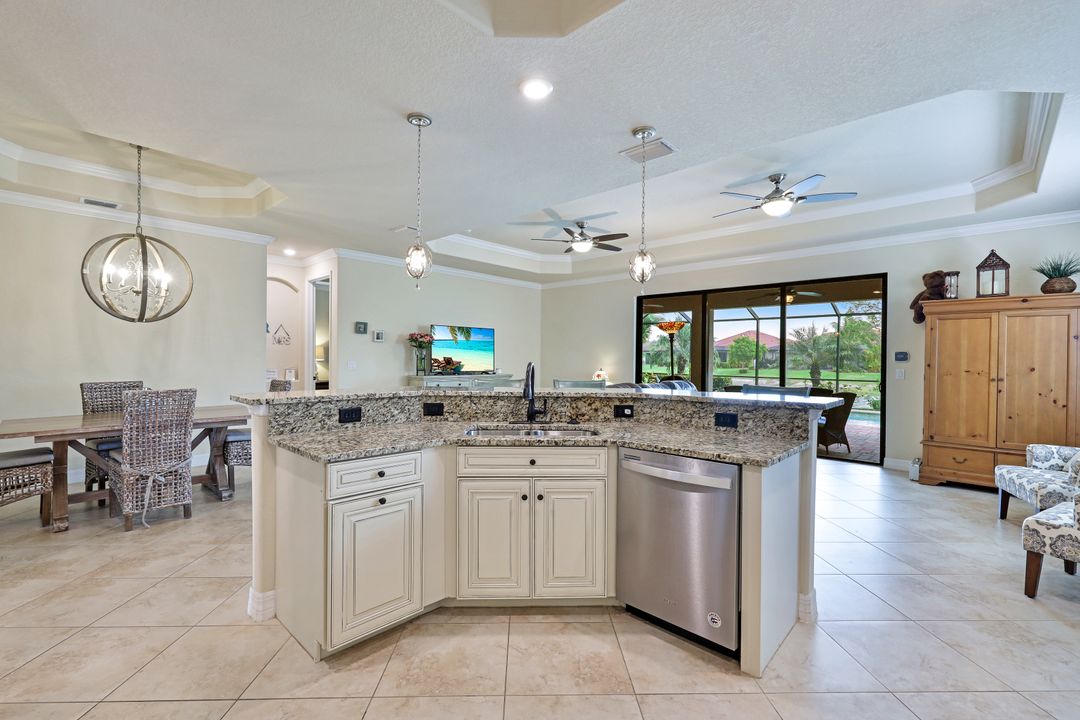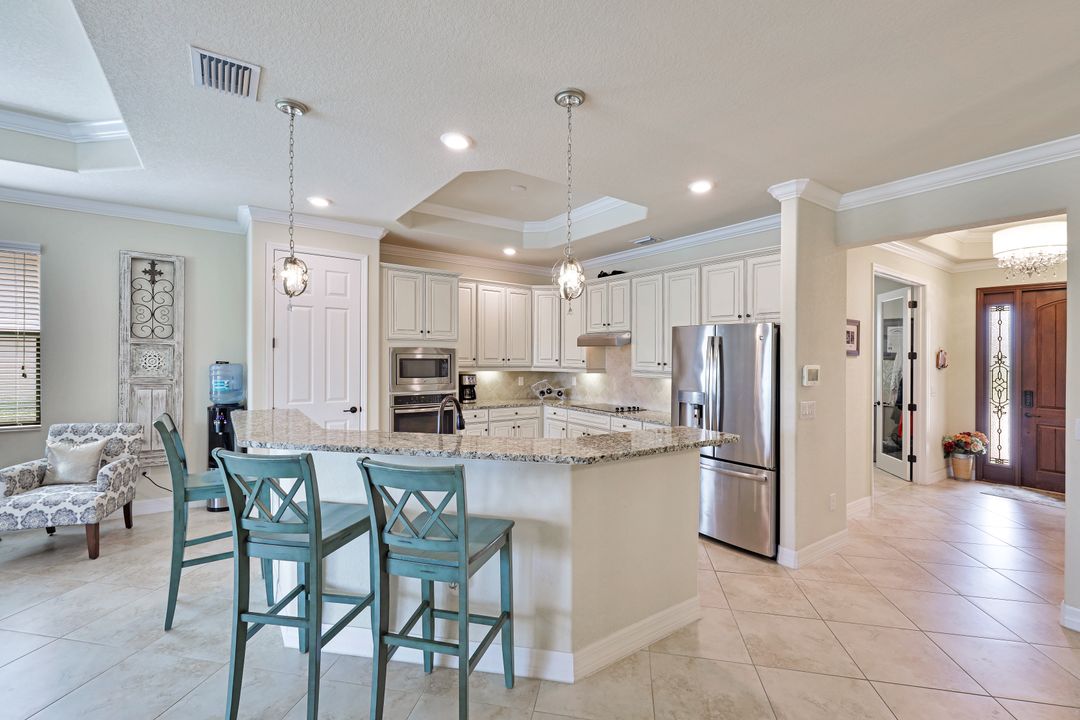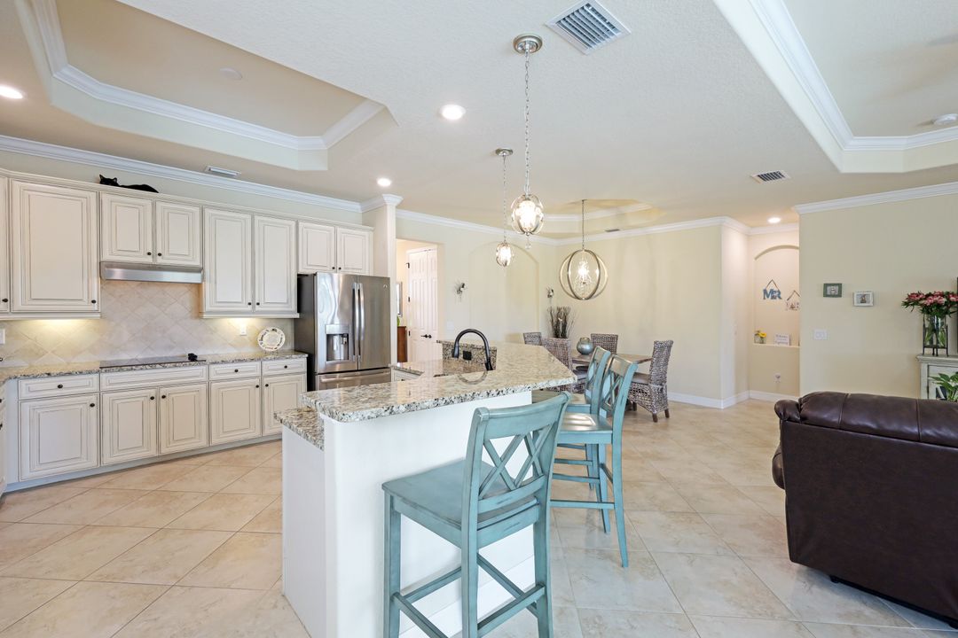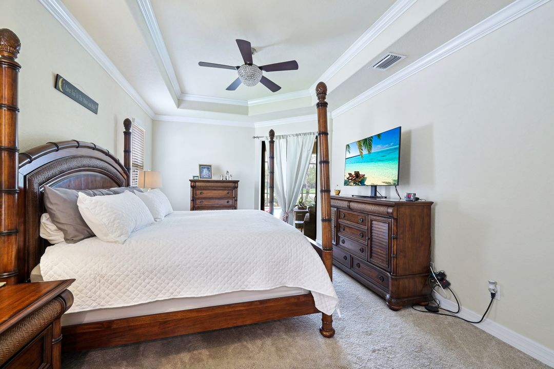 Social Membership included - Spectacular SWFL sunrise views from your spacious screened lanai overlooking your sparkling pool w integrated spa and the lake! You're going to love entertaining in your beautiful home featuring the open floorplan concept with tile on the diagonal & crown molding on soaring tray ceilings. Step through the generous foyer and impress as you are immediately drawn to the beautiful views. Live graciously with 2 bedrooms and a flex room ideal for den, office, Zen and more. With the split bedroom floor plan offered in the Victoria, your guests & family will appreciate the privacy offered as much as you do. The spacious master suite features private access to the lovely lanai, large walk in closet and additional closet space to the spa inspired bath featuring dual vanities and separate soaking tub & large walk-in shower. With a pool bath off the lanai, you can maximize the additional living space offered as you enjoy your private tropical oasis. A 2-car attached garage and superior location within the community make this the perfect year-round or Seasonal home. Enjoy amenity rich Bonita Nationals pool, poolside bar/grill, spa, fitness, clubhouse and more!