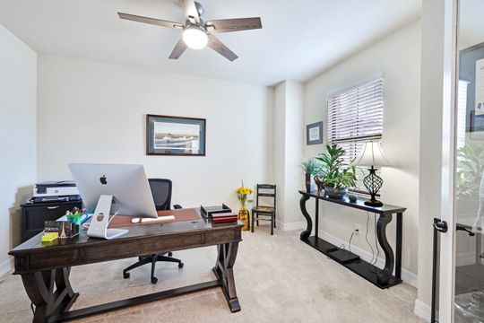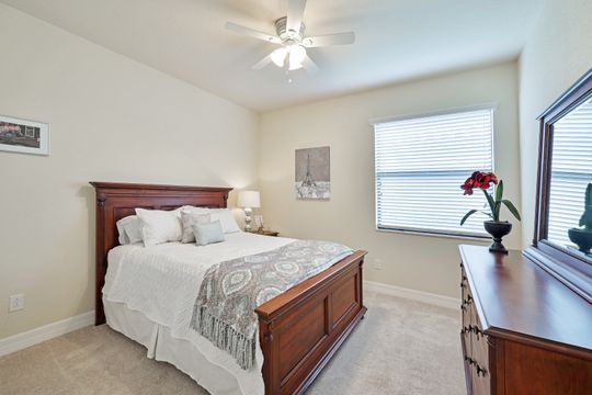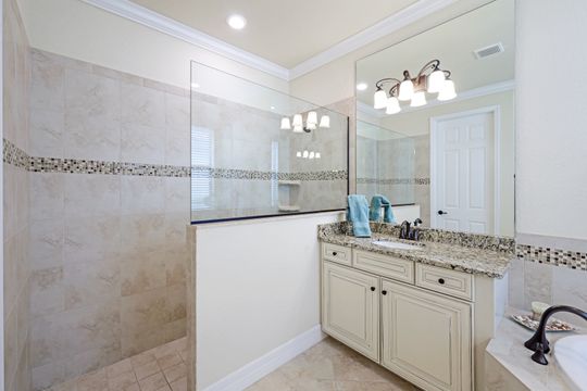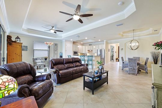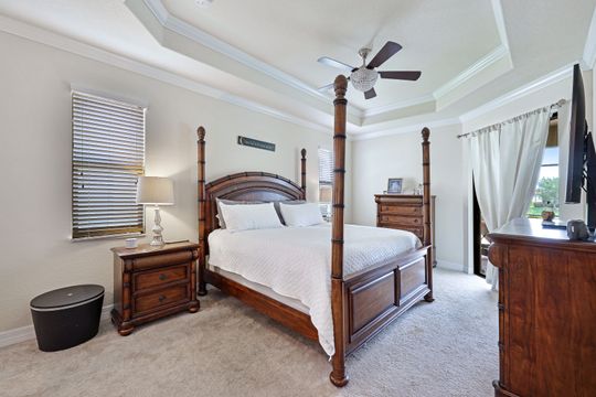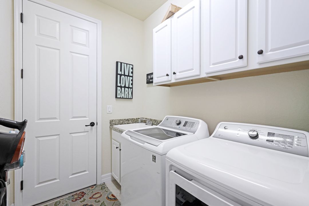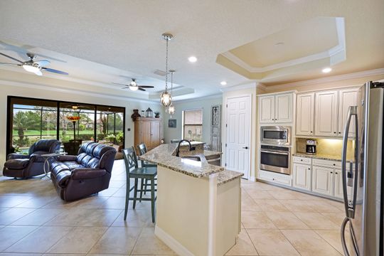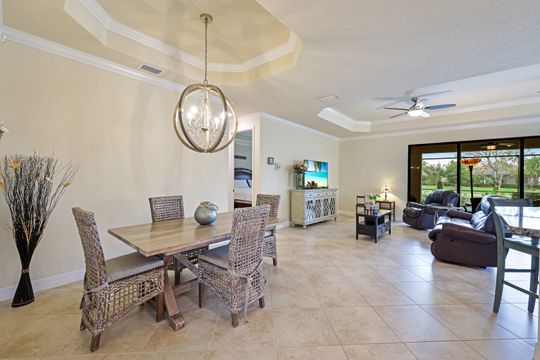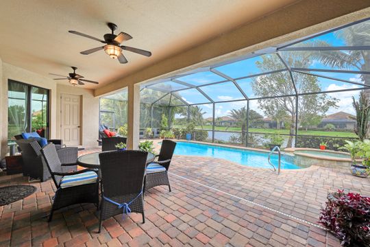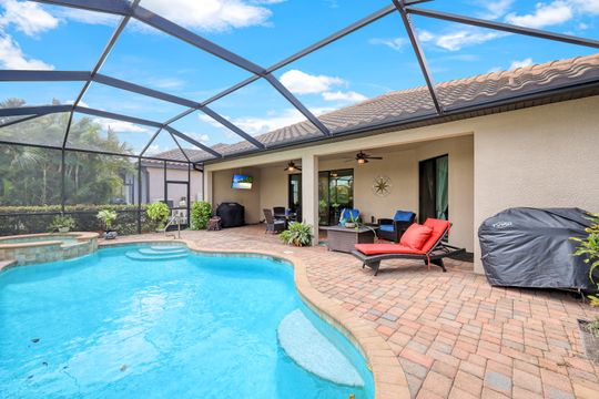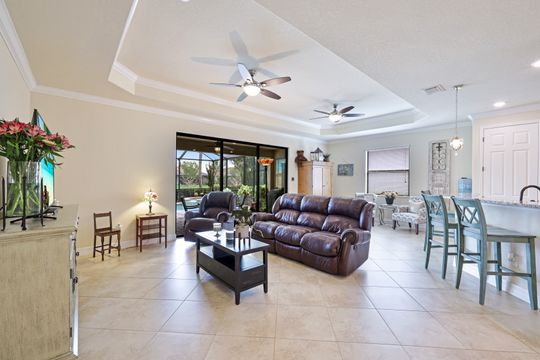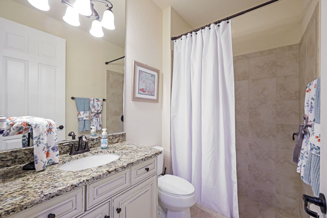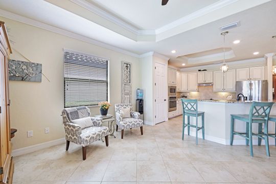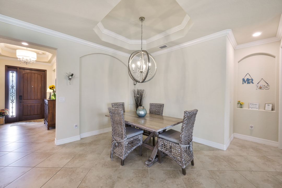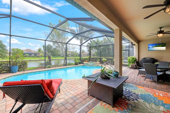 Social Membership included - Spectacular SWFL sunrise views from your spacious screened lanai overlooking your sparkling pool w integrated spa and the lake! You're going to love entertaining in your beautiful home featuring the open floorplan concept with tile on the diagonal & crown molding on soaring tray ceilings. Step through the generous foyer and impress as you are immediately drawn to the beautiful views. Live graciously with 2 bedrooms and a flex room ideal for den, office, Zen and more. With the split bedroom floor plan offered in the Victoria, your guests & family will appreciate the privacy offered as much as you do. The spacious master suite features private access to the lovely lanai, large walk in closet and additional closet space to the spa inspired bath featuring dual vanities and separate soaking tub & large walk-in shower. With a pool bath off the lanai, you can maximize the additional living space offered as you enjoy your private tropical oasis. A 2-car attached garage and superior location within the community make this the perfect year-round or Seasonal home. Enjoy amenity rich Bonita Nationals pool, poolside bar/grill, spa, fitness, clubhouse and more!