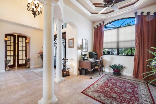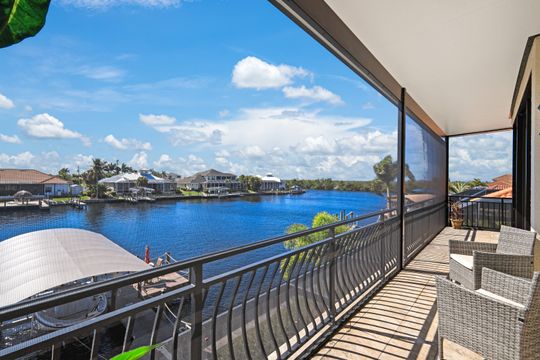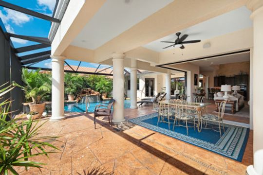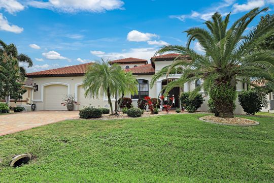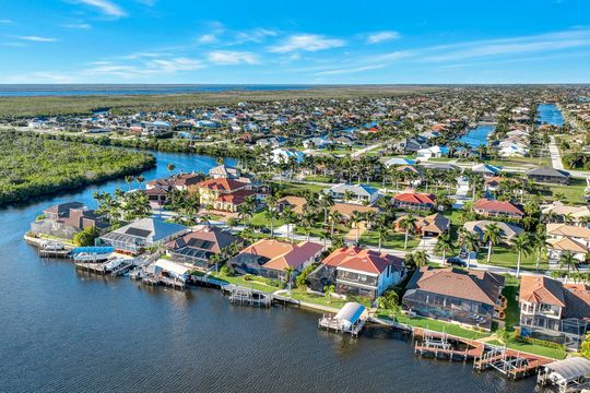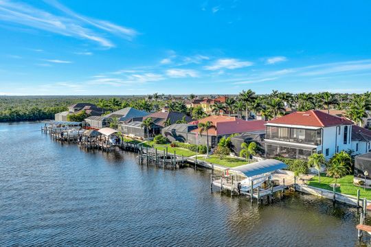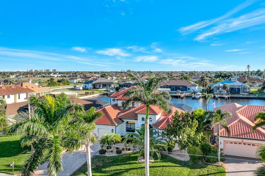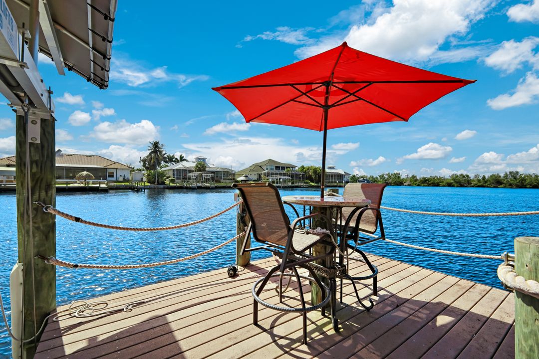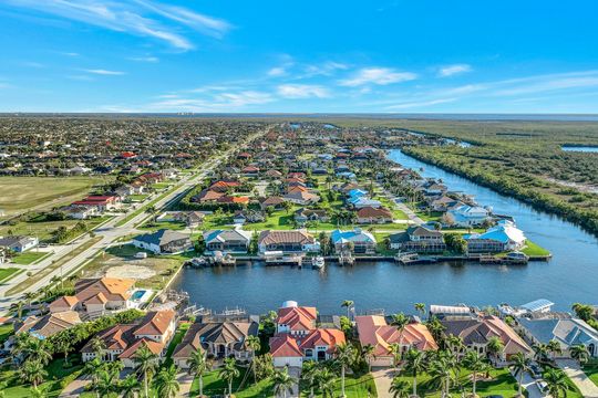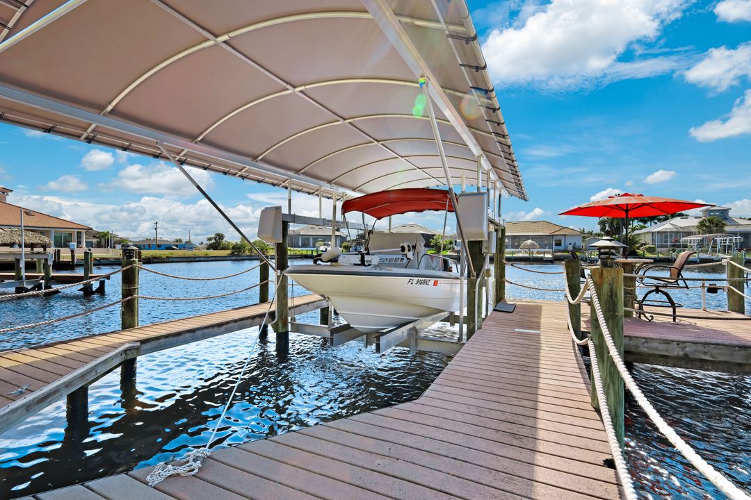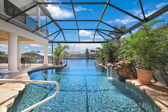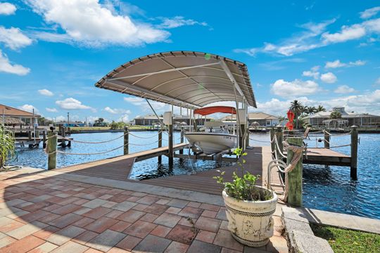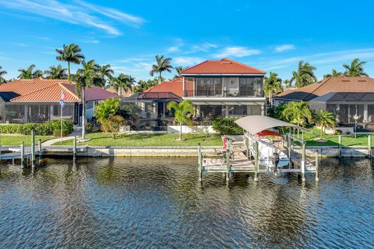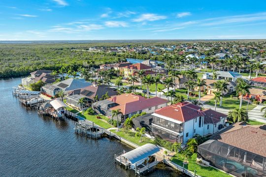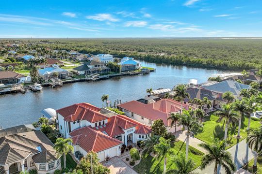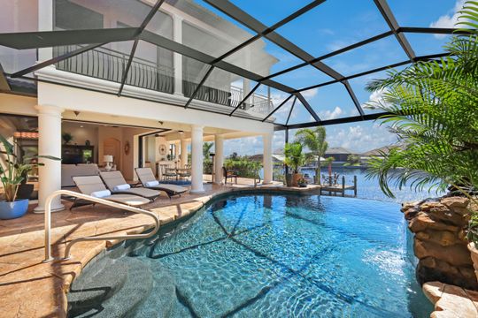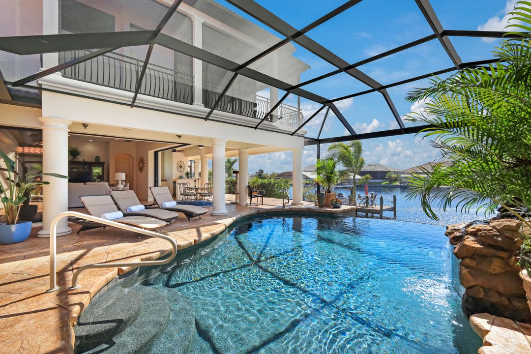 SAILBOAT ACCESS, 1 Minute from the Spreader Canal, SOUTHERN Exposure, 2 Story Custom Built Aubuchon Home! Welcome to this stunning property boasting a perfect blend of luxury and functionality. Residence offers unparalleled waterfront living on the 240 foot Mariana Canal. Step inside to discover a spacious layout featuring impact windows and doors throughout, ensuring both safety and energy efficiency. The main floor encompasses 2 bedrooms, while an upstairs features an additional bedroom and a bonus room adding versatility to the living space. With four bathrooms, convenience is never compromised. Experience seamless indoor-outdoor living with 90-degree pocket sliding glass doors on both levels, effortlessly merging the interior with the expansive outdoor oasis. Take a dip in the saltwater infinity edge pool, accented by a picture window screen, or unwind in the generous covered and open outdoor living areas, perfect for sunbathing or entertaining. The property is adorned with premium features, including a paver driveway, structurally reinforced barrel tile roof, and tile and hardwood flooring throughout. Granite counters adorn every surface, lending an air of sophistication to the kitchen and bathrooms. Enjoy al fresco dining with the outdoor kitchen, or embark on aquatic adventures from the composite dock featuring a 10,000 lb boat lift complete with canopy. Additional noteworthy items include-22k Propane Generator, Fireplace, security system, central vac, multiple mature fruit trees (mango, guava, avocado, lemon). Crafted by renowned Aubuchon Homes, this two-story masterpiece exemplifies luxury, quality and style. Discover the waterfront luxury living in this meticulously designed home, where every detail has been thoughtfully curated to enhance your coastal lifestyle. Cape Coral is a true boaters paradise where world class fishing and white sandy beaches await!