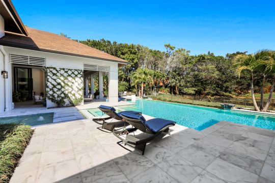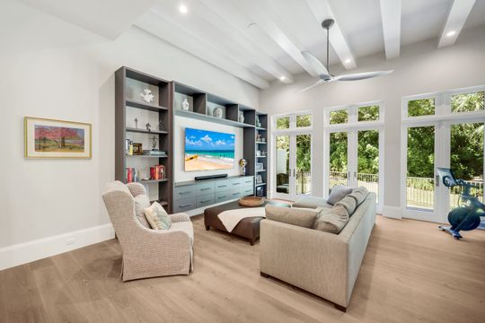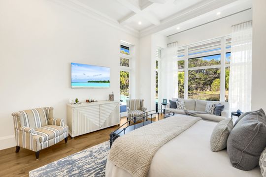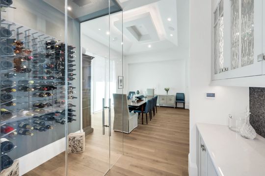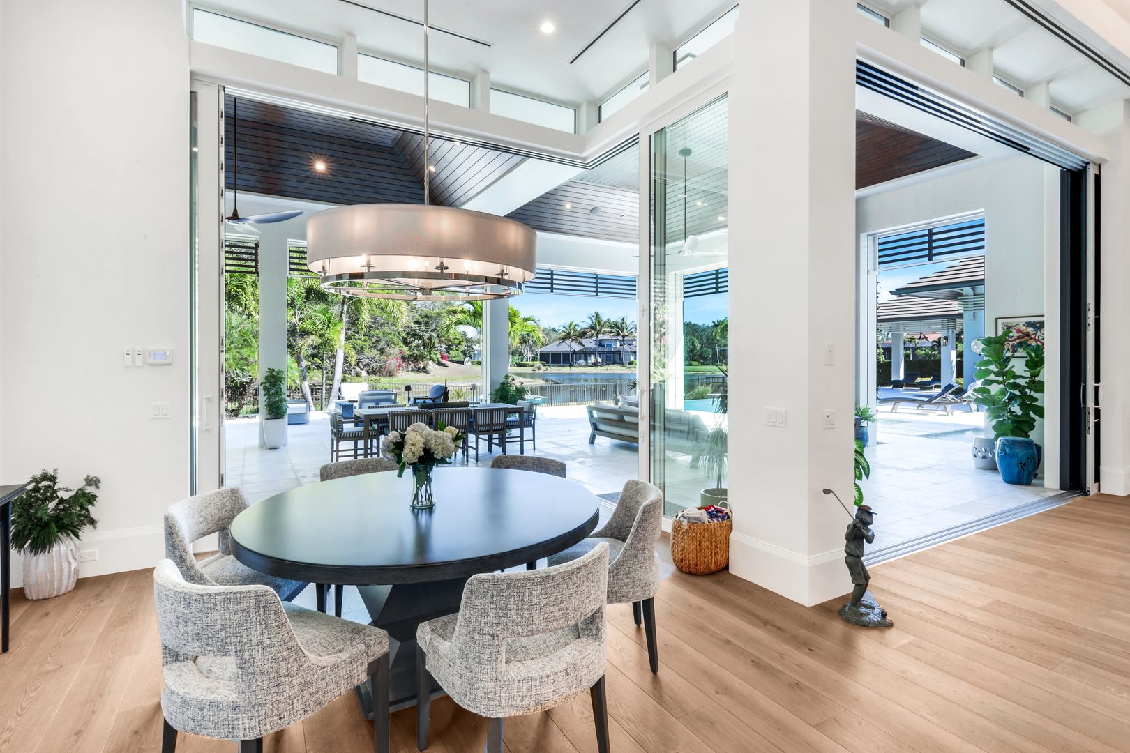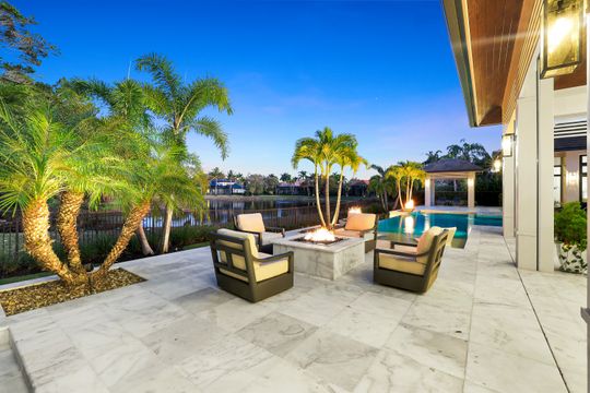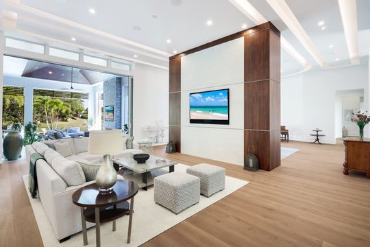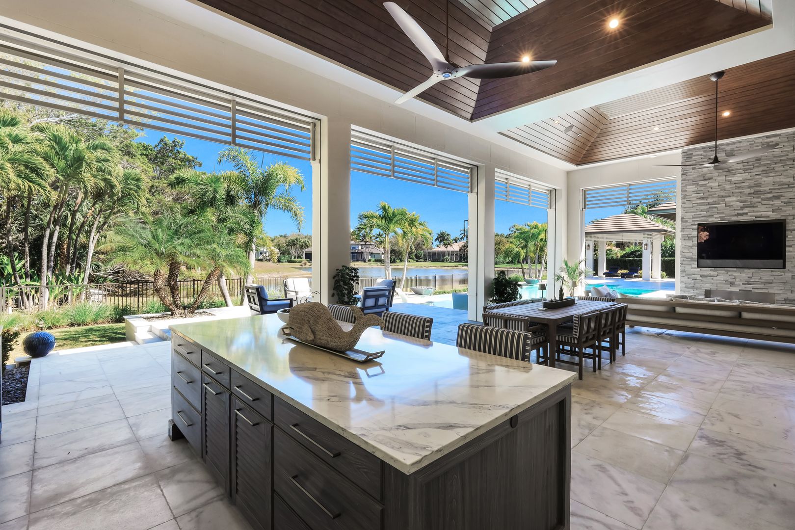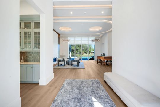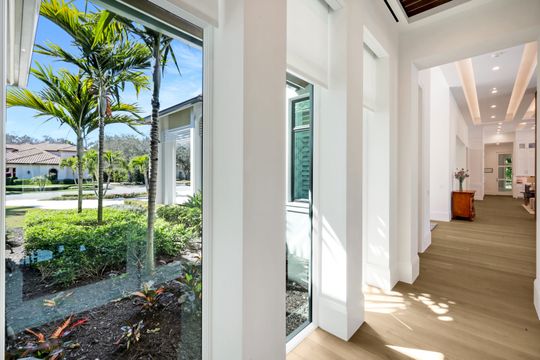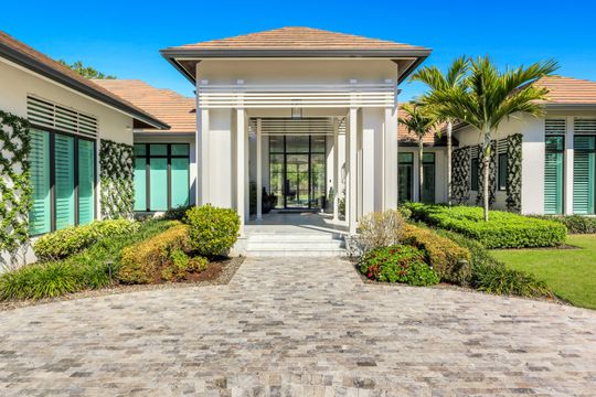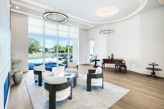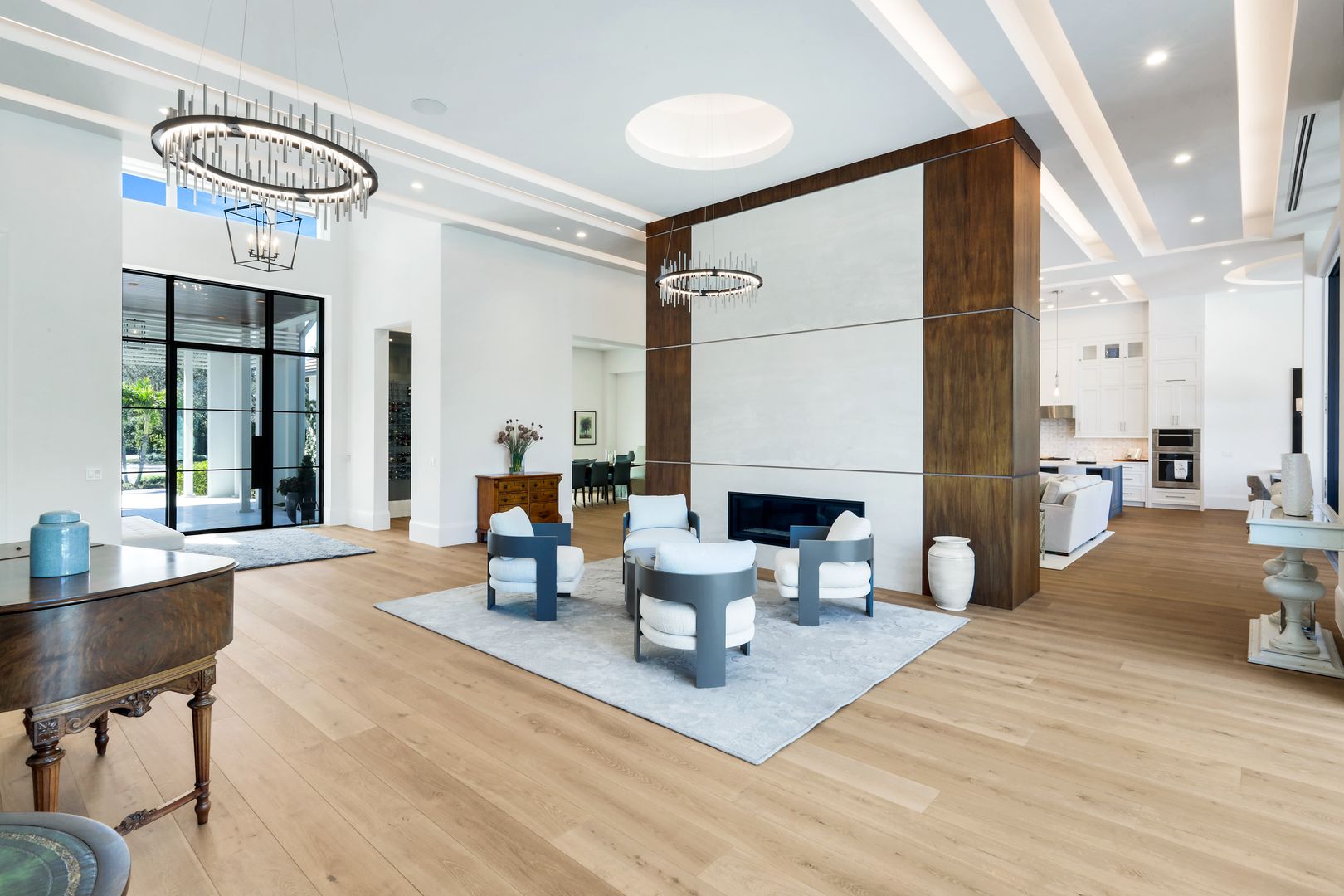 Nestled on a private and serene .73-acre lake-view cul de sac homesite within the prestigious Estates section of Grey Oaks Golf & Country Club, this single-story luxury estate built in 2021 by Diamond Custom Homes, artfully designed by Stofft Cooney Architecture, with interior design by Collins and Dupont, presents an unmatched fusion of contemporary design and resort-style living. Expansive glass doors and windows flood the interior with abundant natural light and a seamless indoor-outdoor flow framing picturesque lake and garden vistas.Inside, the residence spans over 6300 square feet and is graced by an elegant palette of premium finishes and custom detailing.Legno Bastone french oak wood floors adorn the interior, while polished nickel fixtures and quartzite and marble countertops imbue the space with refined character.The 14' volume ceilings boast impressive custom backlit treatments adding ambiance to the spacious split living area.The gourmet kitchen is appointed with custom cabinetry and top-of-the-line appliances, including dual Miele dishwashers, Sub-Zero refrigeration, a 48" Wolf gas cooktop, wall ovens, and steam oven.Entertaining is effortless, with features such as a hidden walk-in pantry, an integrated coffee bar, and a wet bar complete with ice maker and dual beverage drawers. A generously proportioned center island, topped with Carrara marble, offers ample workspace and casual dining. A wine bar and glass enclosed, climate controlled wine closet add to the entertaining experience. Adjacent to the kitchen, an enclosed flex space den with custom cabinetry, quartz counters, and extra workstation, presents an opportunity for a second office, workout room, or media/theater space. This den hosts a wall of french doors leading to a secluded outdoor patio space, an ideal nook for intimate conversation or quiet reflection. The luxurious primary suite features oversized picture windows framing a cozy seating area, a sumptuous marble-appointed bathroom, built in wet bar, and extensive custom closets. Outdoor living is at its finest where tumbled Carrara marble tiles surround the infinity-edge pool with integrated spa.The expansive covered living area features generous spaces for both alfresco dining and lounging beside the outdoor kitchen, gas fireplace, versatex ceilings, retractable screens, and a rainfall detecting auto hurricane shutter system for peace of mind. A convenient pool bath serves outdoor guests, while a cozy fire-pit lounge, detached pergola, and an ample pet friendly fenced grass area finish this exceptionally functional space.This extraordinary property, blending sophisticated finishes with unparalleled amenities, exemplifies luxury Florida living and offers the epitome of elegance, comfort, and refined style.Members of Grey Oaks Country Club experience world class resort style amenities, 3 18-Hole Championship golf courses, pickleball and tennis, state of the art fitness center, spa services, and multiple dining options.