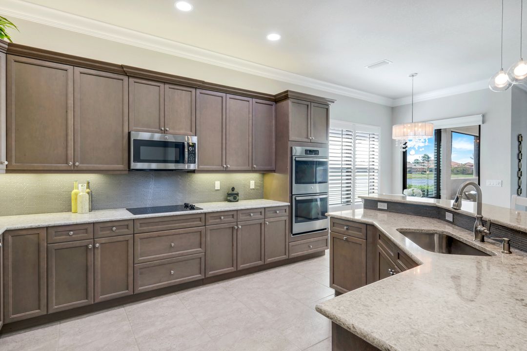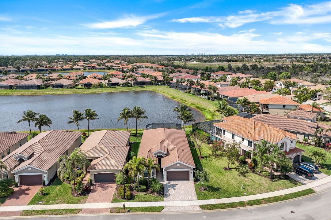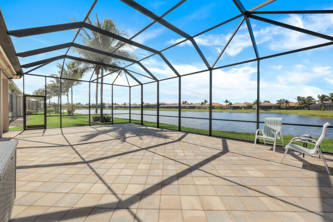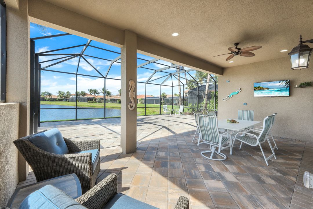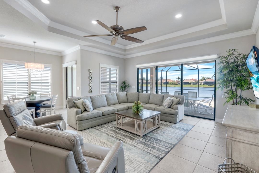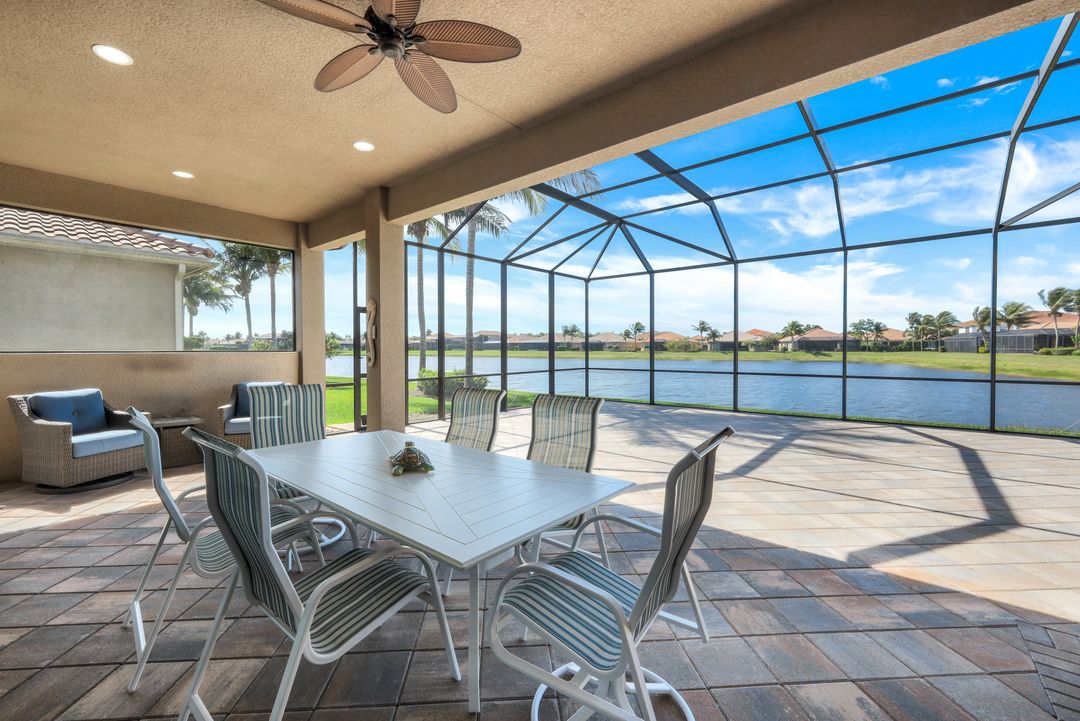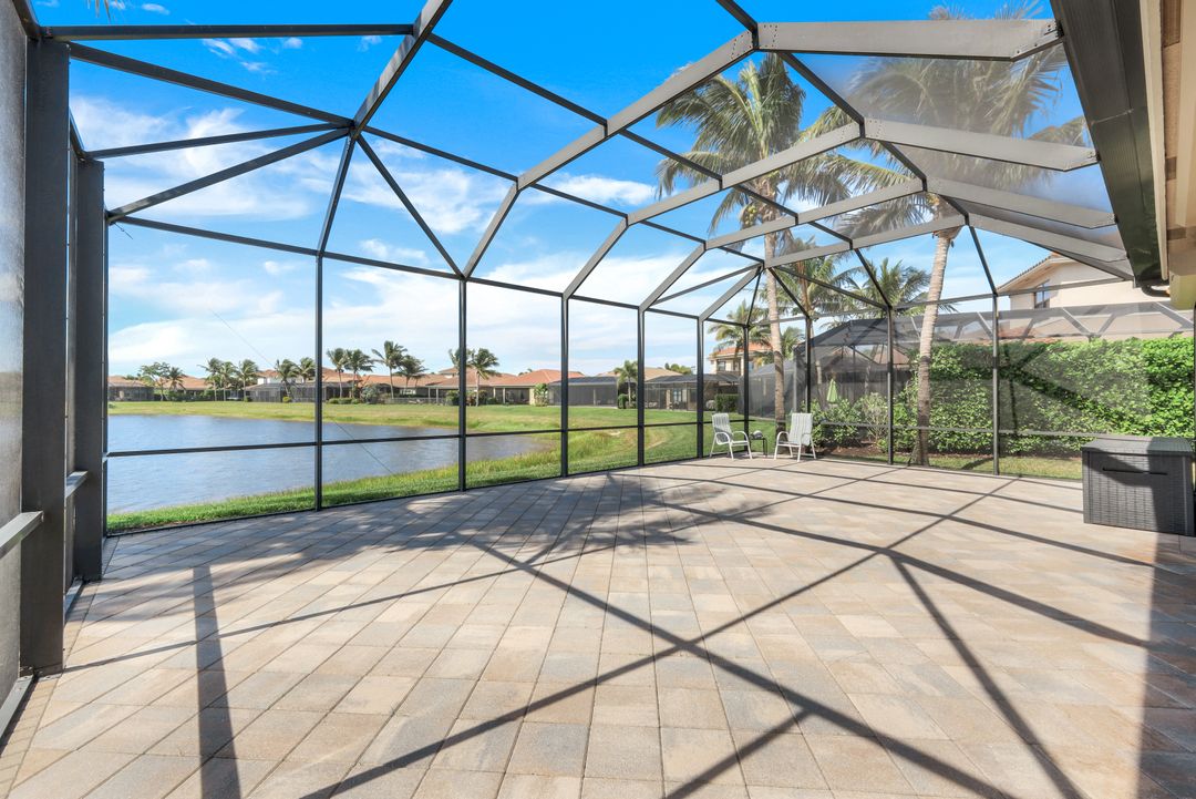 Upon opening the front door of this meticulously maintained Chandon floor plan home, you will be immediately captivated by the breathtaking western lake view. Whether you're unwinding or entertaining, the expanded screened lanai and “L” shaped covered patio offer the perfect setting—complete with ample space for dining and seating while you watch the stunning sunsets paint the sky. Outside, you'll also appreciate the extra space provided by the oversized, pie-shaped lot. Inside, the open-concept design creates a bright, airy atmosphere. The spacious great room, formal and casual dining areas, and gourmet kitchen flow seamlessly together. The chef-inspired kitchen boasts level IV Chelsea Maple Winter cabinets, upgraded quartz countertops, stainless steel appliances (including a double oven and brand-new GE cooktop), a stylish tile backsplash, and ambient lighting. The thoughtfully designed split bedroom layout ensures privacy for the owners, with the luxurious primary suite offering serene lake views, two walk-in closets, and an ensuite bath that feels like a private spa retreat. The floor plan was modified to ensure that the three guest bedrooms are tucked away, providing extra privacy for visitors. This home is move-in ready, featuring plantation shutters throughout, crown molding, stylish lighting and fans, and closet organization systems in every room. With a new water heater, stunning quartz countertops, upgraded LG washer/dryer in laundry and solid wood doors throughout, every detail has been carefully considered. During storm season, rest easy knowing you can effortlessly close the electric hurricane shutters on the windows and activate the hurricane screens on the lanai at the push of a button. Riverstone offers a social, vacation-inspired lifestyle for all ages. Located in North Naples, minutes to I-75 & zoned for "A" rated schools. Recreation area includes a fitness center, social hall, resort style pool, lap pool, spa, 5 lighted tennis courts, outdoor basketball/pickleball, full indoor basketball court, tot lot, children's water play area & game room & an activities coordinator. Don’t miss your chance to experience the Southwest Florida lifestyle you’ve been dreaming of. Paradise is waiting for you!