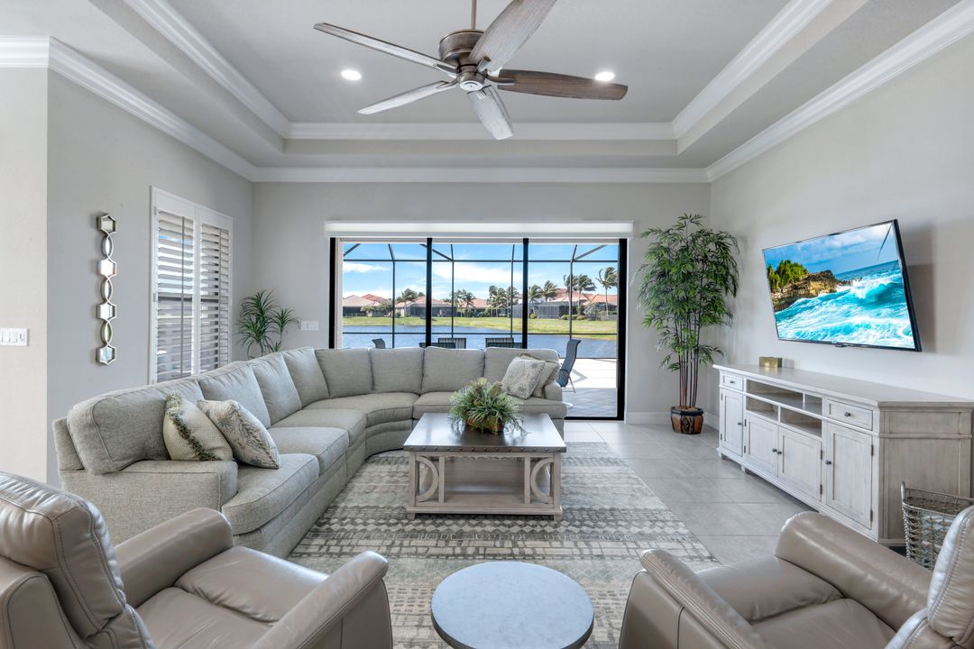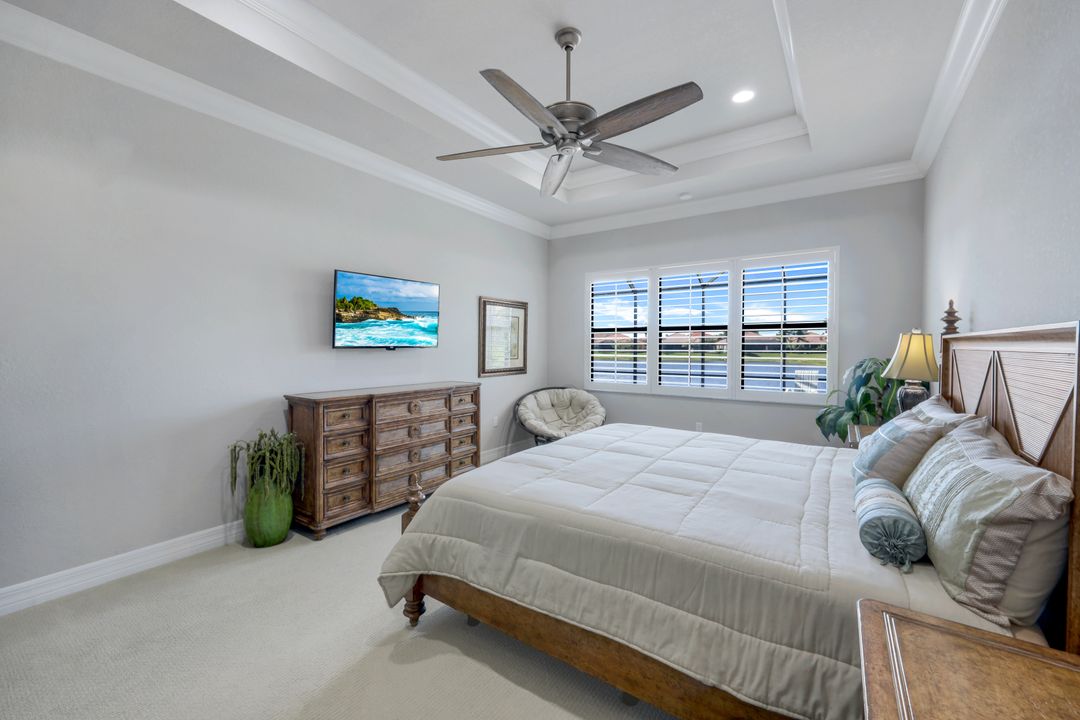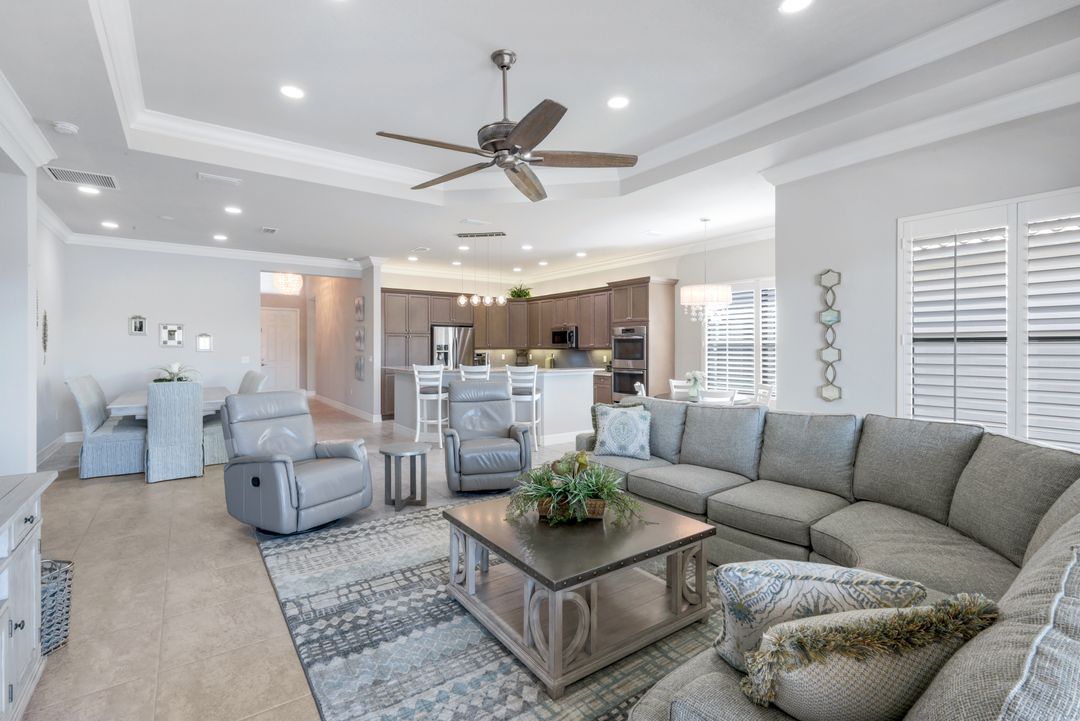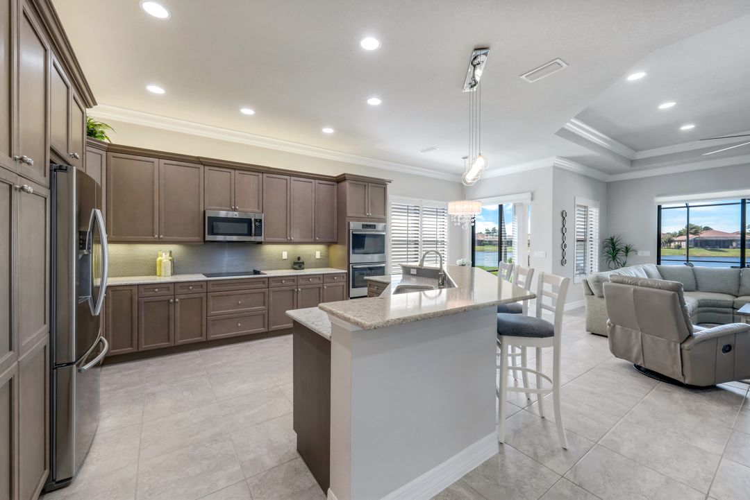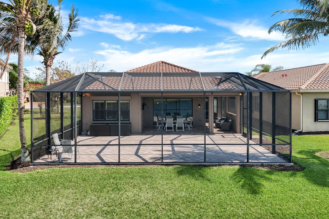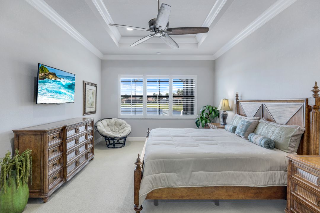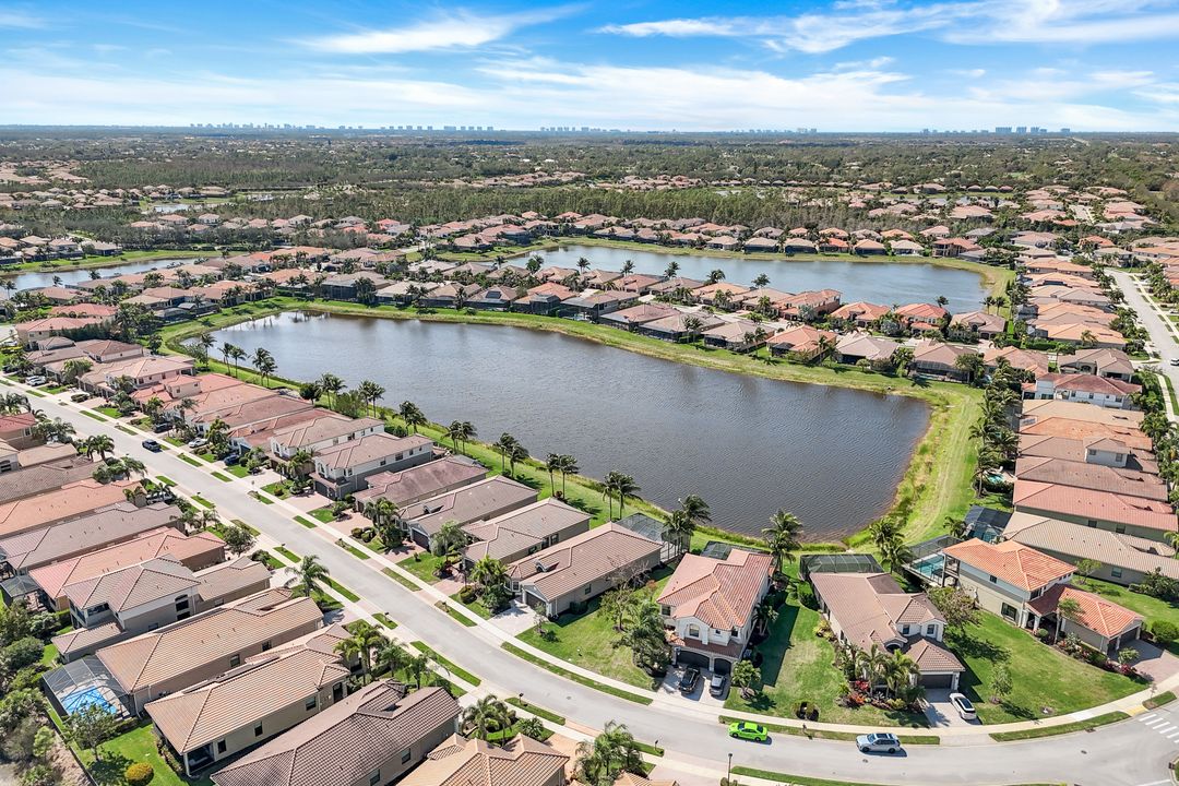 Upon opening the front door of this meticulously maintained Chandon floor plan home, you will be immediately captivated by the breathtaking western lake view. Whether you're unwinding or entertaining, the expanded screened lanai and “L” shaped covered patio offer the perfect setting—complete with ample space for dining and seating while you watch the stunning sunsets paint the sky. Outside, you'll also appreciate the extra space provided by the oversized, pie-shaped lot. Inside, the open-concept design creates a bright, airy atmosphere. The spacious great room, formal and casual dining areas, and gourmet kitchen flow seamlessly together. The chef-inspired kitchen boasts level IV Chelsea Maple Winter cabinets, upgraded quartz countertops, stainless steel appliances (including a double oven and brand-new GE cooktop), a stylish tile backsplash, and ambient lighting. The thoughtfully designed split bedroom layout ensures privacy for the owners, with the luxurious primary suite offering serene lake views, two walk-in closets, and an ensuite bath that feels like a private spa retreat. The floor plan was modified to ensure that the three guest bedrooms are tucked away, providing extra privacy for visitors. This home is move-in ready, featuring plantation shutters throughout, crown molding, stylish lighting and fans, and closet organization systems in every room. With a new water heater, stunning quartz countertops, upgraded LG washer/dryer in laundry and solid wood doors throughout, every detail has been carefully considered. During storm season, rest easy knowing you can effortlessly close the electric hurricane shutters on the windows and activate the hurricane screens on the lanai at the push of a button. Riverstone offers a social, vacation-inspired lifestyle for all ages. Located in North Naples, minutes to I-75 & zoned for "A" rated schools. Recreation area includes a fitness center, social hall, resort style pool, lap pool, spa, 5 lighted tennis courts, outdoor basketball/pickleball, full indoor basketball court, tot lot, children's water play area & game room & an activities coordinator. Don’t miss your chance to experience the Southwest Florida lifestyle you’ve been dreaming of. Paradise is waiting for you!