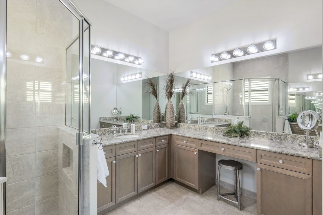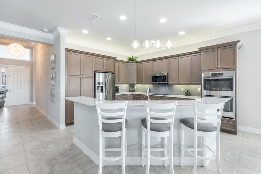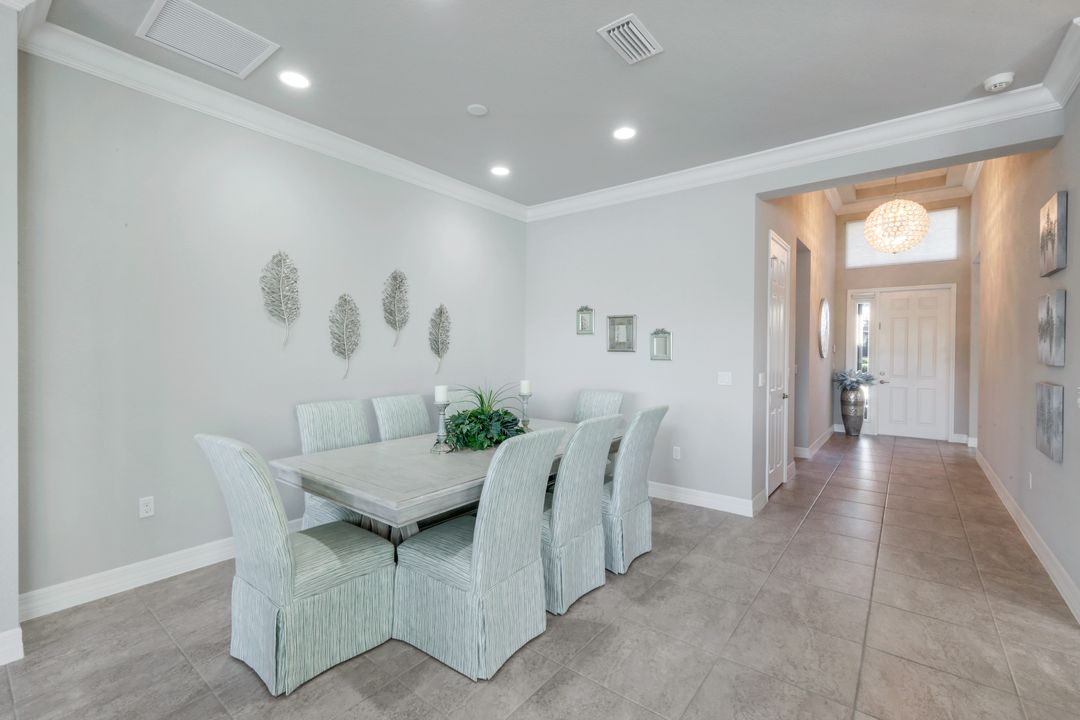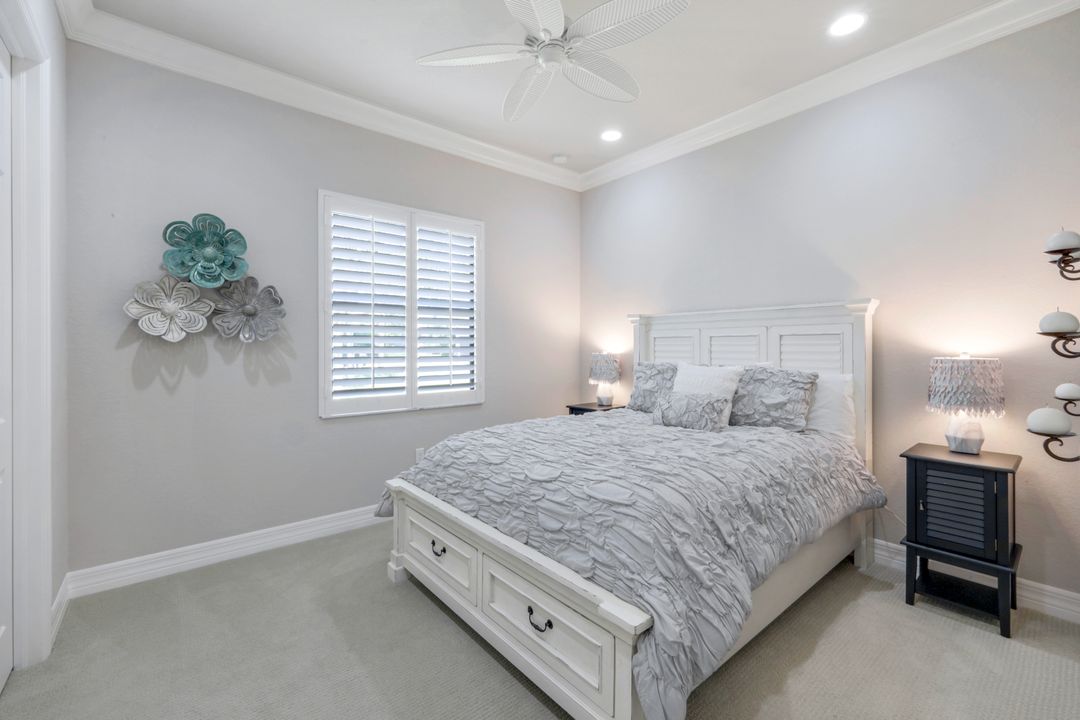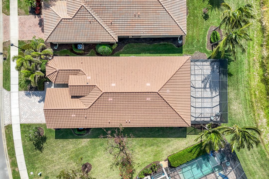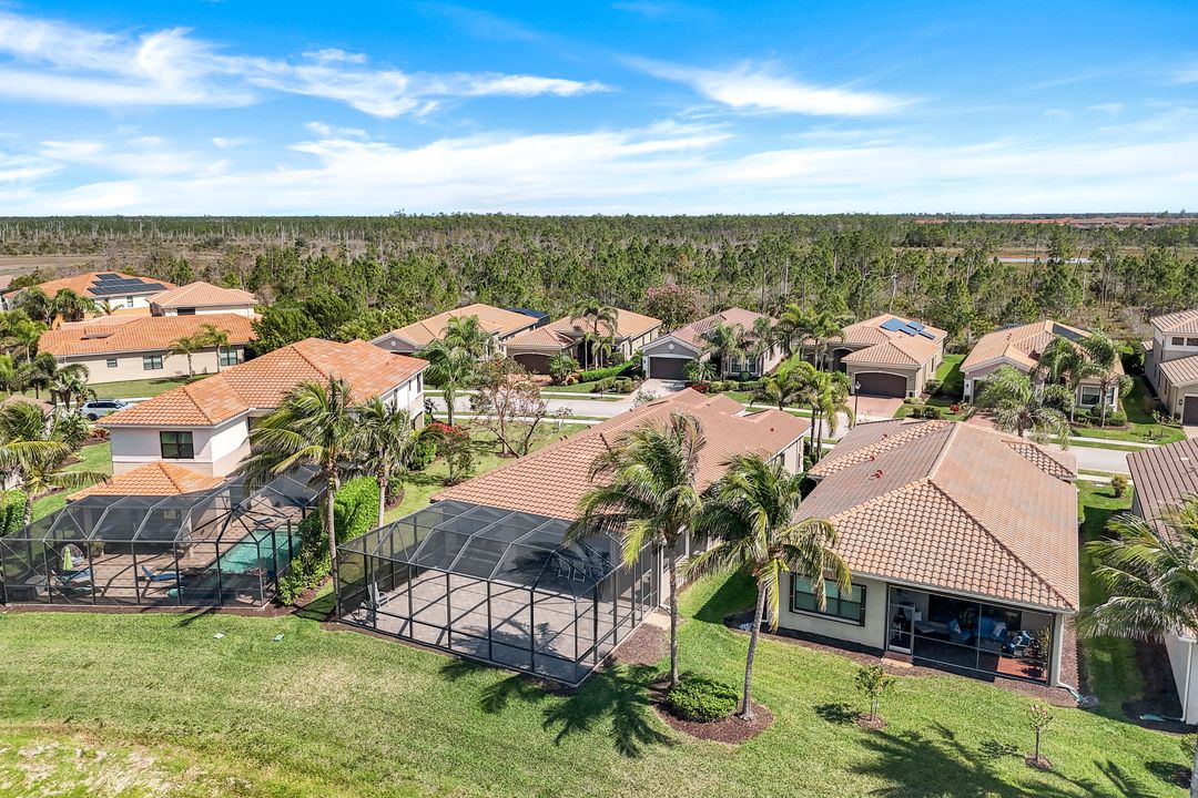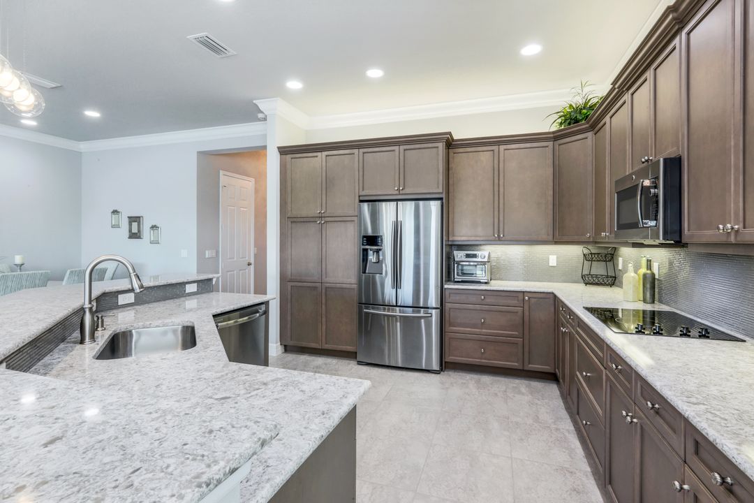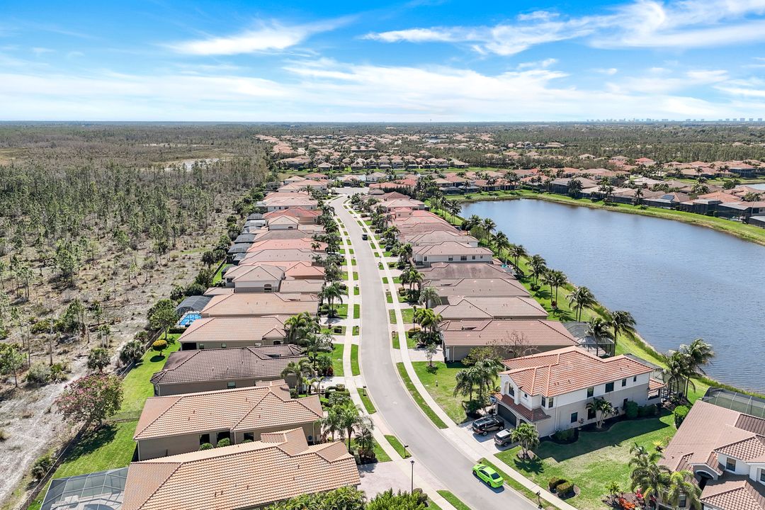 Upon opening the front door of this meticulously maintained Chandon floor plan home, you will be immediately captivated by the breathtaking western lake view. Whether you're unwinding or entertaining, the expanded screened lanai and “L” shaped covered patio offer the perfect setting—complete with ample space for dining and seating while you watch the stunning sunsets paint the sky. Outside, you'll also appreciate the extra space provided by the oversized, pie-shaped lot. Inside, the open-concept design creates a bright, airy atmosphere. The spacious great room, formal and casual dining areas, and gourmet kitchen flow seamlessly together. The chef-inspired kitchen boasts level IV Chelsea Maple Winter cabinets, upgraded quartz countertops, stainless steel appliances (including a double oven and brand-new GE cooktop), a stylish tile backsplash, and ambient lighting. The thoughtfully designed split bedroom layout ensures privacy for the owners, with the luxurious primary suite offering serene lake views, two walk-in closets, and an ensuite bath that feels like a private spa retreat. The floor plan was modified to ensure that the three guest bedrooms are tucked away, providing extra privacy for visitors. This home is move-in ready, featuring plantation shutters throughout, crown molding, stylish lighting and fans, and closet organization systems in every room. With a new water heater, stunning quartz countertops, upgraded LG washer/dryer in laundry and solid wood doors throughout, every detail has been carefully considered. During storm season, rest easy knowing you can effortlessly close the electric hurricane shutters on the windows and activate the hurricane screens on the lanai at the push of a button. Riverstone offers a social, vacation-inspired lifestyle for all ages. Located in North Naples, minutes to I-75 & zoned for "A" rated schools. Recreation area includes a fitness center, social hall, resort style pool, lap pool, spa, 5 lighted tennis courts, outdoor basketball/pickleball, full indoor basketball court, tot lot, children's water play area & game room & an activities coordinator. Don’t miss your chance to experience the Southwest Florida lifestyle you’ve been dreaming of. Paradise is waiting for you!