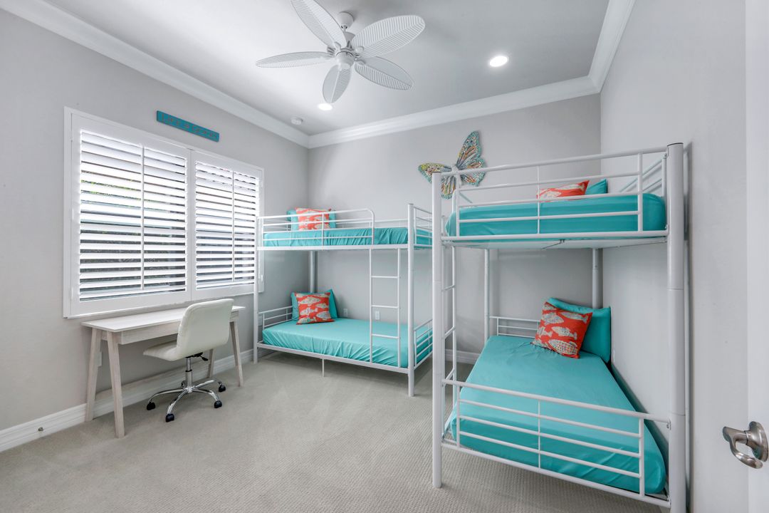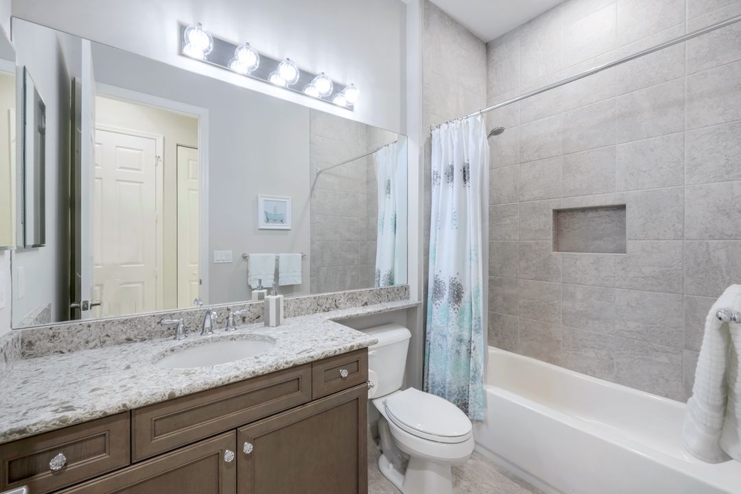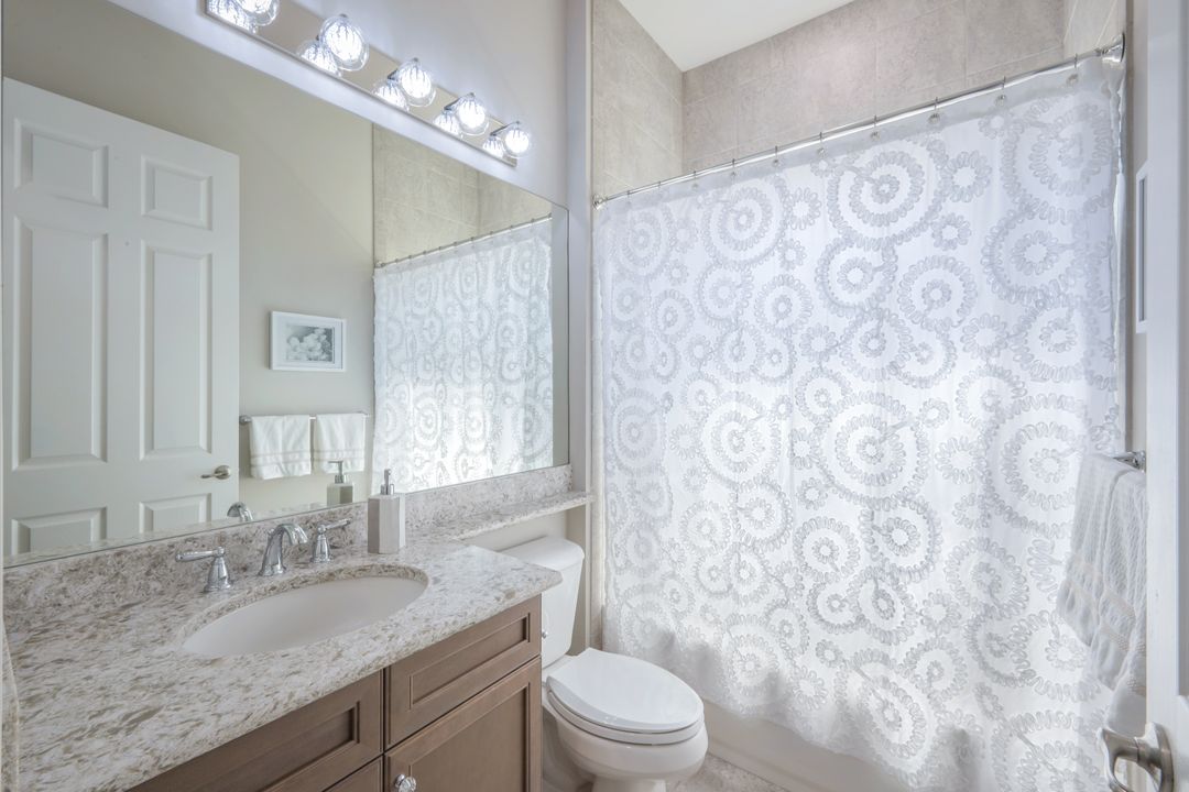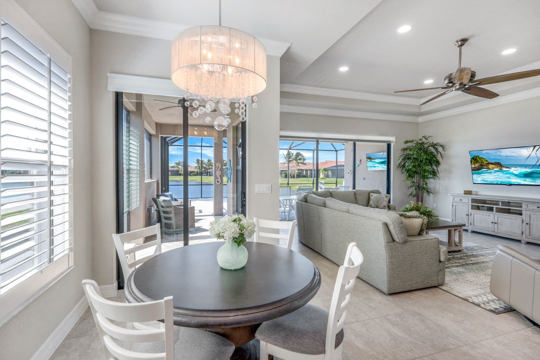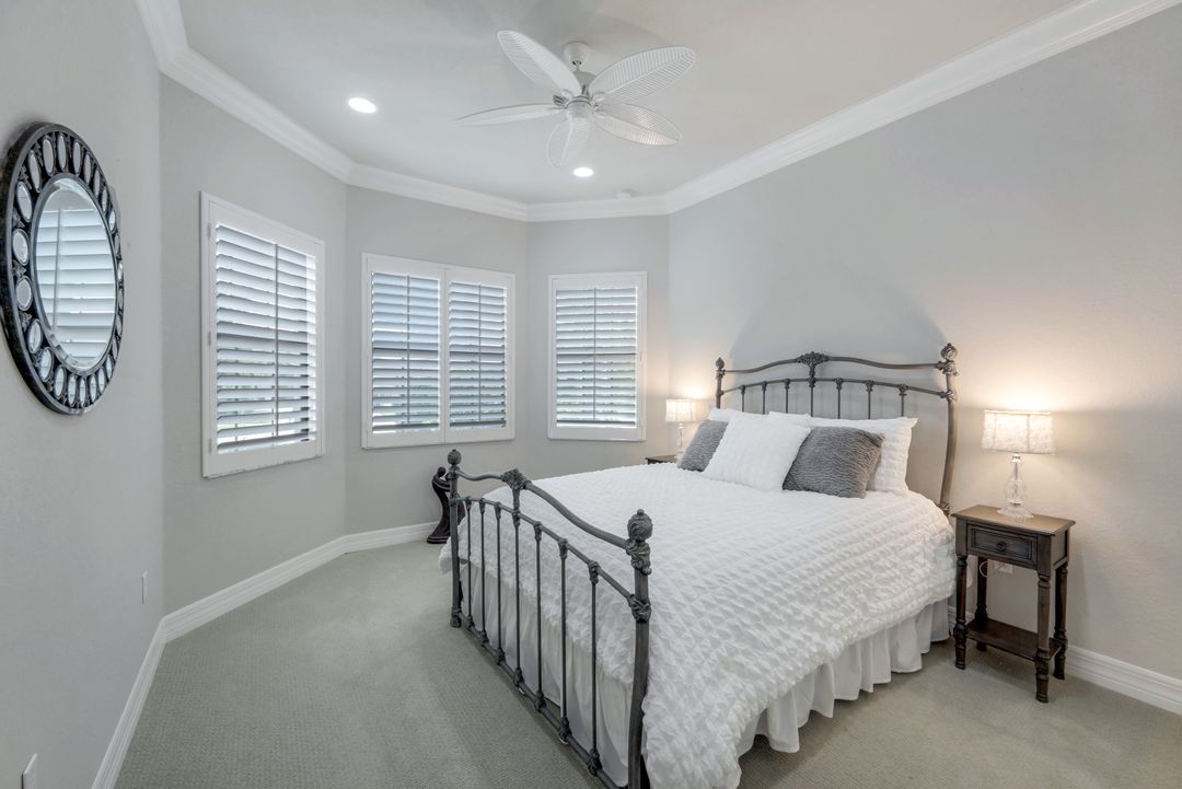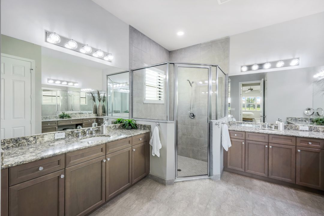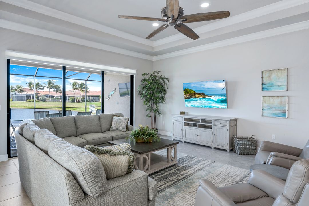 Upon opening the front door of this meticulously maintained Chandon floor plan home, you will be immediately captivated by the breathtaking western lake view. Whether you're unwinding or entertaining, the expanded screened lanai and “L” shaped covered patio offer the perfect setting—complete with ample space for dining and seating while you watch the stunning sunsets paint the sky. Outside, you'll also appreciate the extra space provided by the oversized, pie-shaped lot. Inside, the open-concept design creates a bright, airy atmosphere. The spacious great room, formal and casual dining areas, and gourmet kitchen flow seamlessly together. The chef-inspired kitchen boasts level IV Chelsea Maple Winter cabinets, upgraded quartz countertops, stainless steel appliances (including a double oven and brand-new GE cooktop), a stylish tile backsplash, and ambient lighting. The thoughtfully designed split bedroom layout ensures privacy for the owners, with the luxurious primary suite offering serene lake views, two walk-in closets, and an ensuite bath that feels like a private spa retreat. The floor plan was modified to ensure that the three guest bedrooms are tucked away, providing extra privacy for visitors. This home is move-in ready, featuring plantation shutters throughout, crown molding, stylish lighting and fans, and closet organization systems in every room. With a new water heater, stunning quartz countertops, upgraded LG washer/dryer in laundry and solid wood doors throughout, every detail has been carefully considered. During storm season, rest easy knowing you can effortlessly close the electric hurricane shutters on the windows and activate the hurricane screens on the lanai at the push of a button. Riverstone offers a social, vacation-inspired lifestyle for all ages. Located in North Naples, minutes to I-75 & zoned for "A" rated schools. Recreation area includes a fitness center, social hall, resort style pool, lap pool, spa, 5 lighted tennis courts, outdoor basketball/pickleball, full indoor basketball court, tot lot, children's water play area & game room & an activities coordinator. Don’t miss your chance to experience the Southwest Florida lifestyle you’ve been dreaming of. Paradise is waiting for you!