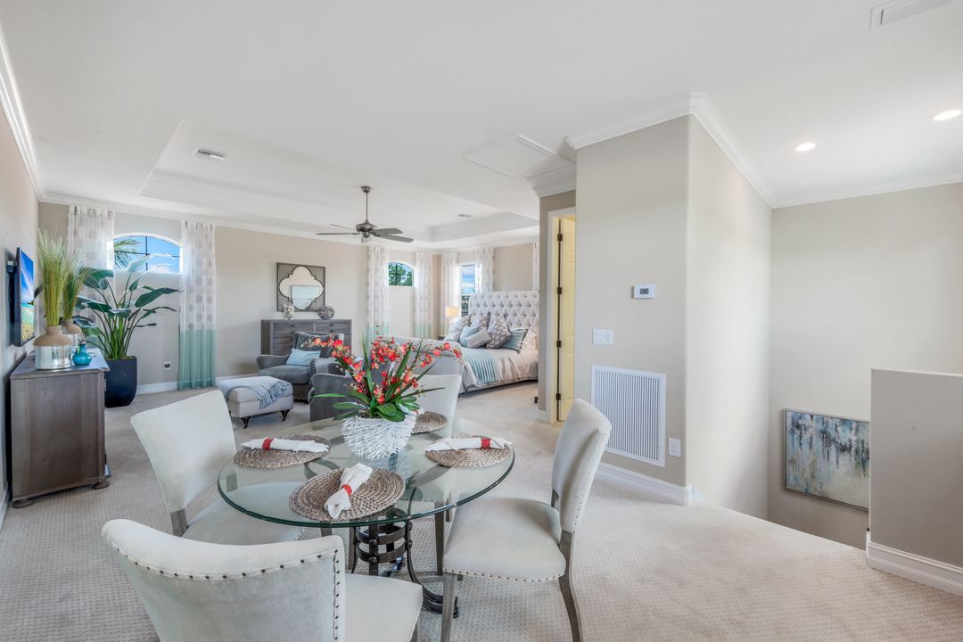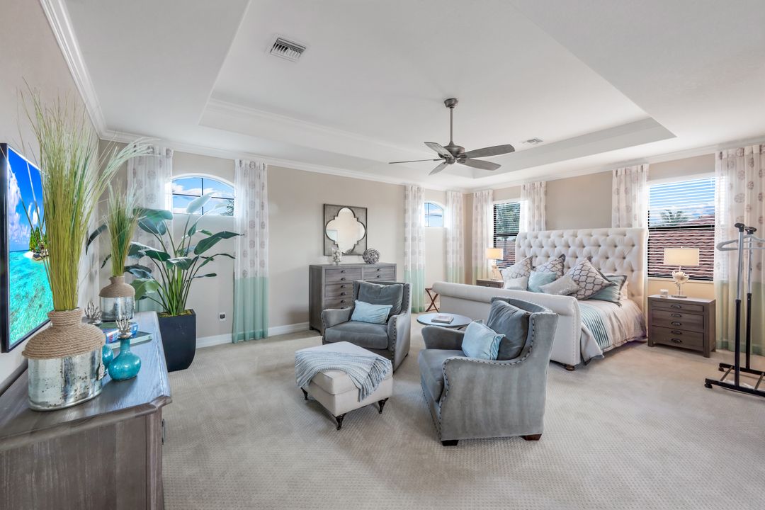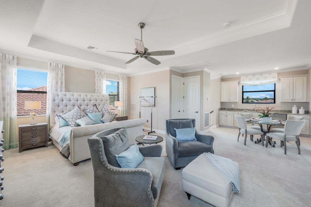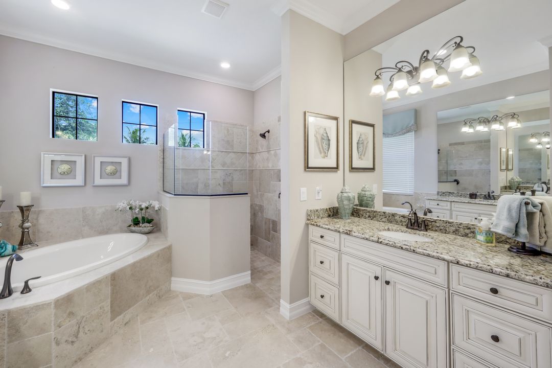 The luxurious primary suite includes a private entrance to a screened lanai, a cozy sitting area, and a walk-in closet. The spa-like primary bath offers a deep soaking tub, separate glass-enclosed shower, and dual vanities.