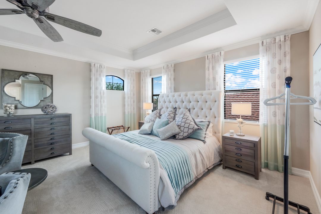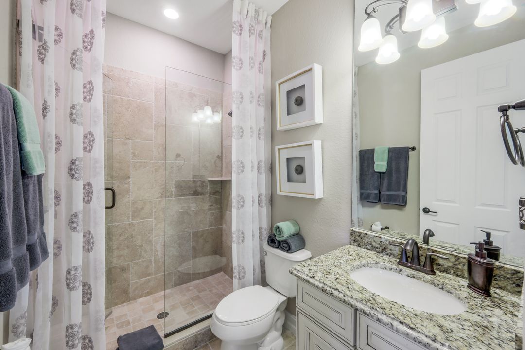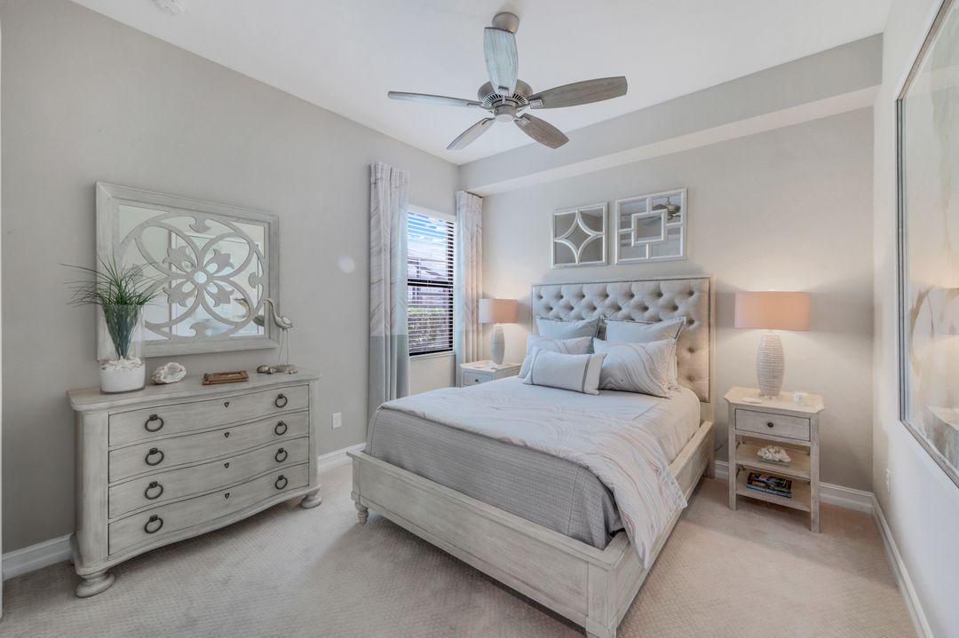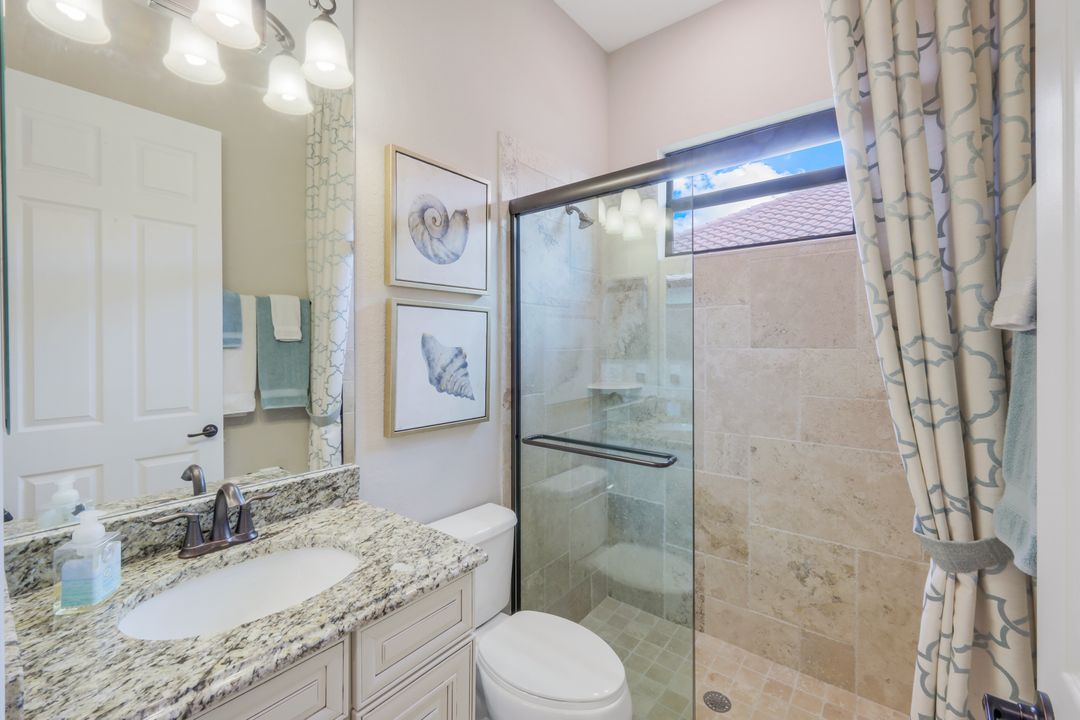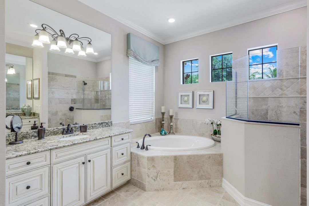 The luxurious primary suite includes a private entrance to a screened lanai, a cozy sitting area, and a walk-in closet. The spa-like primary bath offers a deep soaking tub, separate glass-enclosed shower, and dual vanities.
