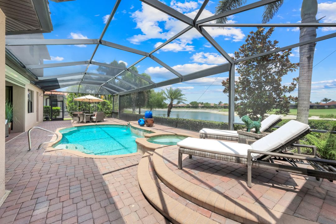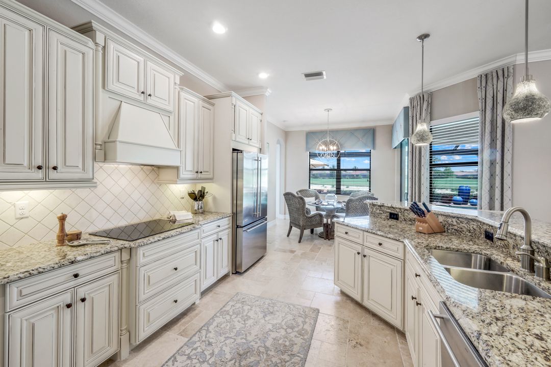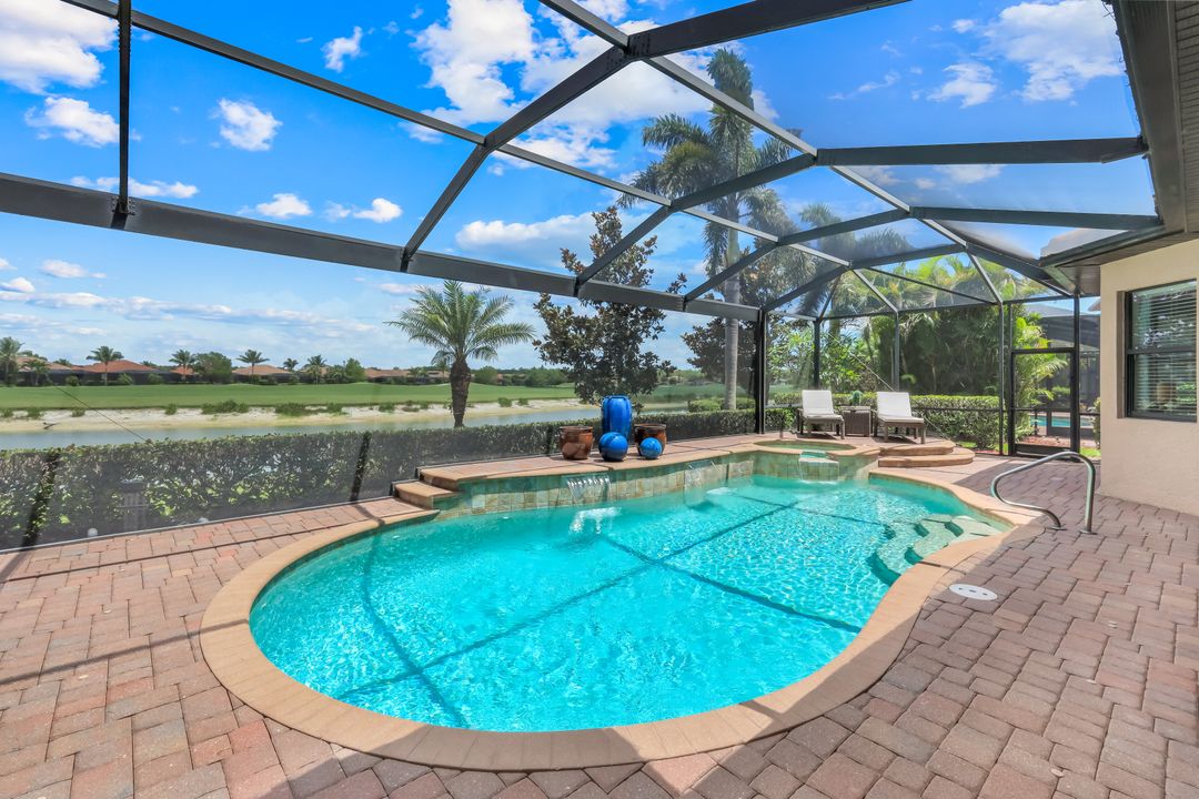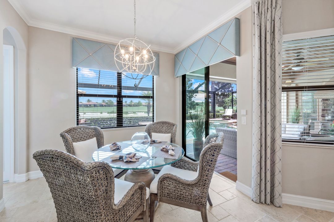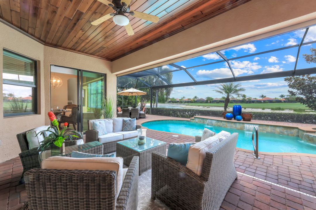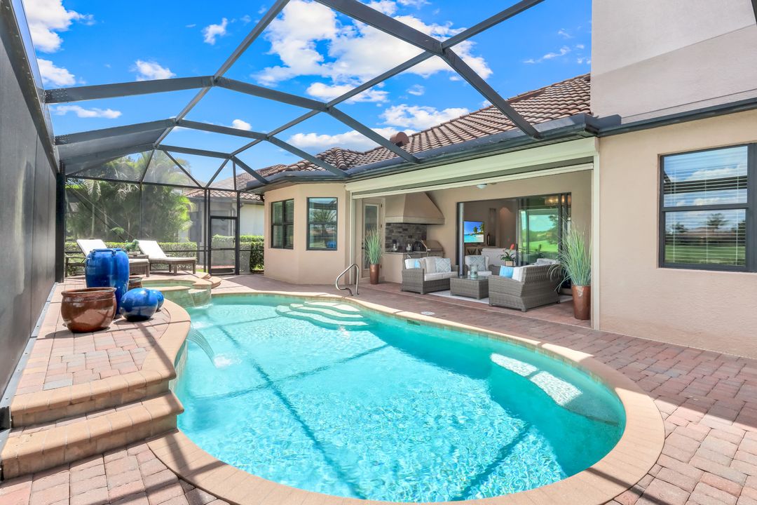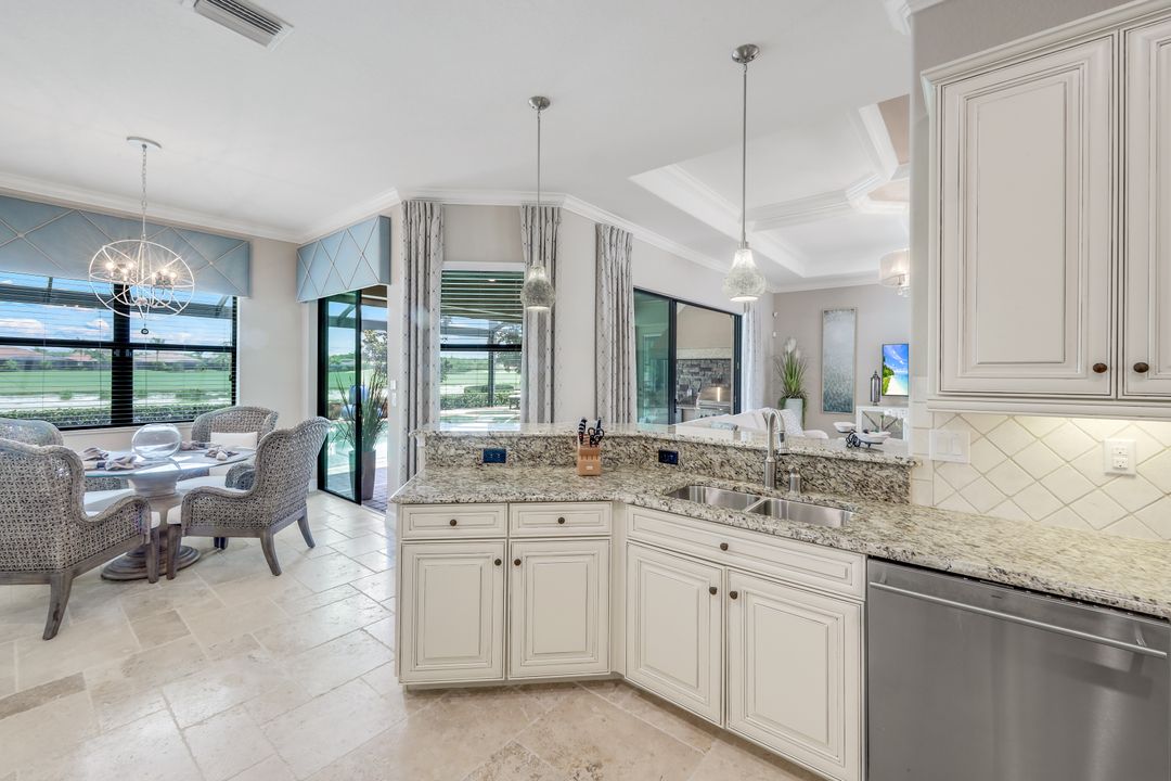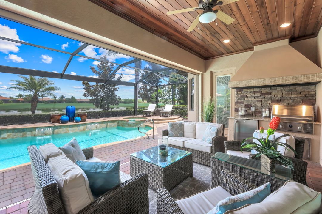 The gourmet kitchen features a spacious peninsula and a charming breakfast nook. The screened lanai features an outdoor kitchen, surrounded by a stunning pool and spa with unobstructed views of the lake and golf course.