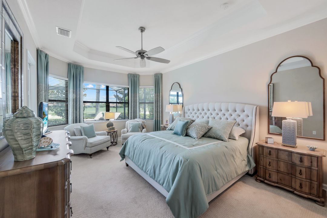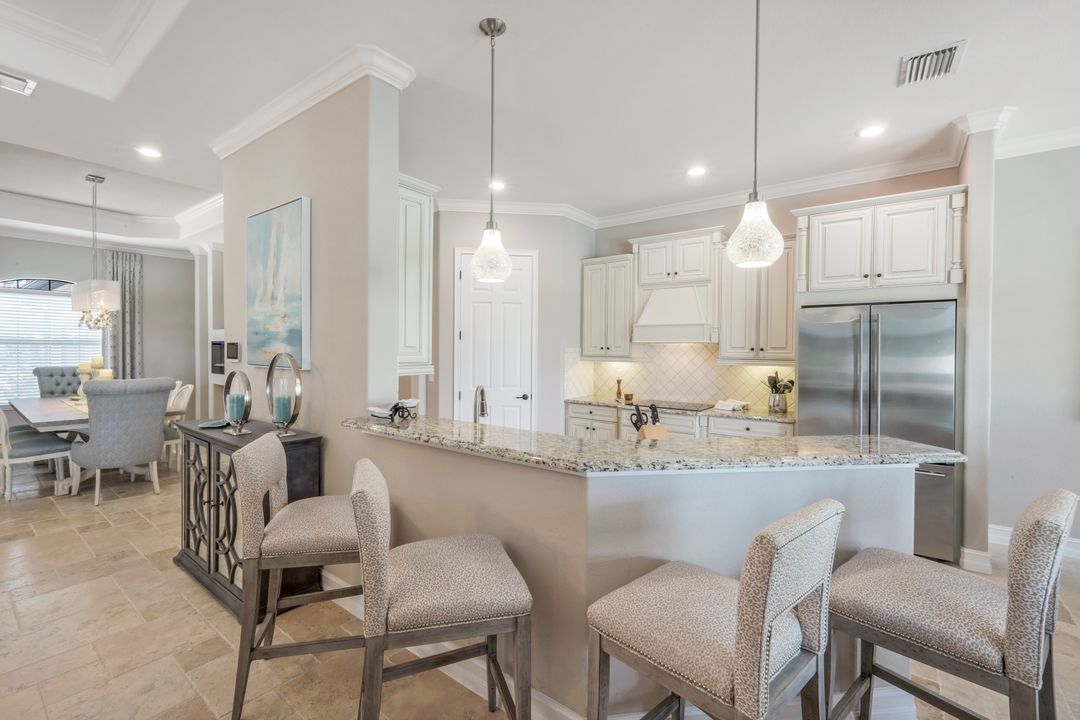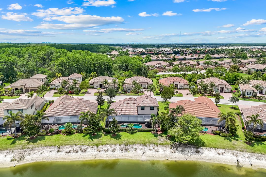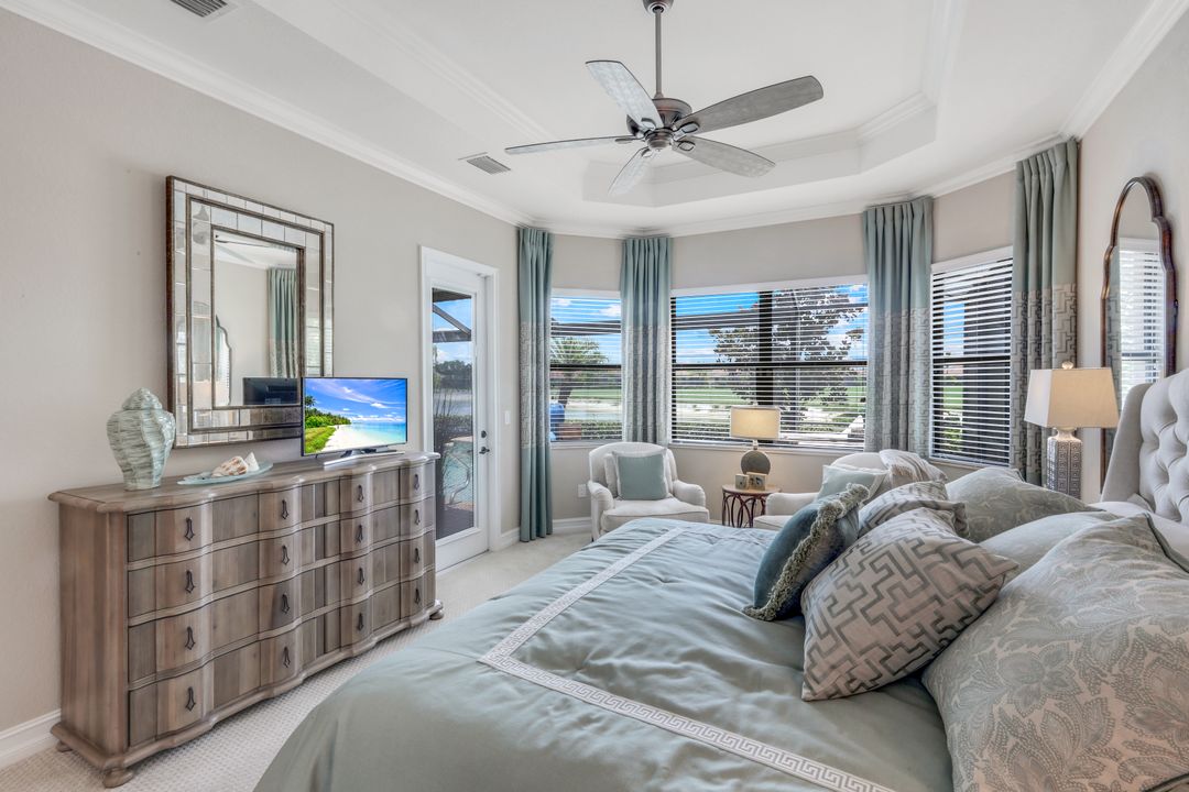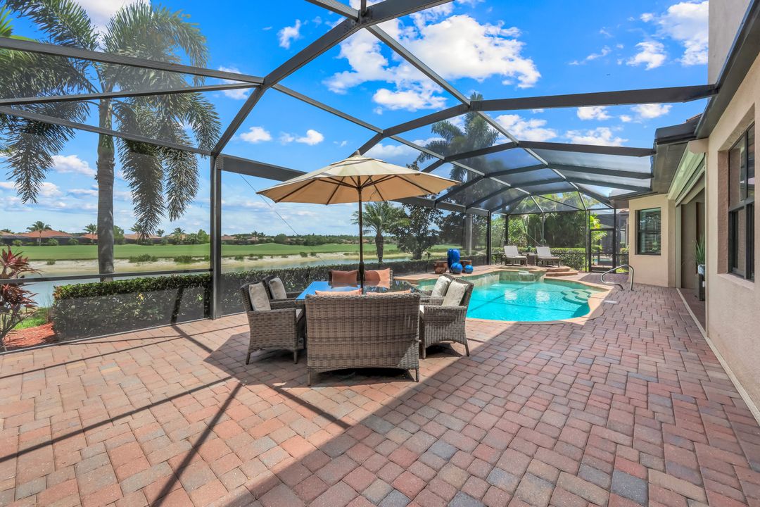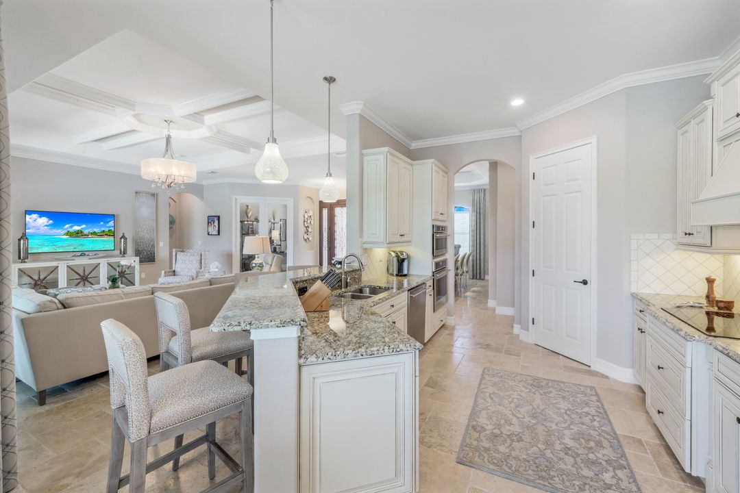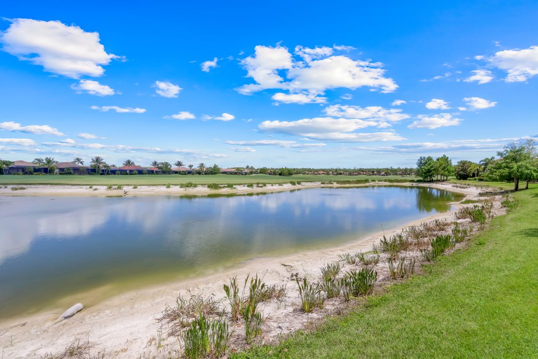The gourmet kitchen features a spacious peninsula and a charming breakfast nook. The screened lanai features an outdoor kitchen, surrounded by a stunning pool and spa with unobstructed views of the lake and golf course.