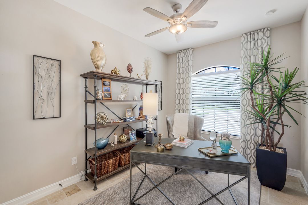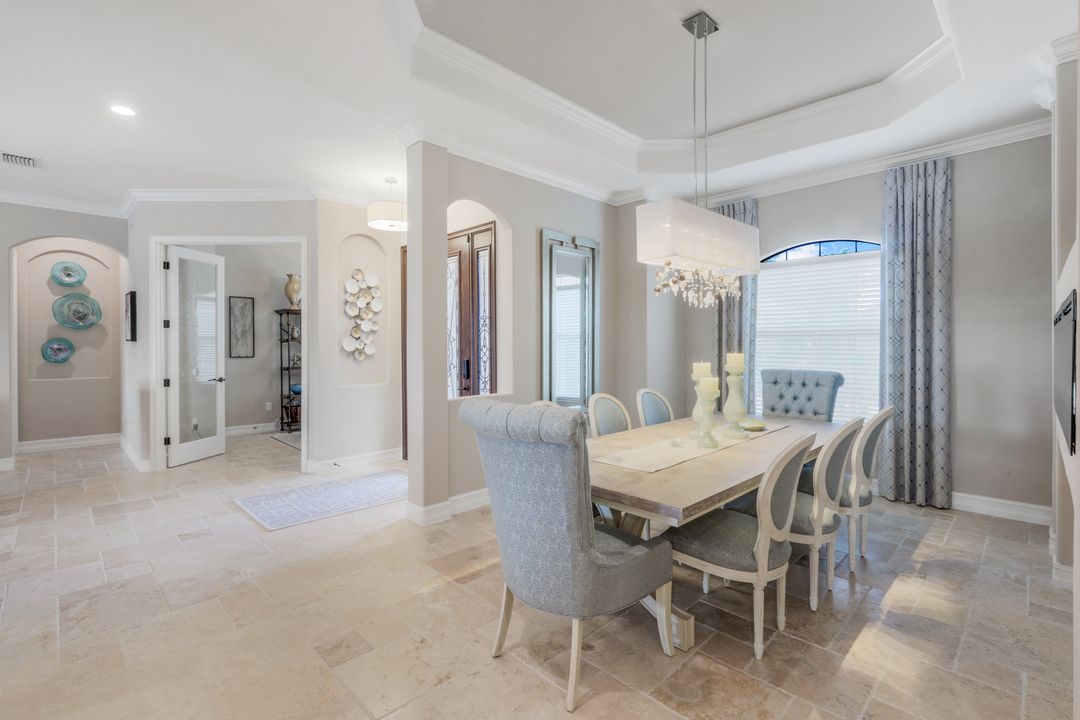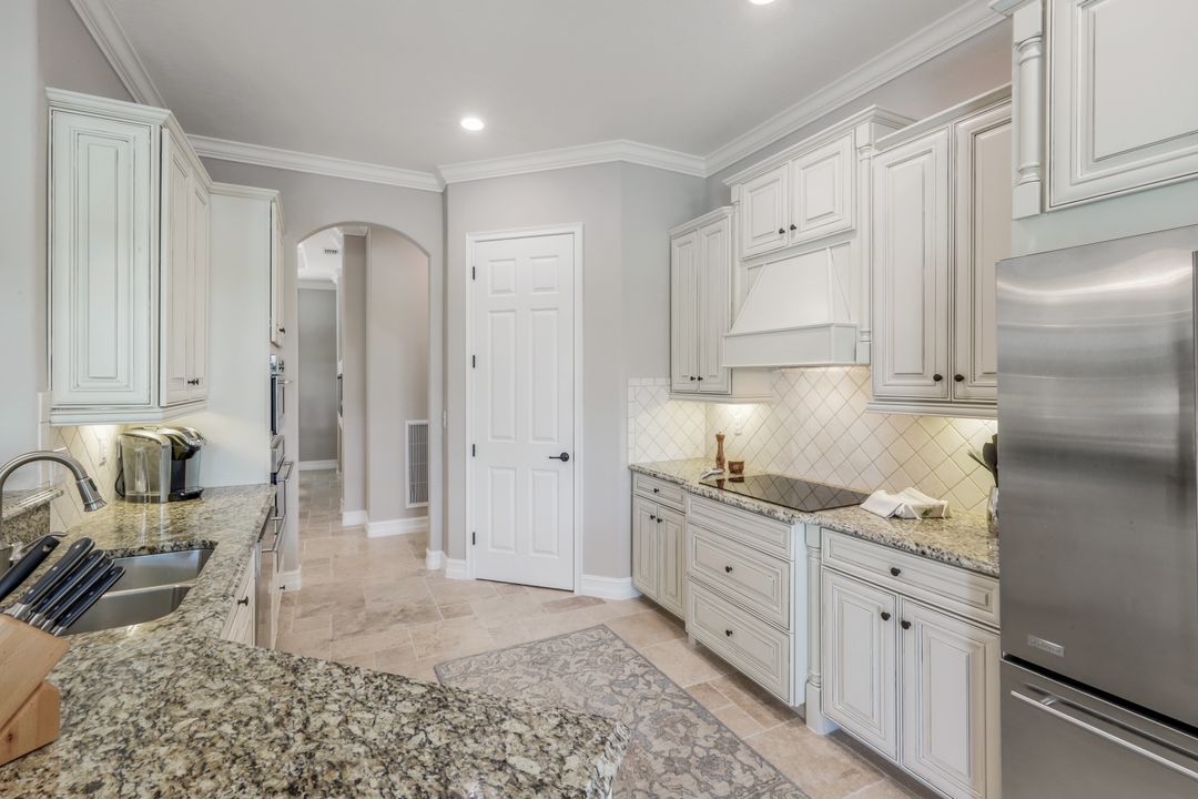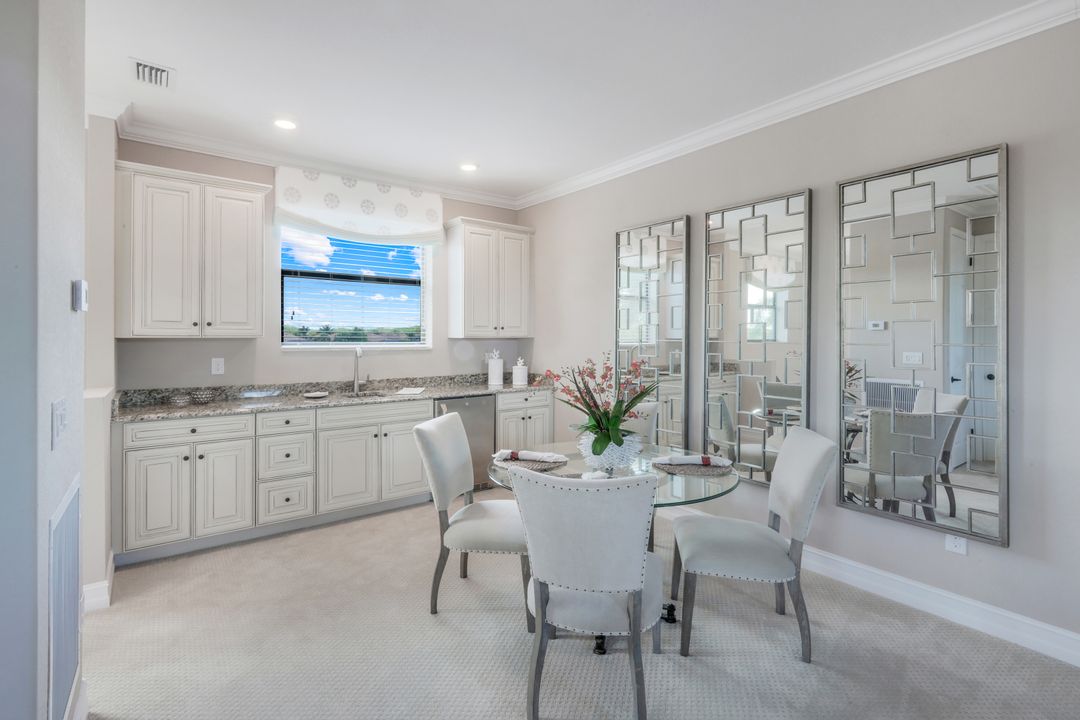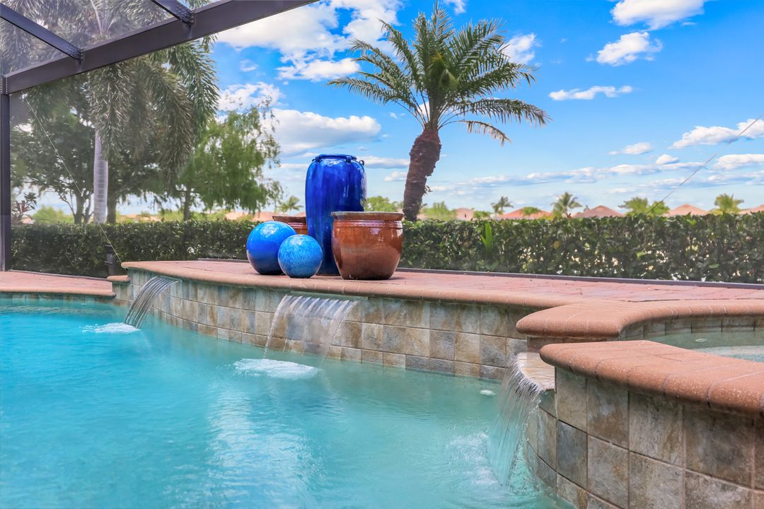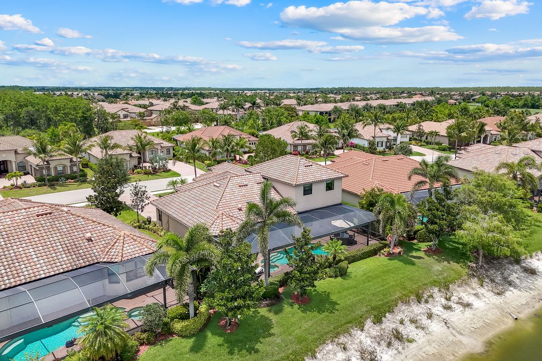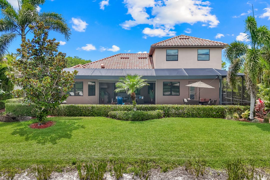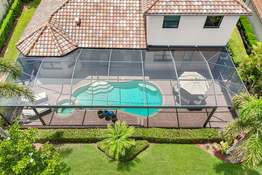 The gourmet kitchen features a spacious peninsula and a charming breakfast nook. The screened lanai features an outdoor kitchen, surrounded by a stunning pool and spa with unobstructed views of the lake and golf course.