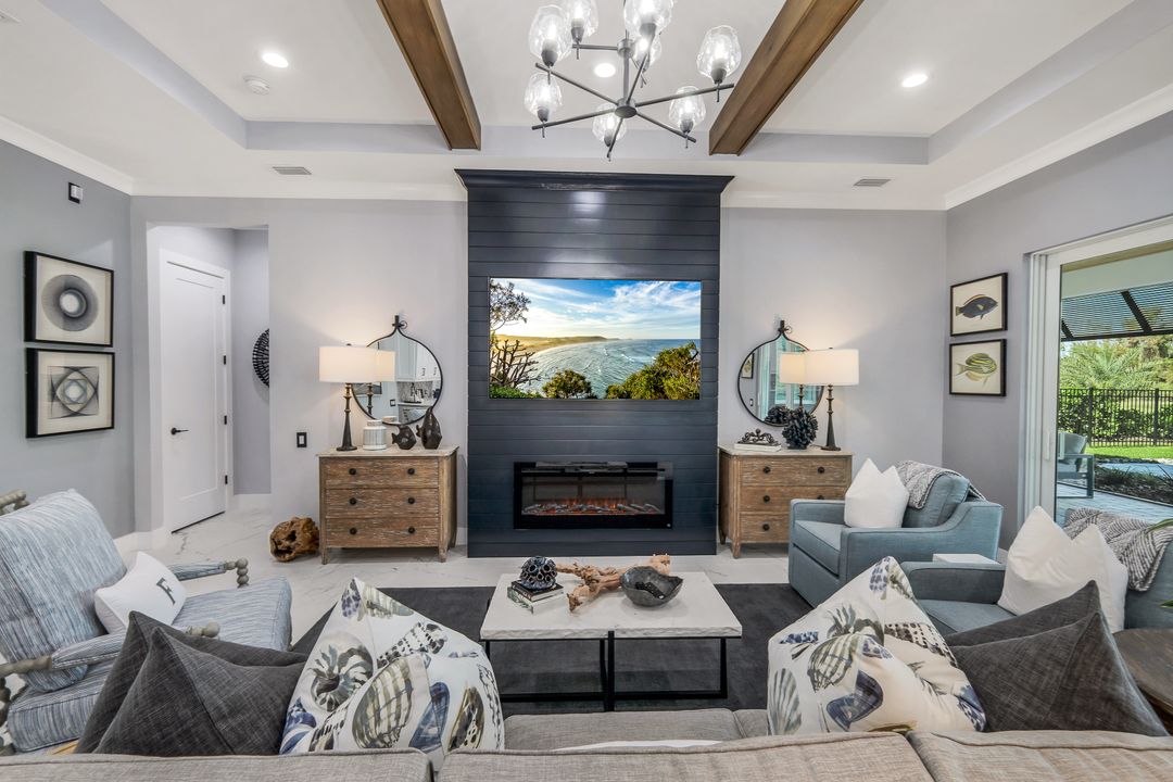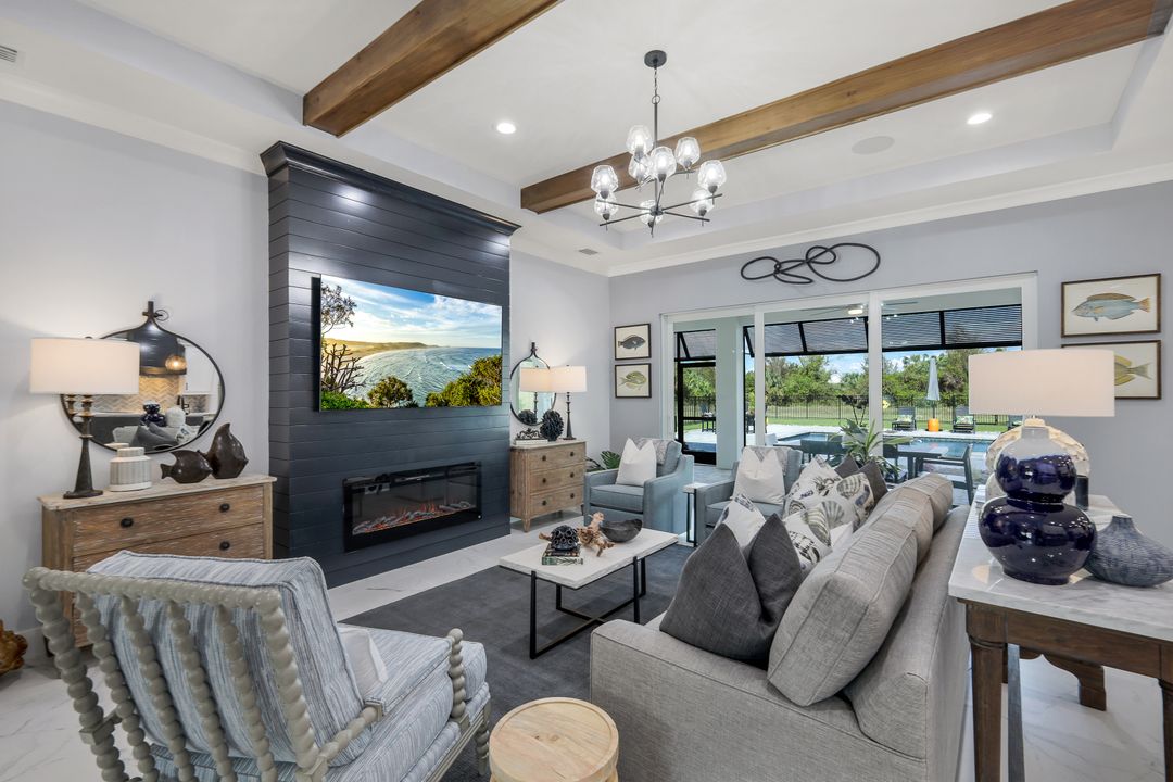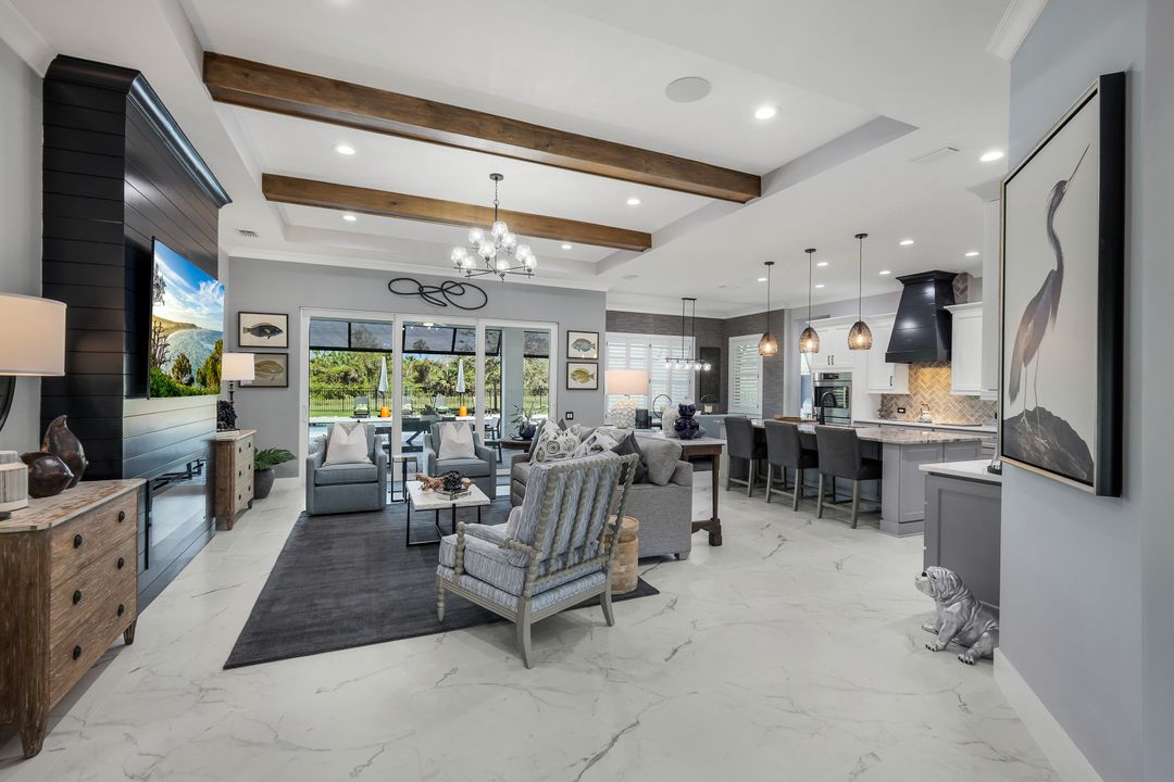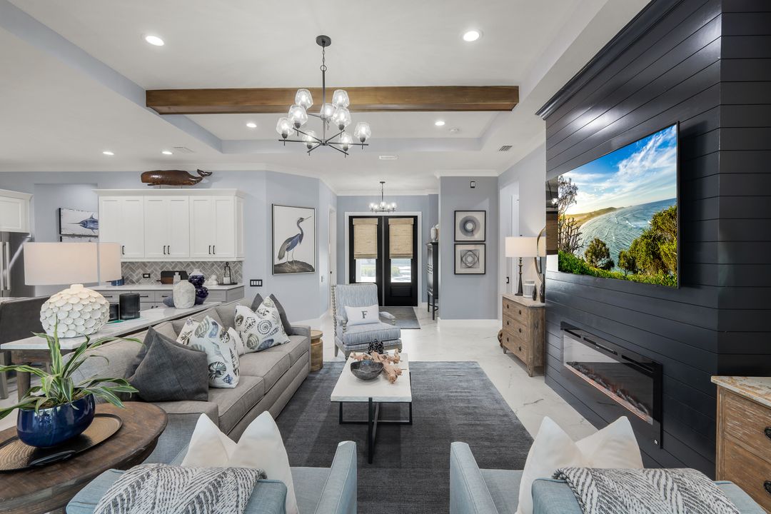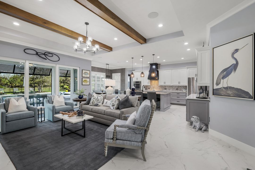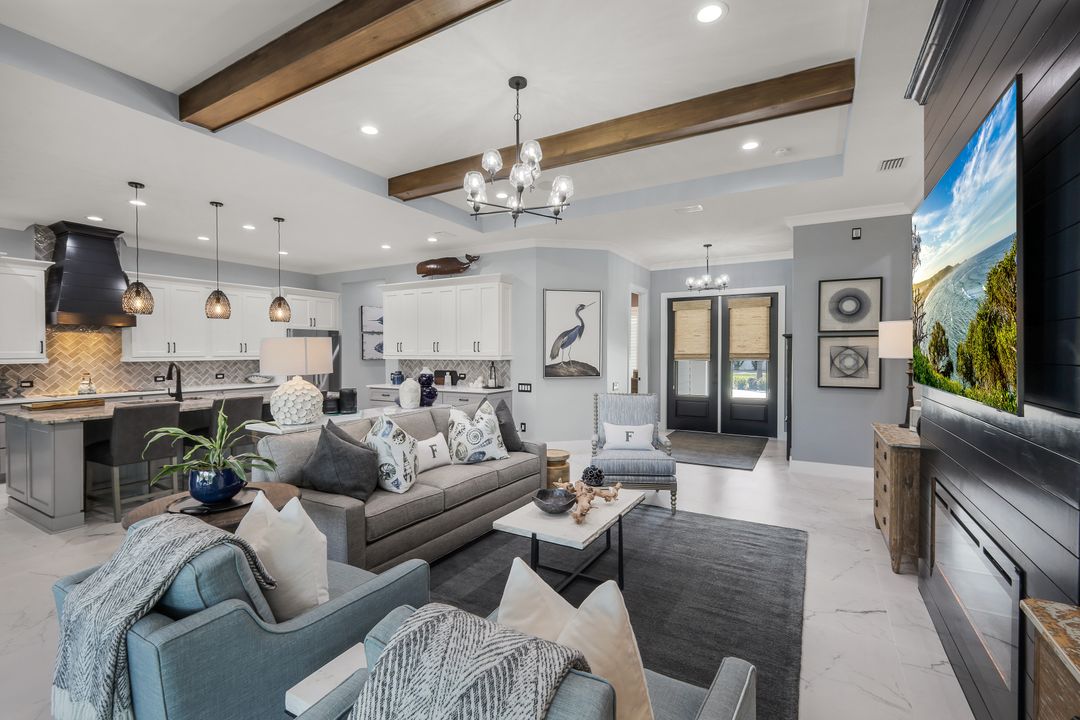 From the moment you enter, you’ll notice the careful attention to detail. All-impact doors and windows open into a bright, open interior featuring beautiful tile flooring and a stunning custom fireplace wall that serves as the heart of the great room. Above, custom wood beams span the ceiling, adding warmth and character to the space. Throughout the home, designer light fixtures, elegant trim work, and custom cabinetry elevate each room with style and function. Plus, abundant closet and storage space in every room makes organizing a breeze, adding a layer of practicality to the luxurious design.