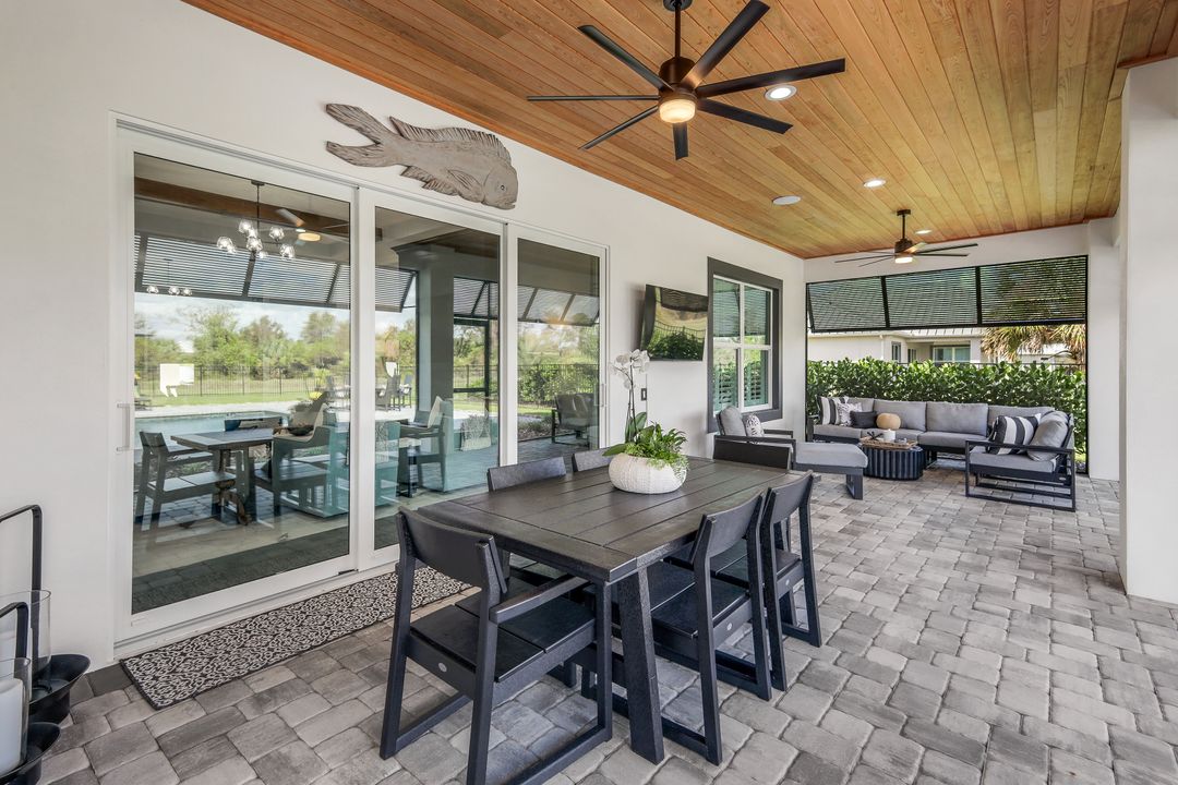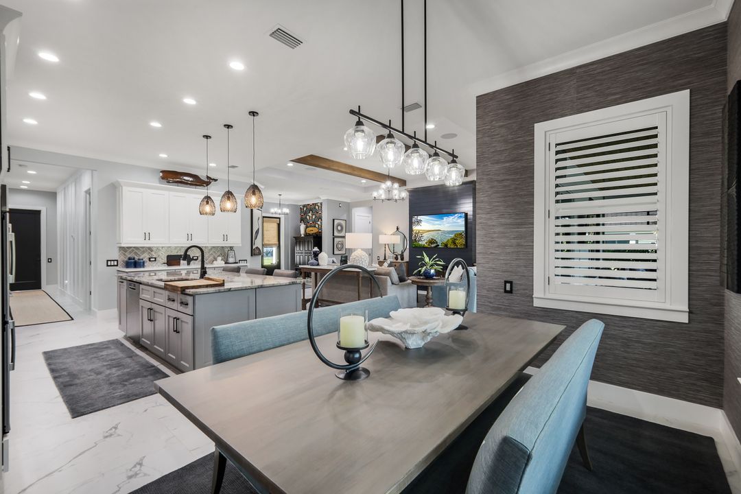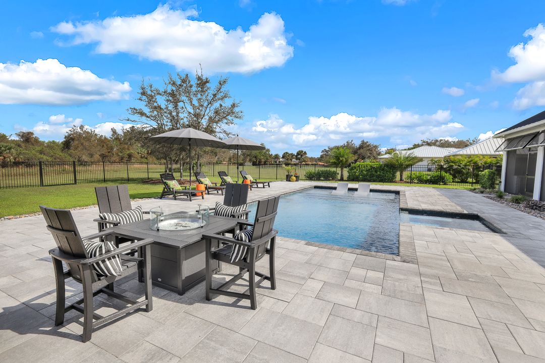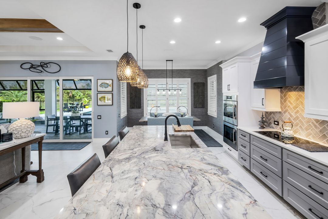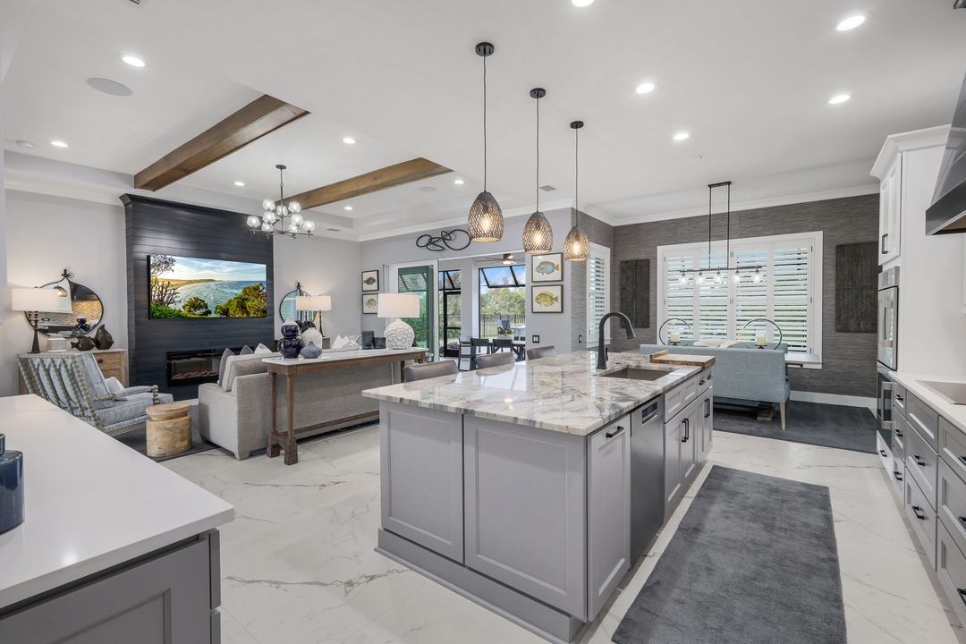 From the moment you enter, you’ll notice the careful attention to detail. All-impact doors and windows open into a bright, open interior featuring beautiful tile flooring and a stunning custom fireplace wall that serves as the heart of the great room. Above, custom wood beams span the ceiling, adding warmth and character to the space. Throughout the home, designer light fixtures, elegant trim work, and custom cabinetry elevate each room with style and function. Plus, abundant closet and storage space in every room makes organizing a breeze, adding a layer of practicality to the luxurious design.