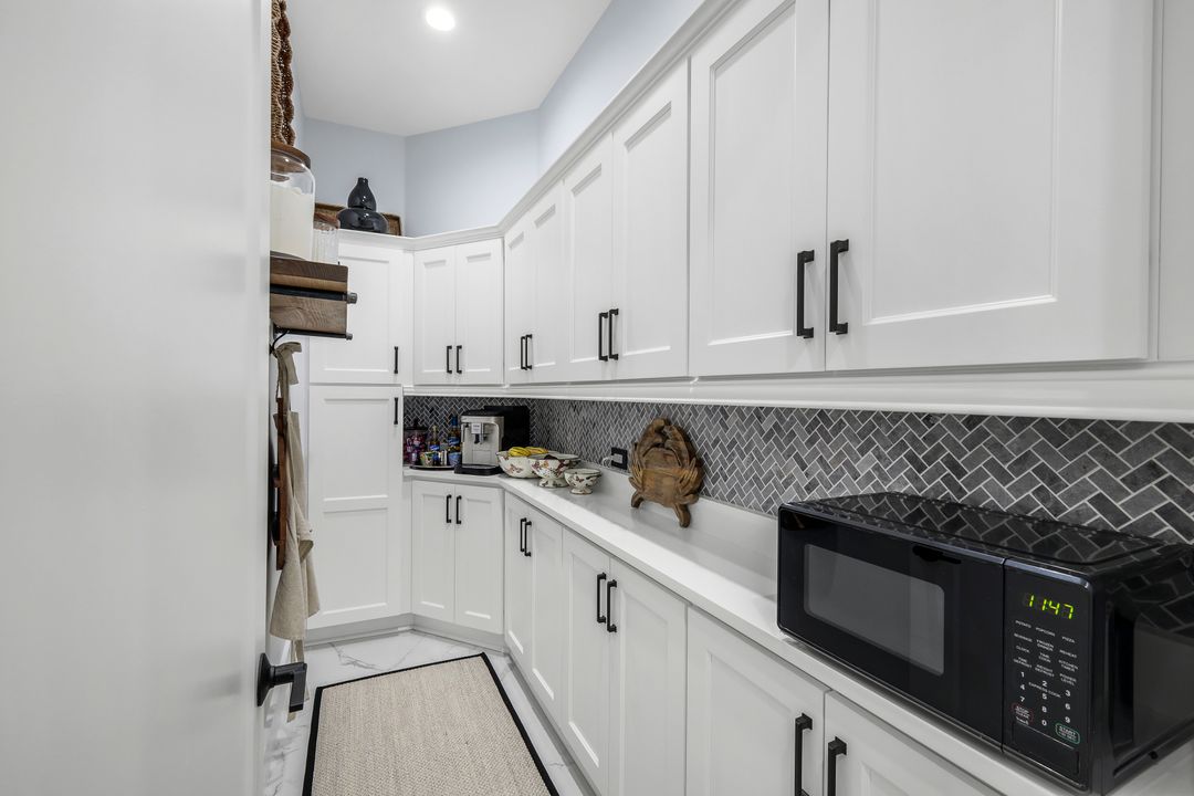 The kitchen is a true chef’s delight, designed with high-end Bosch appliances, a spacious granite island, and ample custom cabinetry. A large walk-in pantry with built-in cabinetry provides even more storage, making the kitchen as practical as it is beautiful. It is perfect for large gatherings and everyday convenience.