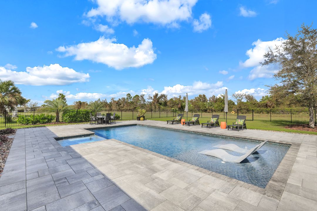 Step outside, and you’ll find a backyard that feels like your own private resort. The large, screened-in lanai is equipped with an outdoor kitchen complete with a Saber grill, pizza oven, sink, refrigerator, custom tile, and granite countertops—a space that’s ready to host gatherings of all sizes. Just beyond, a saltwater pool sparkles under the sun, fully controlled by Wi-Fi, and surrounded by an extensive paver patio where you can lounge, entertain, or simply enjoy the serene views. New landscaping and a fully fenced yard offer privacy, and the finishing touch—a tongue-and-groove Cypress wood ceiling on both the front porch and lanai—brings a sense of classic charm to these outdoor spaces.