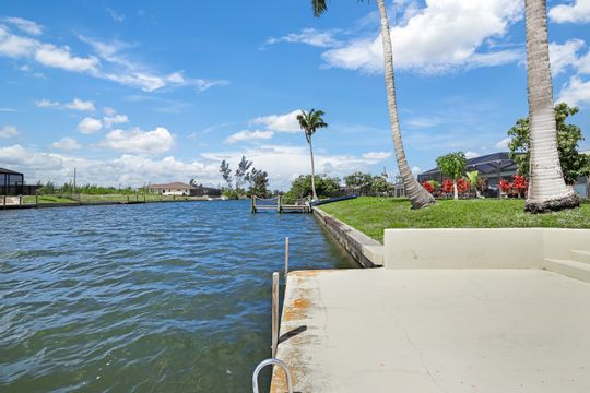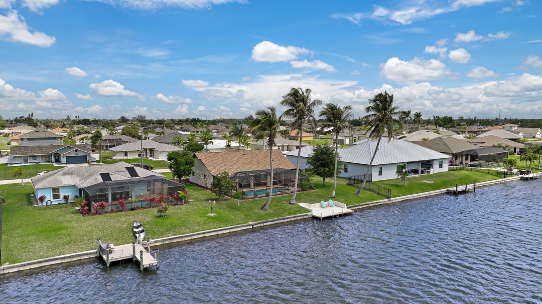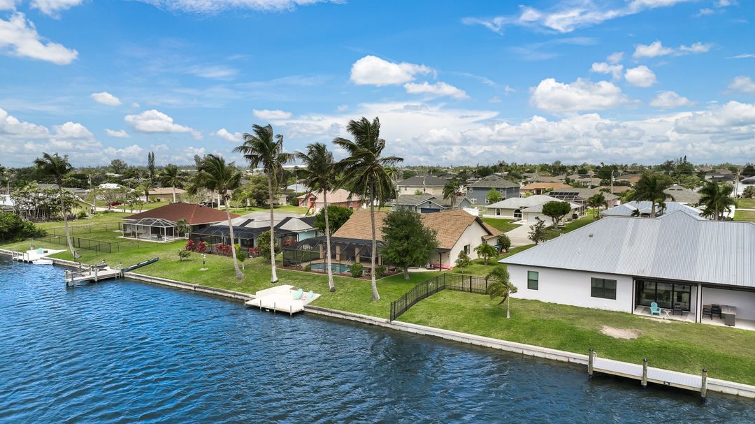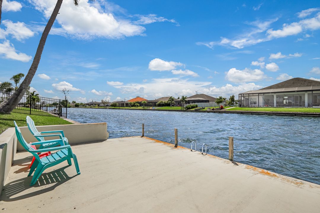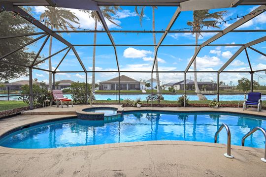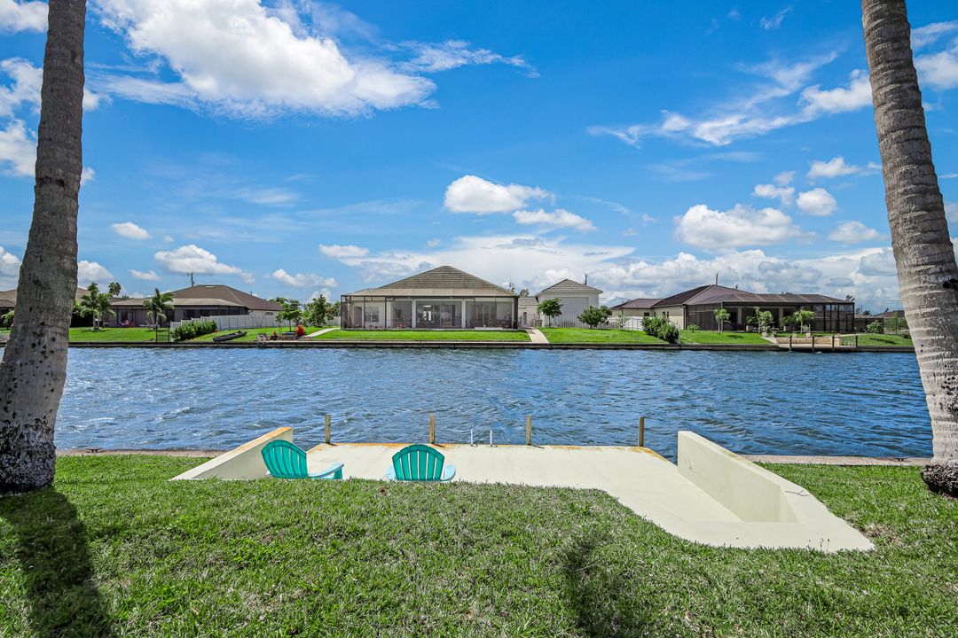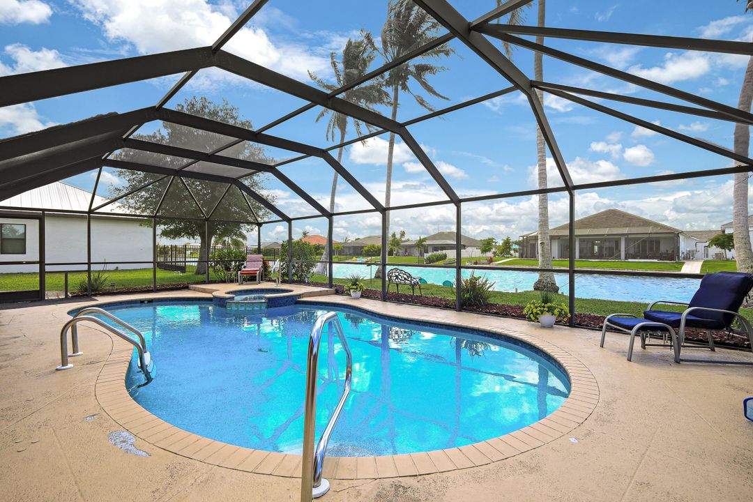 Southern Exposure, wide water views and access to Chain of Lakes offering miles and miles of fresh water fun for ALL! This stunning property is situated overlooking 120 foot Escapade Canal ensuring WIDE WATER VIEWS throughout! Featuring 1818 sqft under air, 3 bedroom, plus den, 2 bathrooms and a 2 car garage. Step inside to discover a haven of comfort and style. Natural light pours in through the new skylight, highlighting the tile and acacia flooring that flows throughout the home. High ceilings create an airy ambiance in the split-bedroom layout, offering privacy and space for all occupants. Updated fans and light fixtures add a touch of contemporary flair to every room. The den provides a versatile space for work or relaxation, while inside laundry with shelving adds convenience to your daily routine. At the heart of the home is the kitchen and dining area designed for family gatherings. Features include granite counters, stainless steel appliances, and espresso cabinets which combine style with functionality, while a breakfast bar and breakfast nook offer casual dining options. A pantry provides ample storage space, while a glass mosaic backsplash adds a pop of color and sophistication to the space. Retreat to the luxurious master suite featuring crown molding, a vaulted ceilings, and shaker vanity. Dual sinks and exotic granite countertops offer a spa-like experience in the ensuite bathroom, complete with a large walk-in shower for ultimate relaxation. Outdoor live is what SWFL is all about and this home will not disappoint. Step onto the painted deck overlooking the sparkling blue pool and spa, perfect for relaxing or entertaining guests. The lanai features a custom bar area with granite counters invites gatherings and cocktails under the Florida sun. NOTEWORTHY: New Roof 2023, AC 2018, city water and sewer, Flood Zone X! Perfect for families, vacationers, 2nd home, part time or full time! Enjoy everything that SW FL has to offer - boat, sail, kayak, SUP, jet ski, fish or simply take a dip in your private oasis! See 3D tour, features list