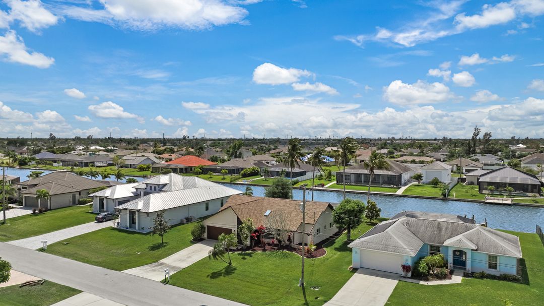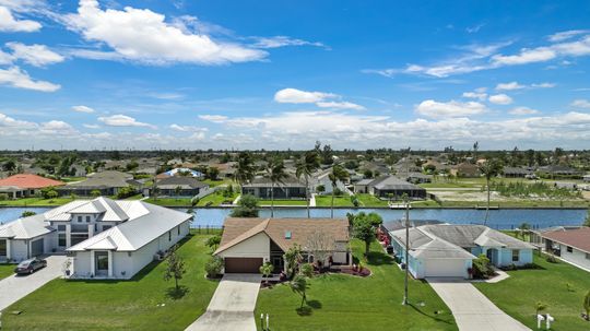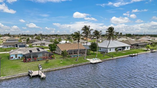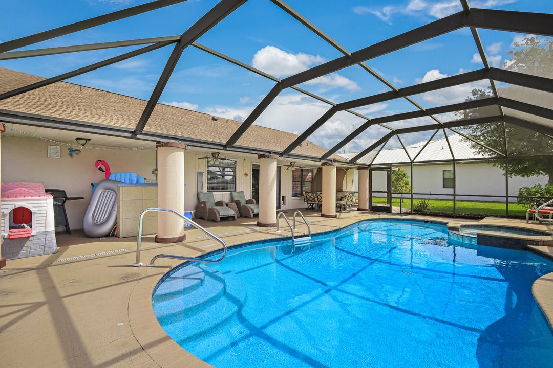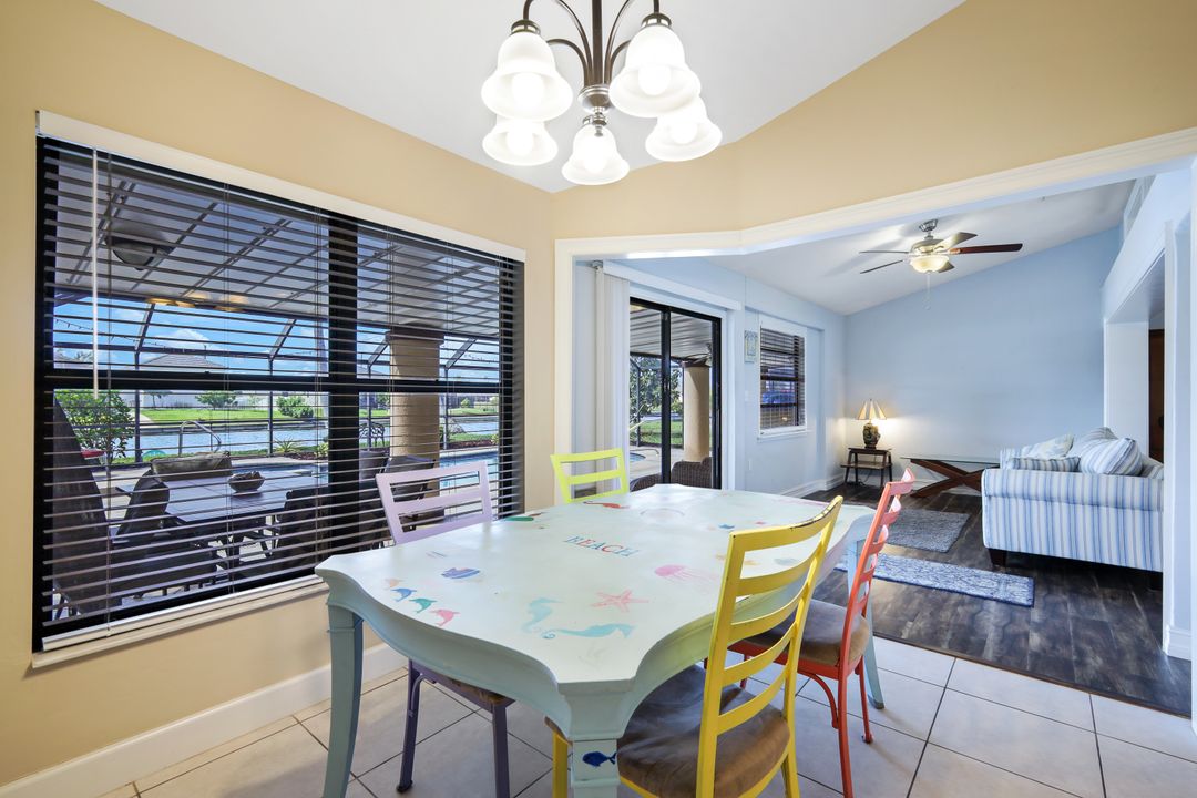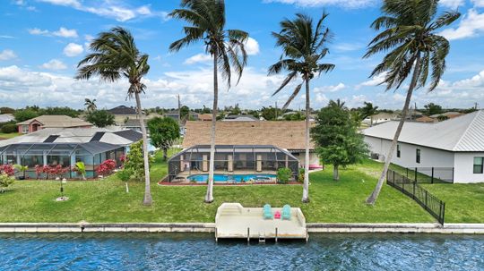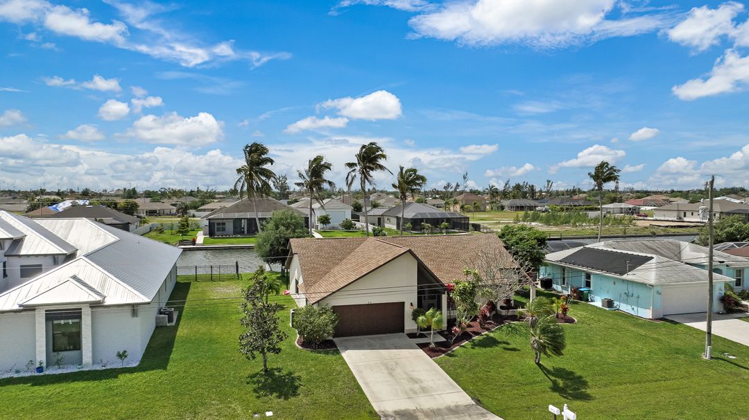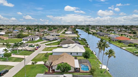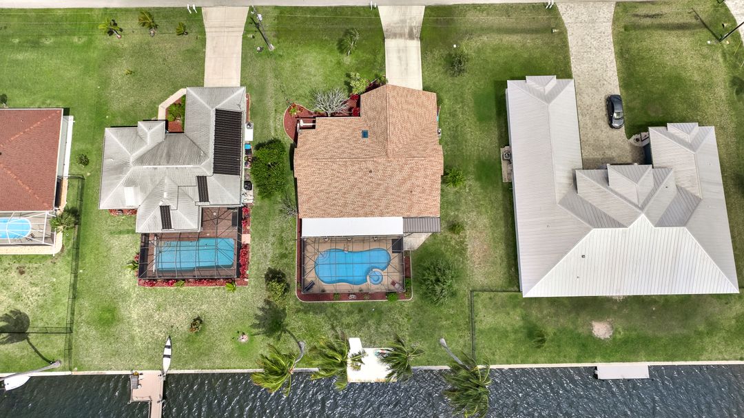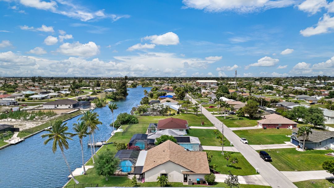 Southern Exposure, wide water views and access to Chain of Lakes offering miles and miles of fresh water fun for ALL! This stunning property is situated overlooking 120 foot Escapade Canal ensuring WIDE WATER VIEWS throughout! Featuring 1818 sqft under air, 3 bedroom, plus den, 2 bathrooms and a 2 car garage. Step inside to discover a haven of comfort and style. Natural light pours in through the new skylight, highlighting the tile and acacia flooring that flows throughout the home. High ceilings create an airy ambiance in the split-bedroom layout, offering privacy and space for all occupants. Updated fans and light fixtures add a touch of contemporary flair to every room. The den provides a versatile space for work or relaxation, while inside laundry with shelving adds convenience to your daily routine. At the heart of the home is the kitchen and dining area designed for family gatherings. Features include granite counters, stainless steel appliances, and espresso cabinets which combine style with functionality, while a breakfast bar and breakfast nook offer casual dining options. A pantry provides ample storage space, while a glass mosaic backsplash adds a pop of color and sophistication to the space. Retreat to the luxurious master suite featuring crown molding, a vaulted ceilings, and shaker vanity. Dual sinks and exotic granite countertops offer a spa-like experience in the ensuite bathroom, complete with a large walk-in shower for ultimate relaxation. Outdoor live is what SWFL is all about and this home will not disappoint. Step onto the painted deck overlooking the sparkling blue pool and spa, perfect for relaxing or entertaining guests. The lanai features a custom bar area with granite counters invites gatherings and cocktails under the Florida sun. NOTEWORTHY: New Roof 2023, AC 2018, city water and sewer, Flood Zone X! Perfect for families, vacationers, 2nd home, part time or full time! Enjoy everything that SW FL has to offer - boat, sail, kayak, SUP, jet ski, fish or simply take a dip in your private oasis! See 3D tour, features list