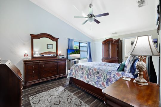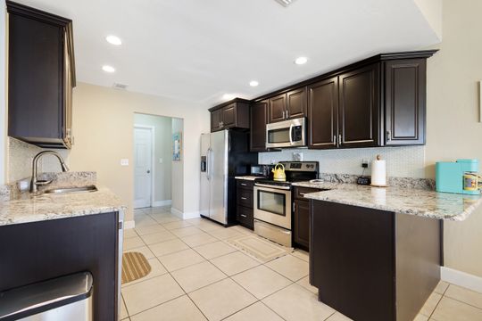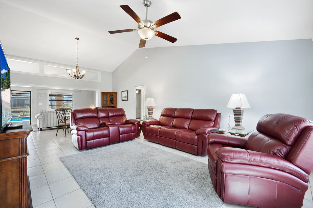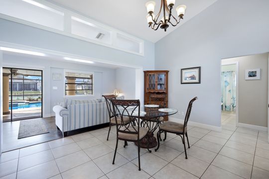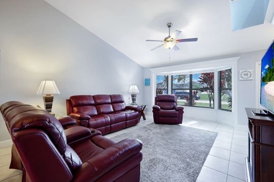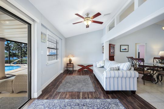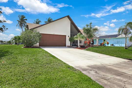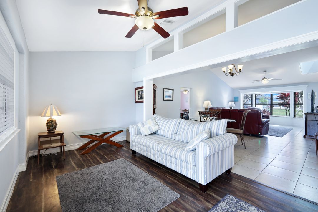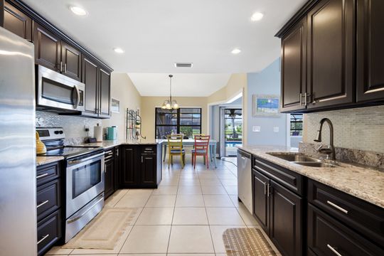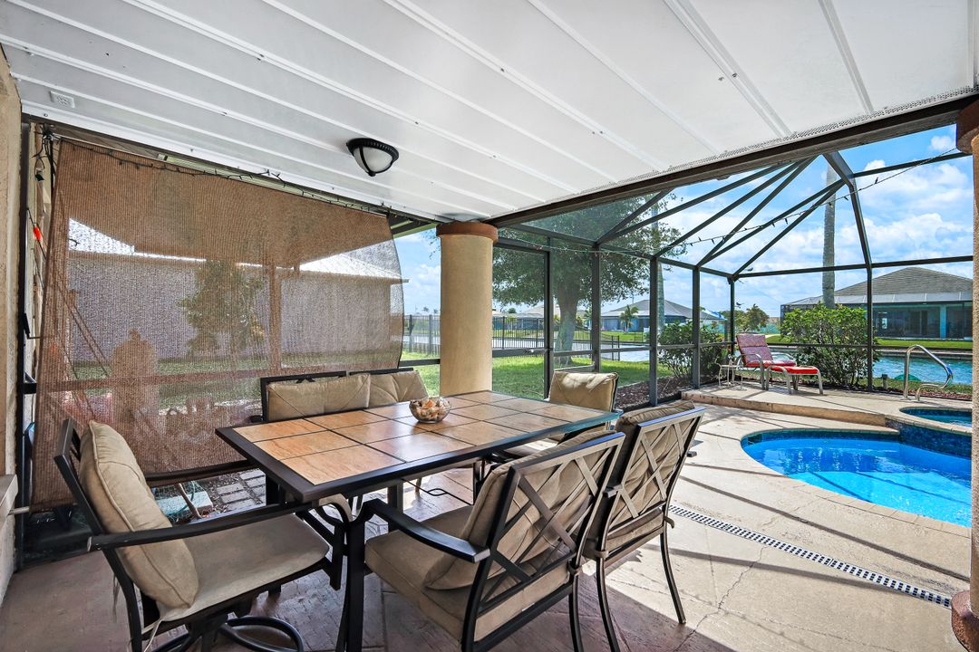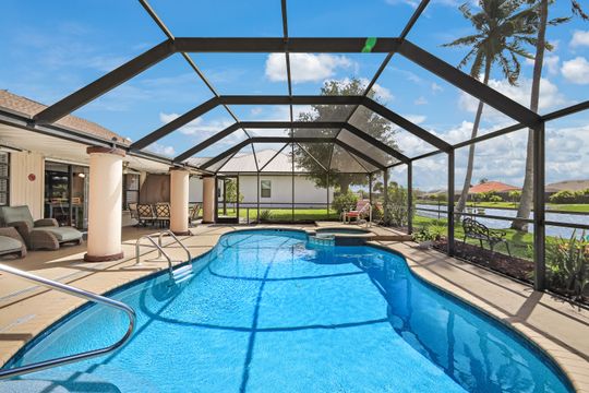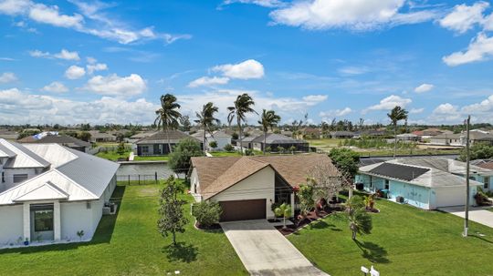 Southern Exposure, wide water views and access to Chain of Lakes offering miles and miles of fresh water fun for ALL! This stunning property is situated overlooking 120 foot Escapade Canal ensuring WIDE WATER VIEWS throughout! Featuring 1818 sqft under air, 3 bedroom, plus den, 2 bathrooms and a 2 car garage. Step inside to discover a haven of comfort and style. Natural light pours in through the new skylight, highlighting the tile and acacia flooring that flows throughout the home. High ceilings create an airy ambiance in the split-bedroom layout, offering privacy and space for all occupants. Updated fans and light fixtures add a touch of contemporary flair to every room. The den provides a versatile space for work or relaxation, while inside laundry with shelving adds convenience to your daily routine. At the heart of the home is the kitchen and dining area designed for family gatherings. Features include granite counters, stainless steel appliances, and espresso cabinets which combine style with functionality, while a breakfast bar and breakfast nook offer casual dining options. A pantry provides ample storage space, while a glass mosaic backsplash adds a pop of color and sophistication to the space. Retreat to the luxurious master suite featuring crown molding, a vaulted ceilings, and shaker vanity. Dual sinks and exotic granite countertops offer a spa-like experience in the ensuite bathroom, complete with a large walk-in shower for ultimate relaxation. Outdoor live is what SWFL is all about and this home will not disappoint. Step onto the painted deck overlooking the sparkling blue pool and spa, perfect for relaxing or entertaining guests. The lanai features a custom bar area with granite counters invites gatherings and cocktails under the Florida sun. NOTEWORTHY: New Roof 2023, AC 2018, city water and sewer, Flood Zone X! Perfect for families, vacationers, 2nd home, part time or full time! Enjoy everything that SW FL has to offer - boat, sail, kayak, SUP, jet ski, fish or simply take a dip in your private oasis! See 3D tour, features list