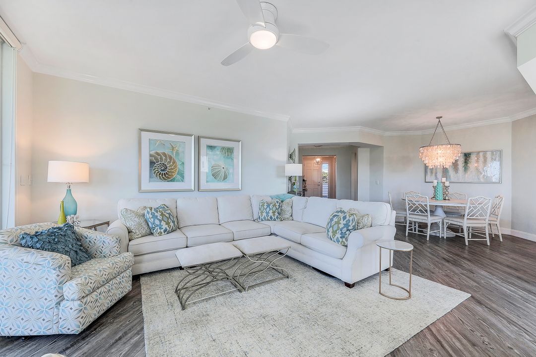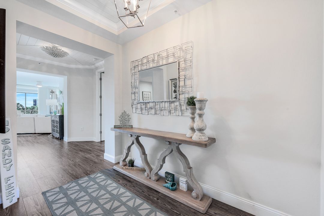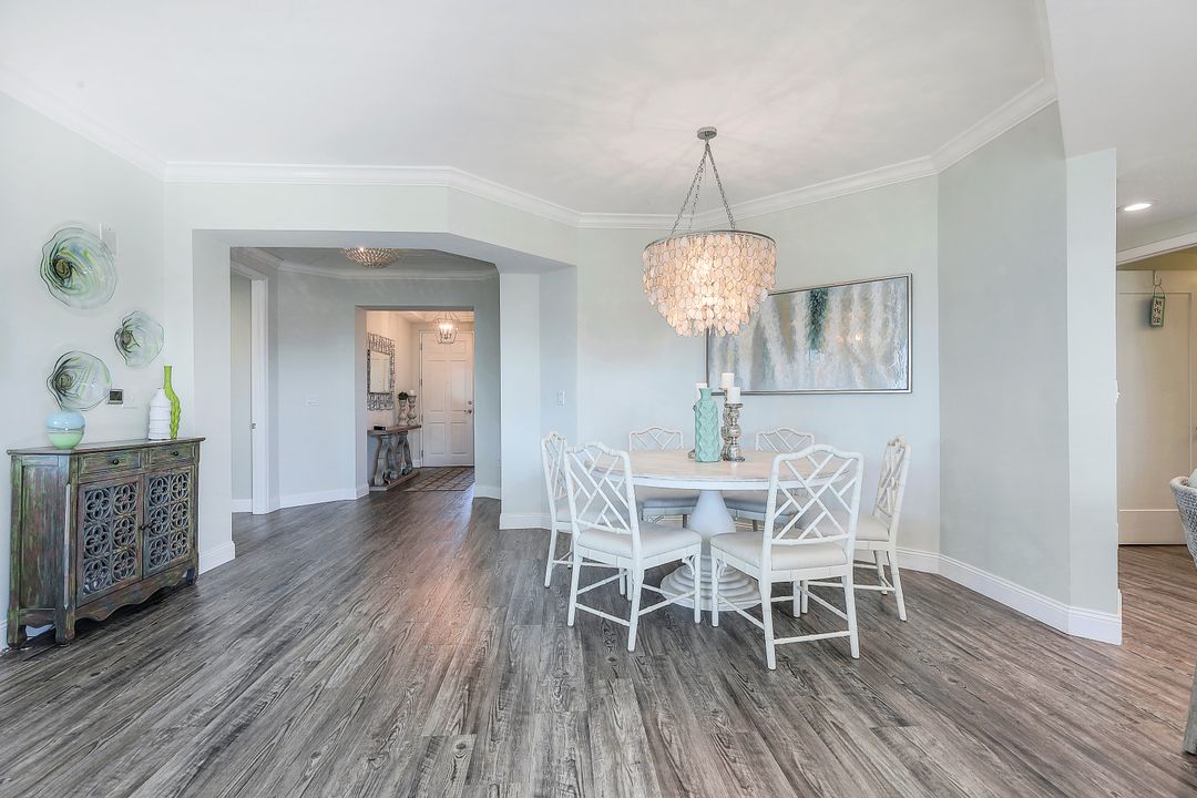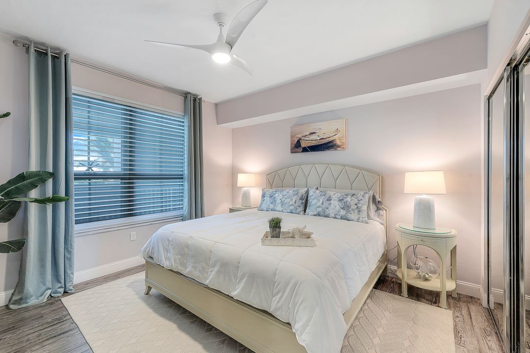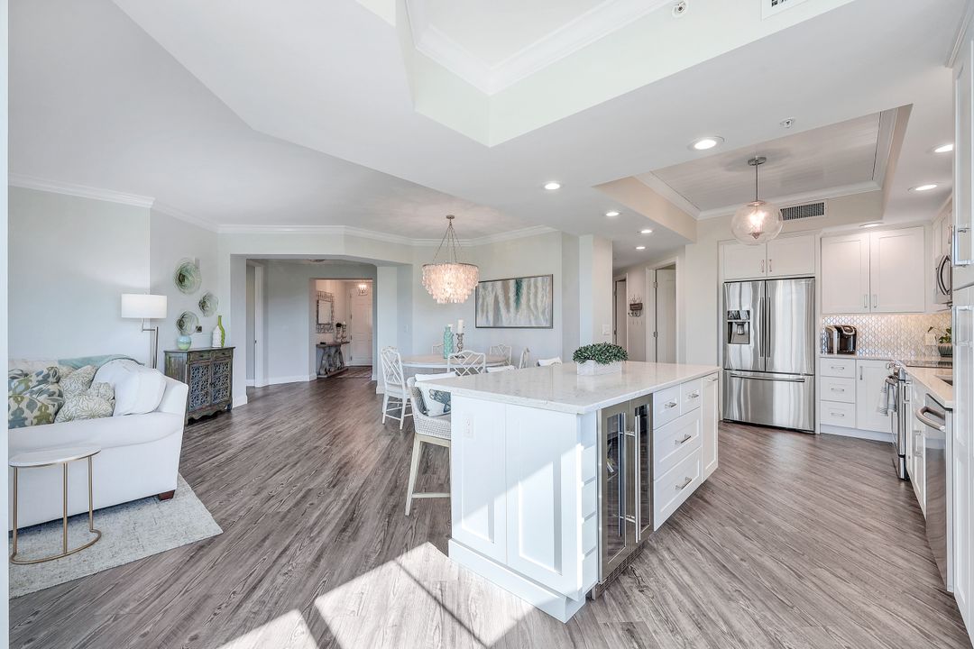 Beautiful renovation that radiates timeless coastal elegance. The light and bright open kitchen offers Shaker soft-close cabinetry by the acclaimed TNT Cabinetry of Naples, large center island with Quartz countertop, LED undermount lighting, and a Samsung appliance package with 10-yr warranty including a wine/beverage fridge in the island. The impressive upgrades include gorgeous designer lighting, Minka Aire ceiling fans, tongue and groove white ceiling planks with designer styled octagon coffered ceiling, high-end Hunter Douglas window treatment throughout, sophisticated Shaker style doors, beautiful and durable luxury vinyl plank CoreLuxe flooring with 5 1/2" baseboard and high-end silk carpet in the primary bedroom. Bathrooms feature Quartz vanity in guest bath and new custom glass shower doors. New in 2023 is a top tier Bryant HVAC and electric hurricane shutters on the lanai. The Dunes is a pet-friendly luxury community with amazing amenities! "The Club" offers upscale casual indoor/outdoor dining, a resort-style pool, wellness and fitness center, massage, physical therapy, expansive tennis program, pickleball, billiards, ping pong and shuffleboard.