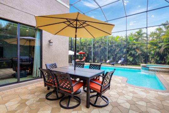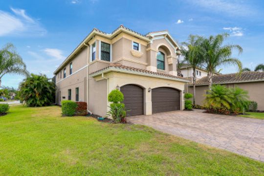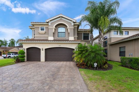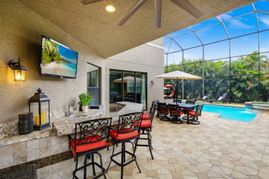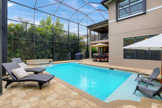 Built in 2014, this spacious "Shiraz" is situated on a private, oversized corner lot. You will enjoy entertaining family and friends around the custom heated pool/spa/sunshelf with two story cage along with outdoor bar complete with sink and refrigerator. With 5 Bedrooms (all with ensuite baths), Den, plus a Loft, there is room for the whole family. The second floor master suite features a private balcony overlooking the pool area, oversized his & her closets, and his & her separate bathrooms. Long list of upgrades include oversized diagonal tile floors, custom molding details, whole house water softener, marble elevation upgrade, upgraded paver driveway, and more. Riverstone offers an amazing clubhouse, which features a Resort Style Pool, Lap Pool, Hot Tub, Kiddie Water Park, Outdoor Party Pavilion, Tennis Courts, Tot Lot, A/C Indoor Sports Court, Soccer Field, Social Rooms, Billiards Room, Dance Studio, & more! Riverstone is conveniently located just 2 min from I75, 15 min to the Beach, and 20 min to 5th Ave/Coconut Point/RSW Airport.